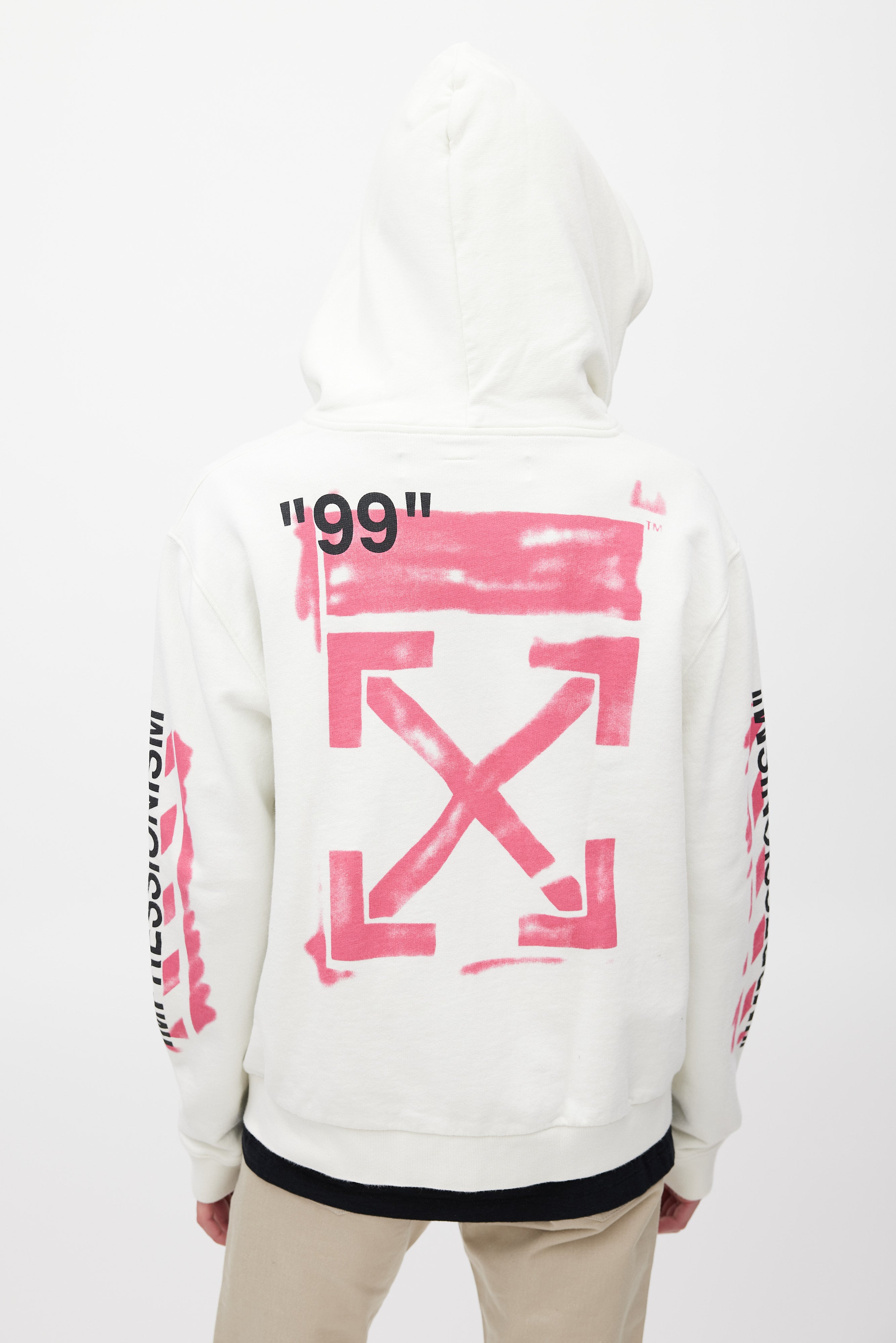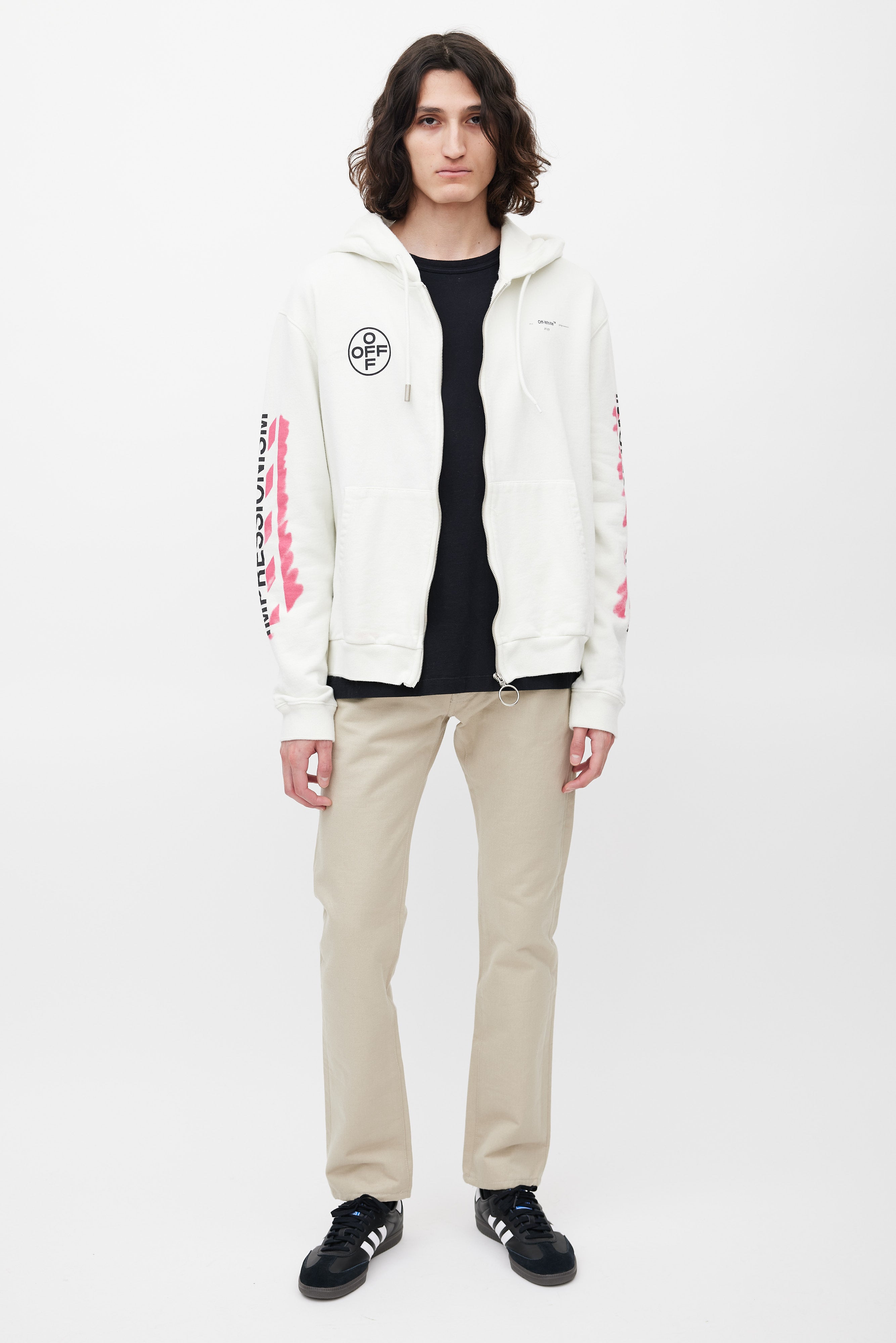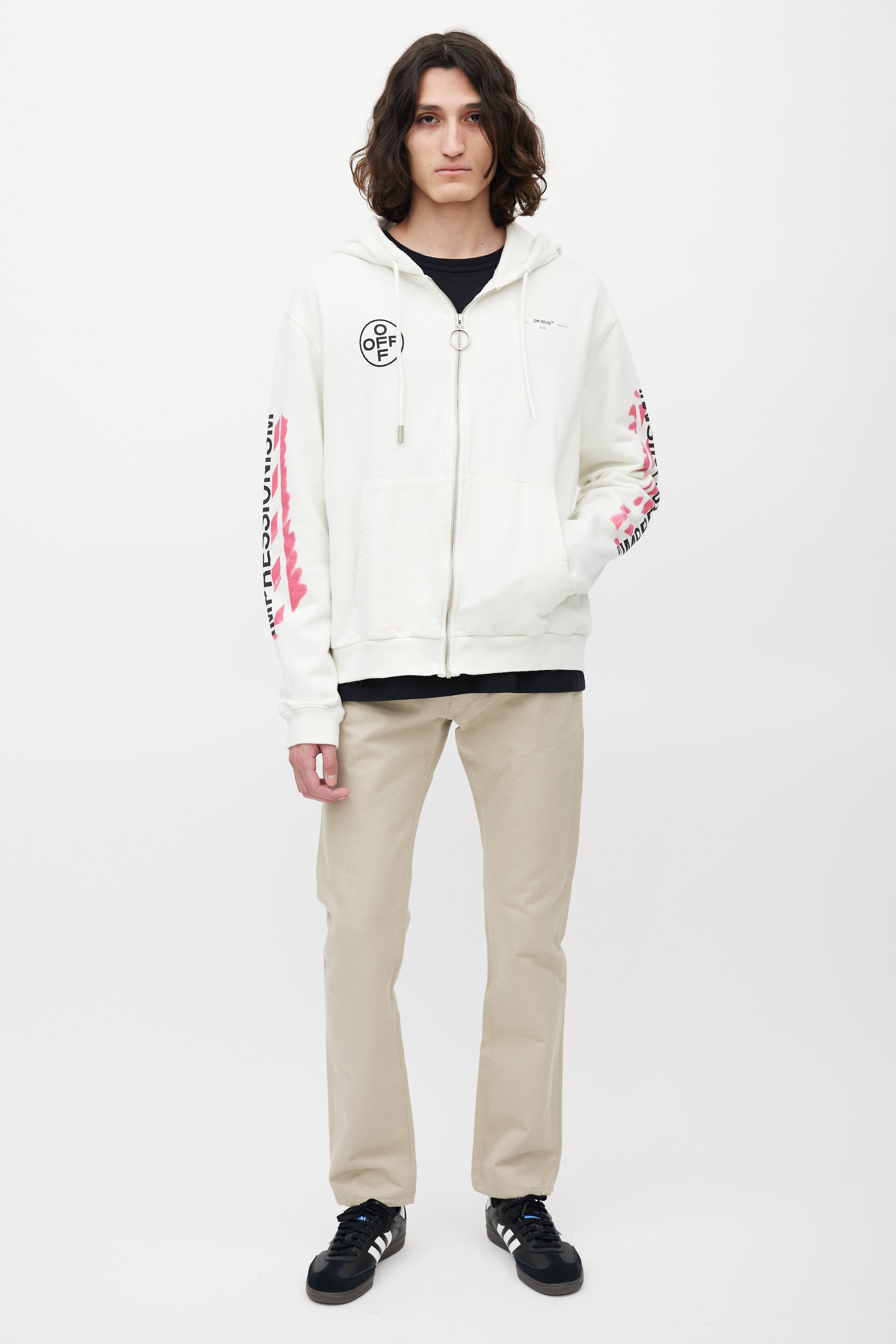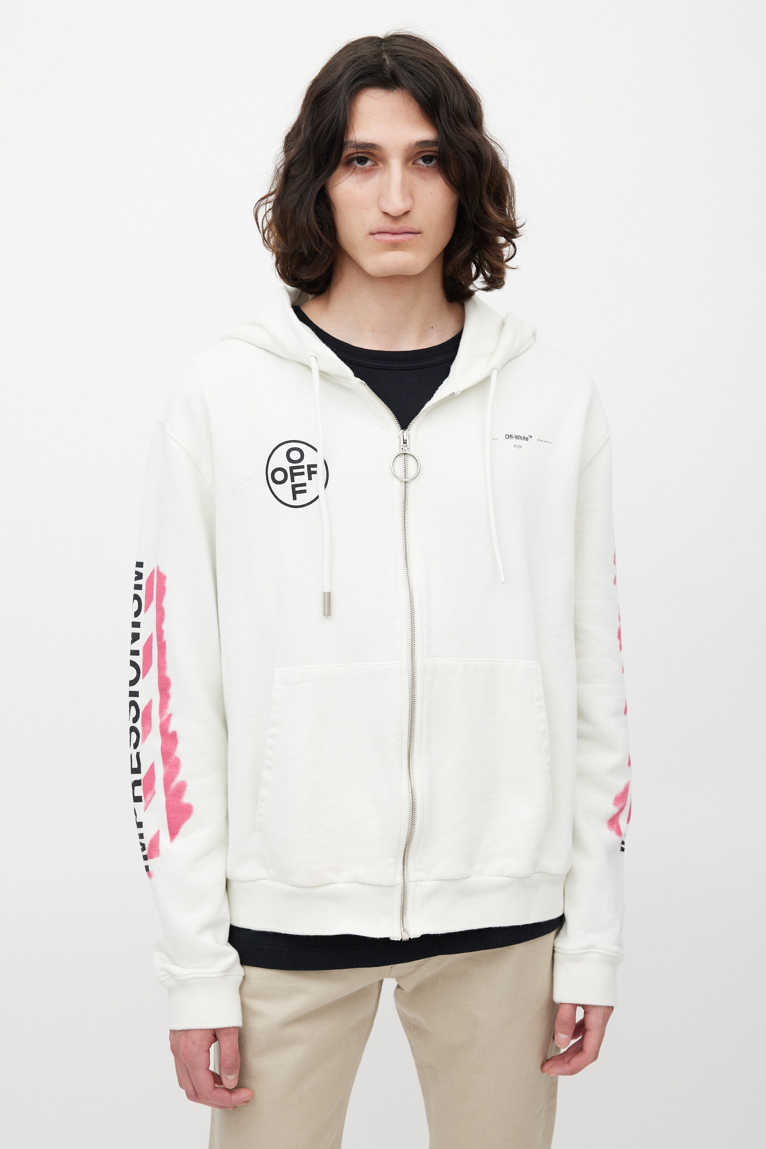 Pre-owned Off-White white hoodie featuring multicolour Impressionism logo print throughout, attached drawstring hood, two slip pockets at hip, and zip closure.