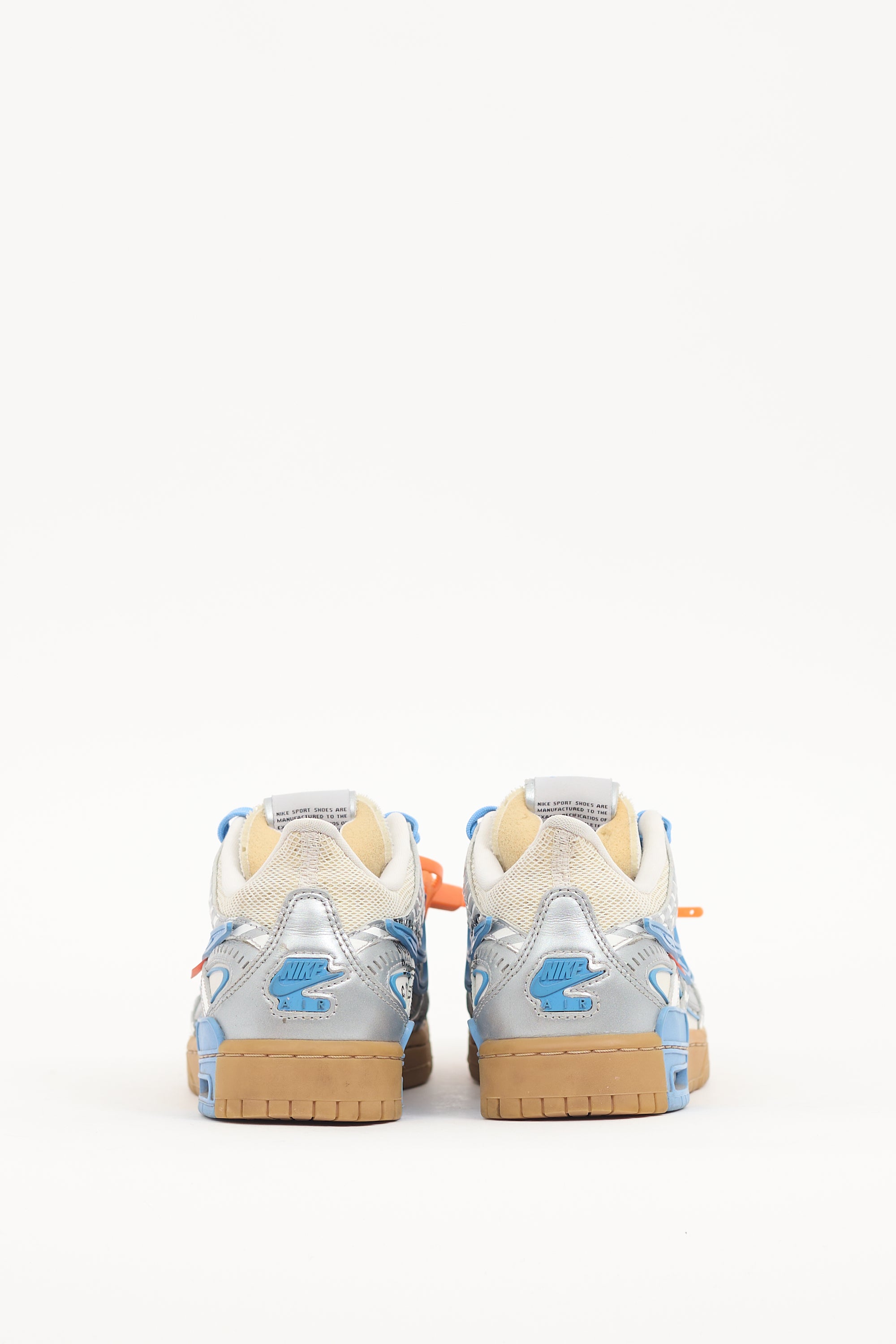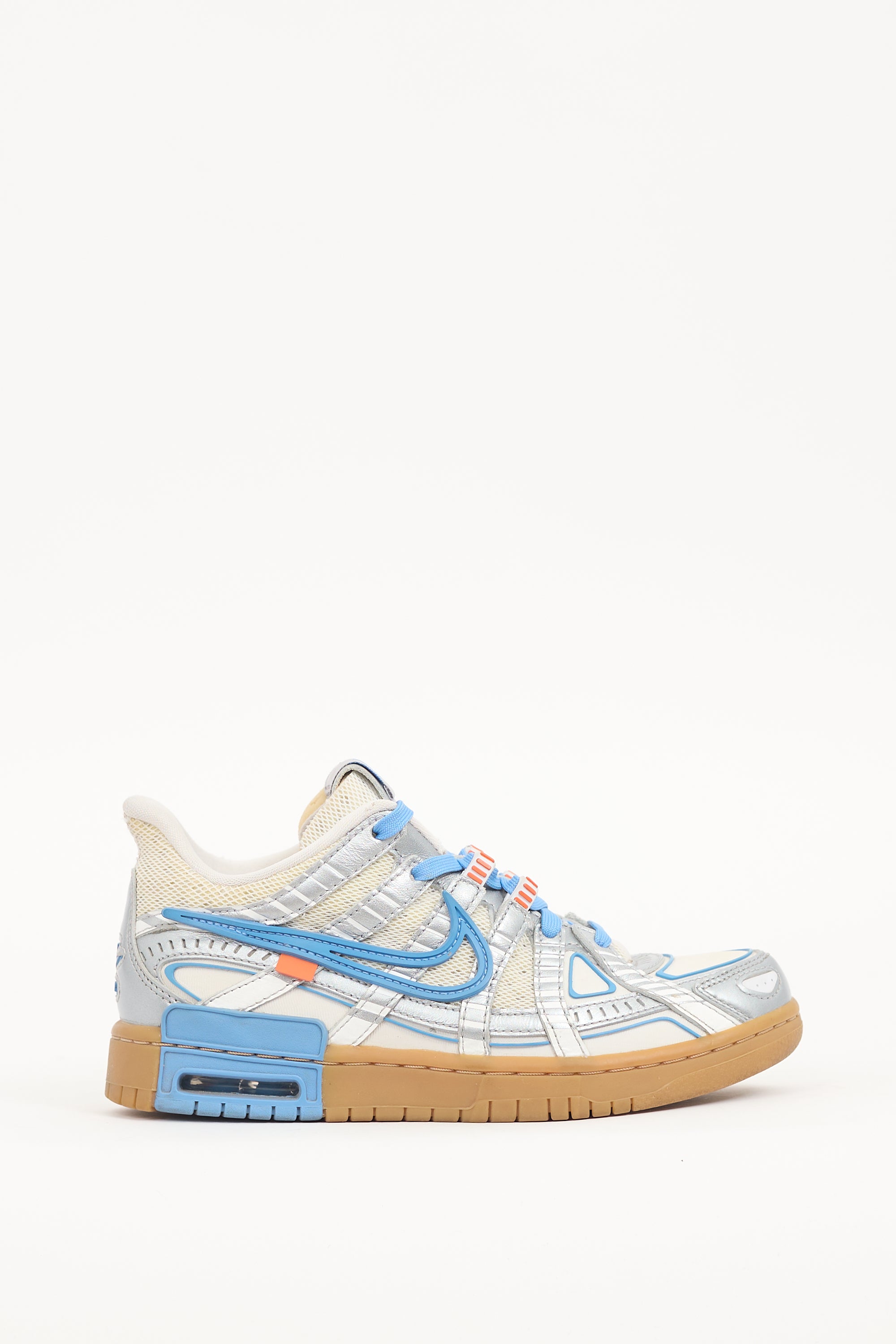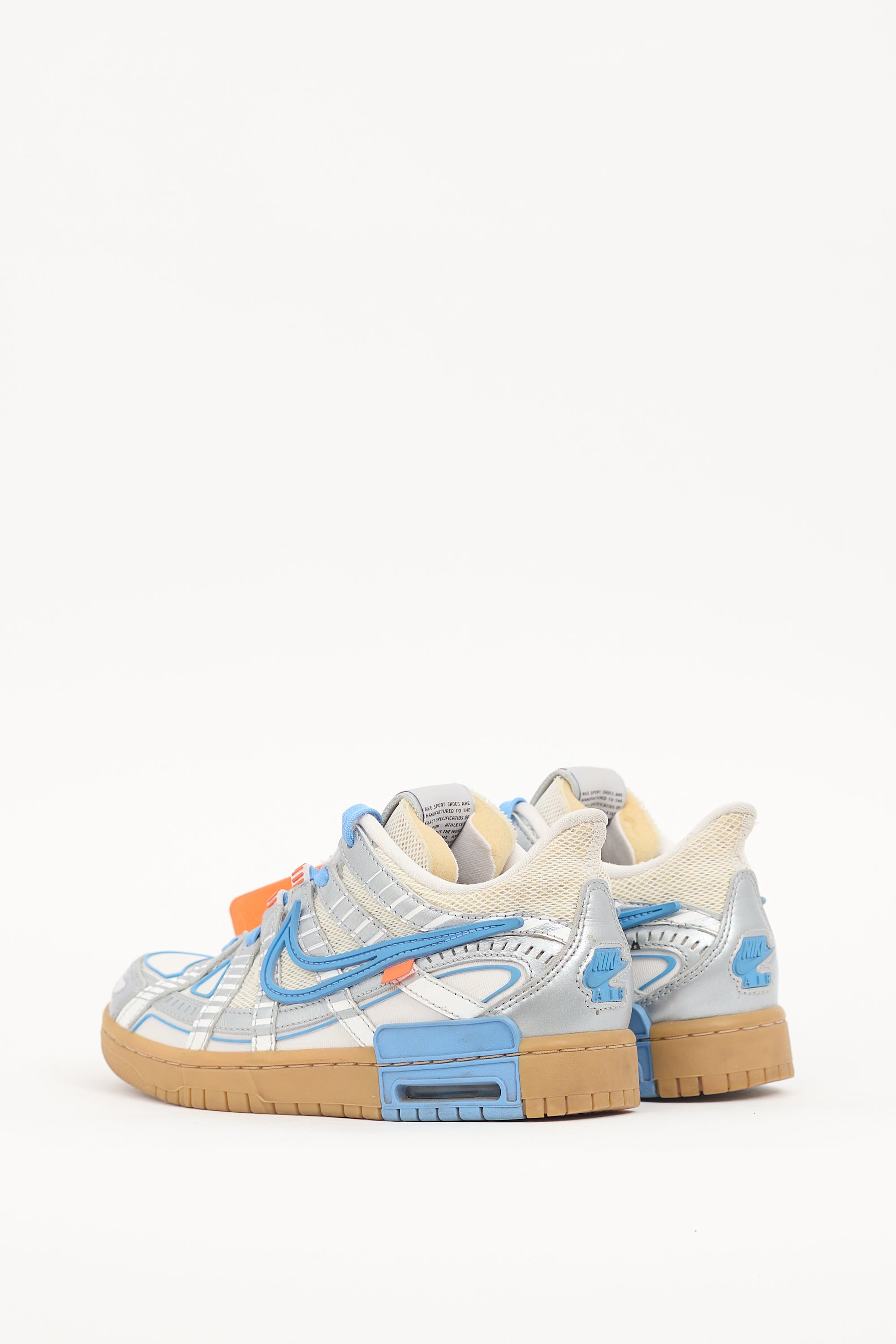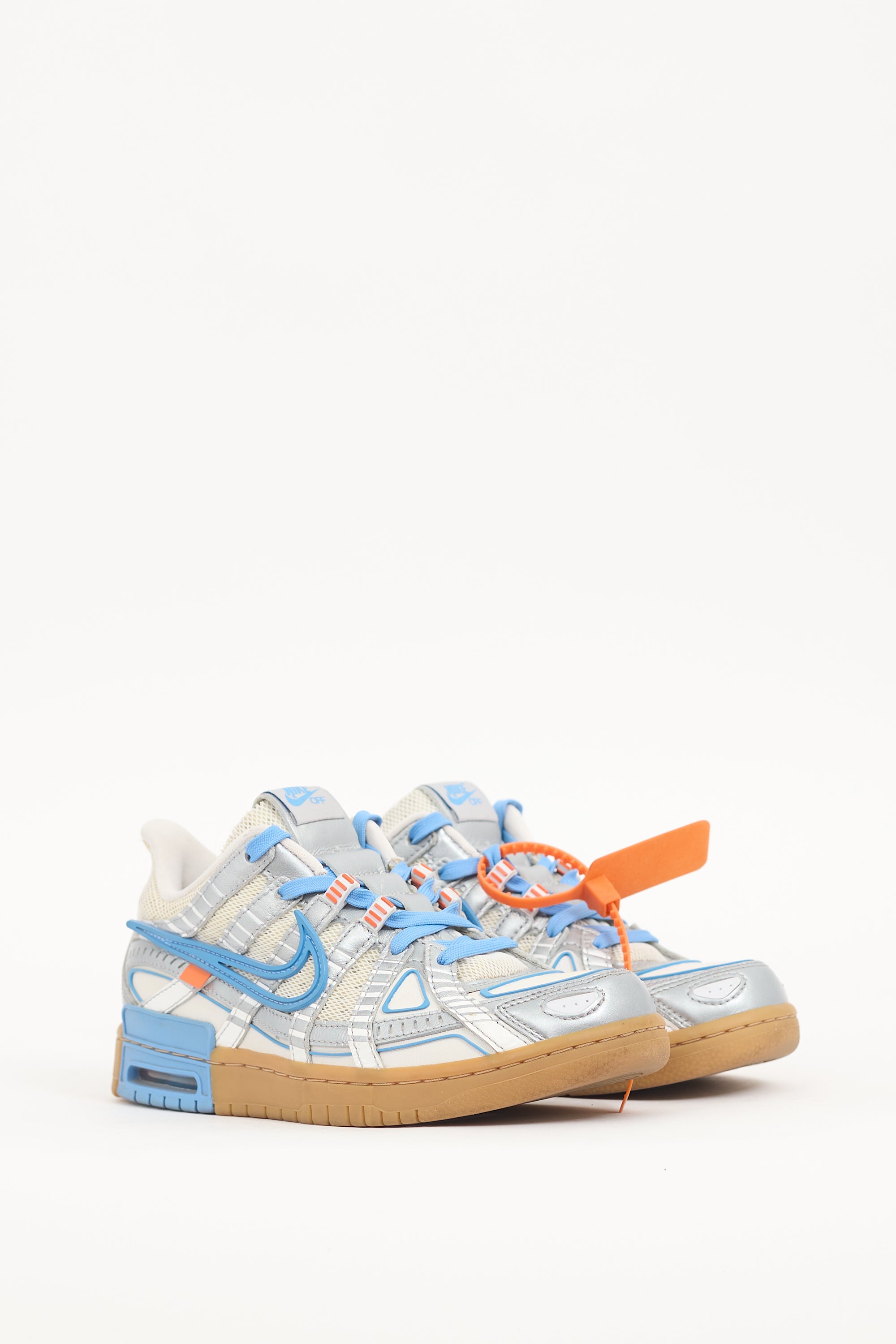 Pre-owned Off-White X Nike silver, light blue, and multicolour Air Rubber Dunk sneakers featuring mesh, leather, and rubber panelled upper, lace up vamp, logo tag at tongue, printed logo at inner sides, rubber cut out Swoosh logo at sides, brown rubber sole, and removable orange zip tie embellishment. Comes with original box and extra set of shoelaces.