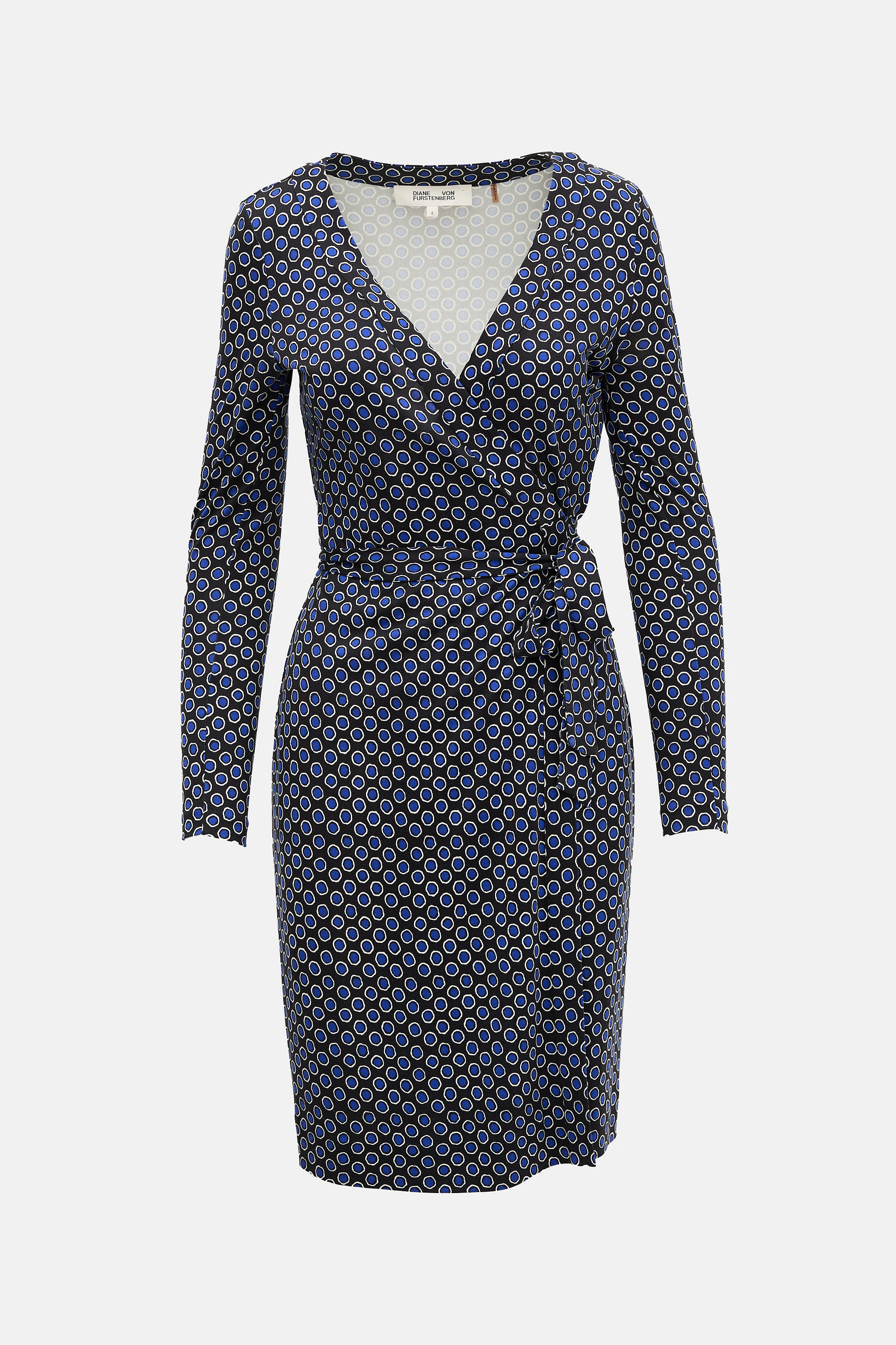 Pre-owned Diane von Furstenberg black silk dress featuring blue and white polka dot pattern, wrap front with self-tie fastening, V-neckline, and long sleeves.