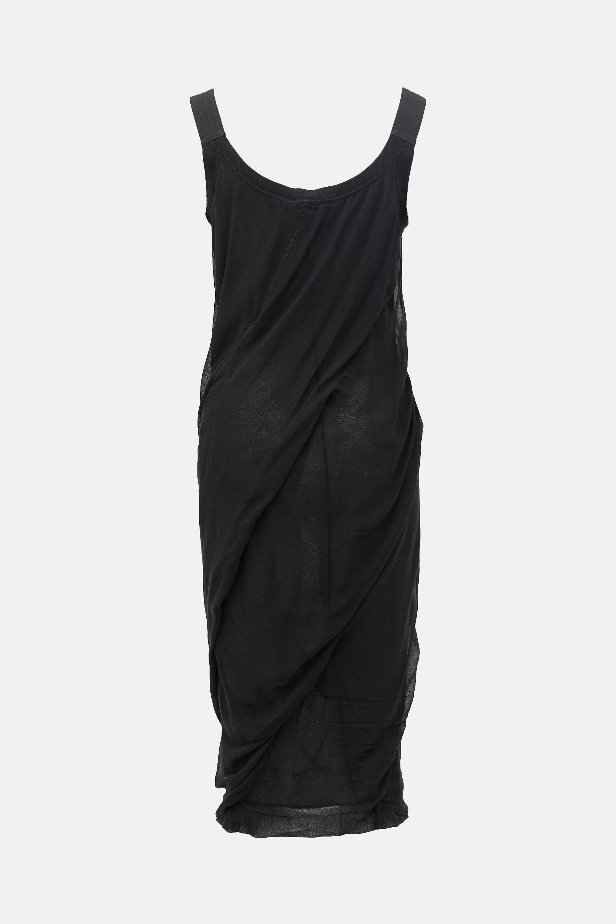 Pre-owned Dolce & Gabbana D&G black vintage mesh dress featuring Velcro shoulder straps, U-neckline, asymmetrical drape, and hook and eye embellishment at front.