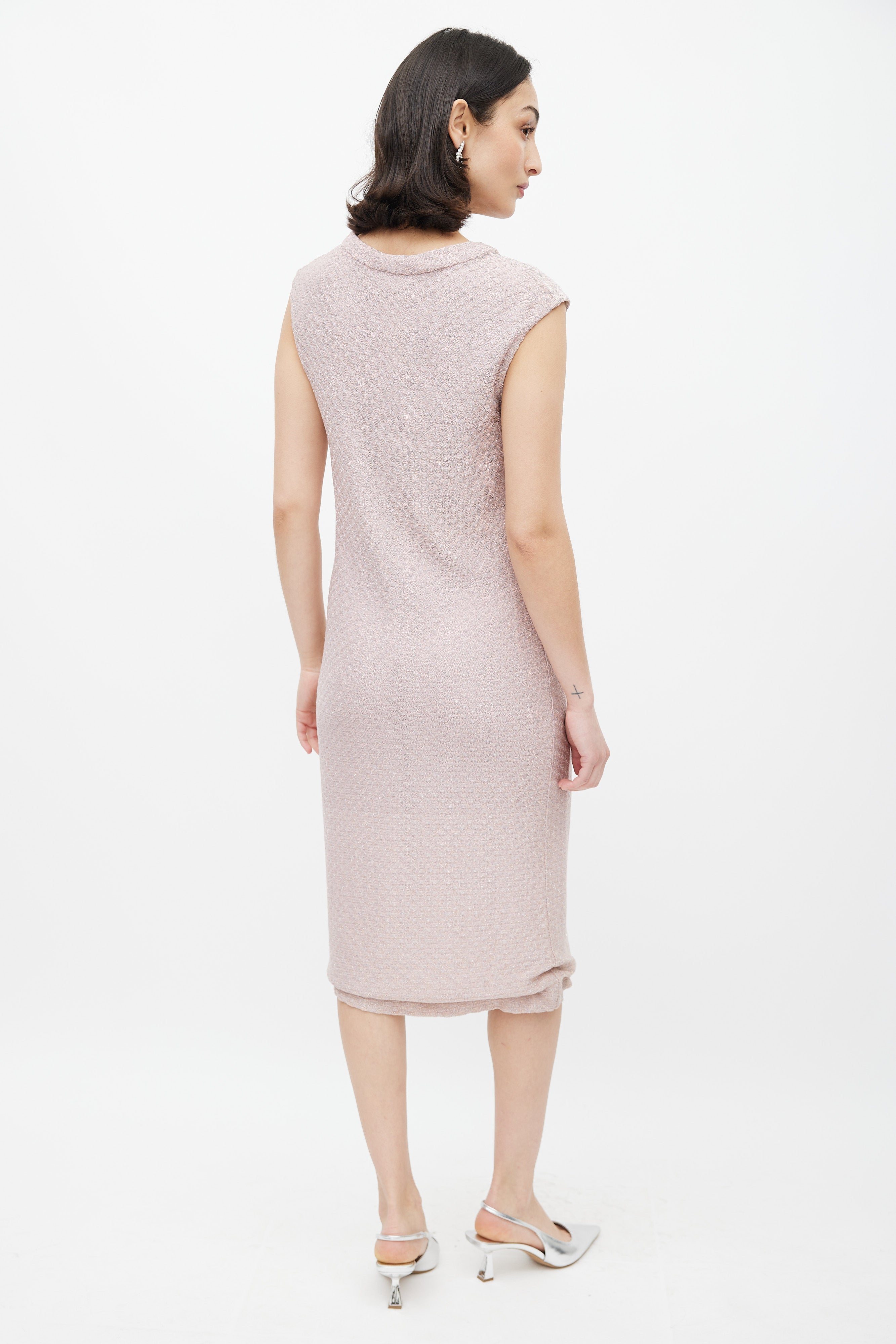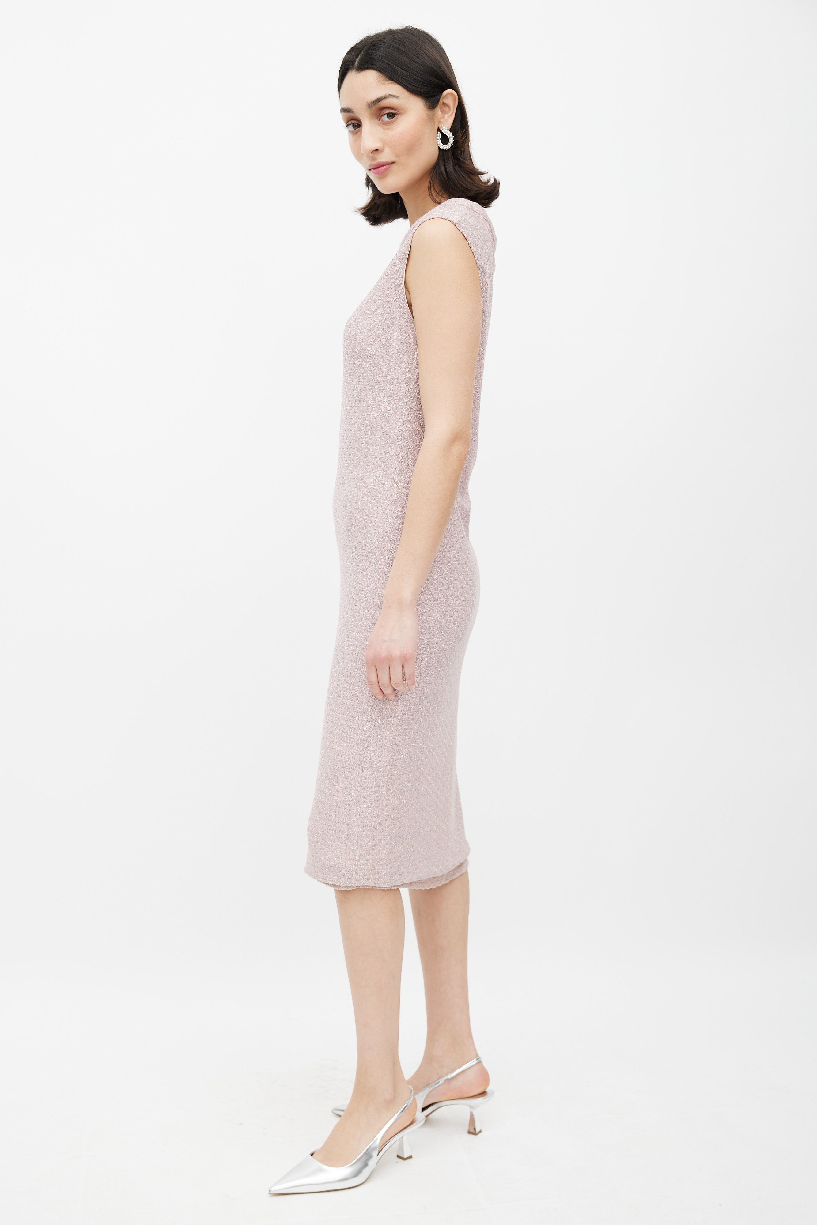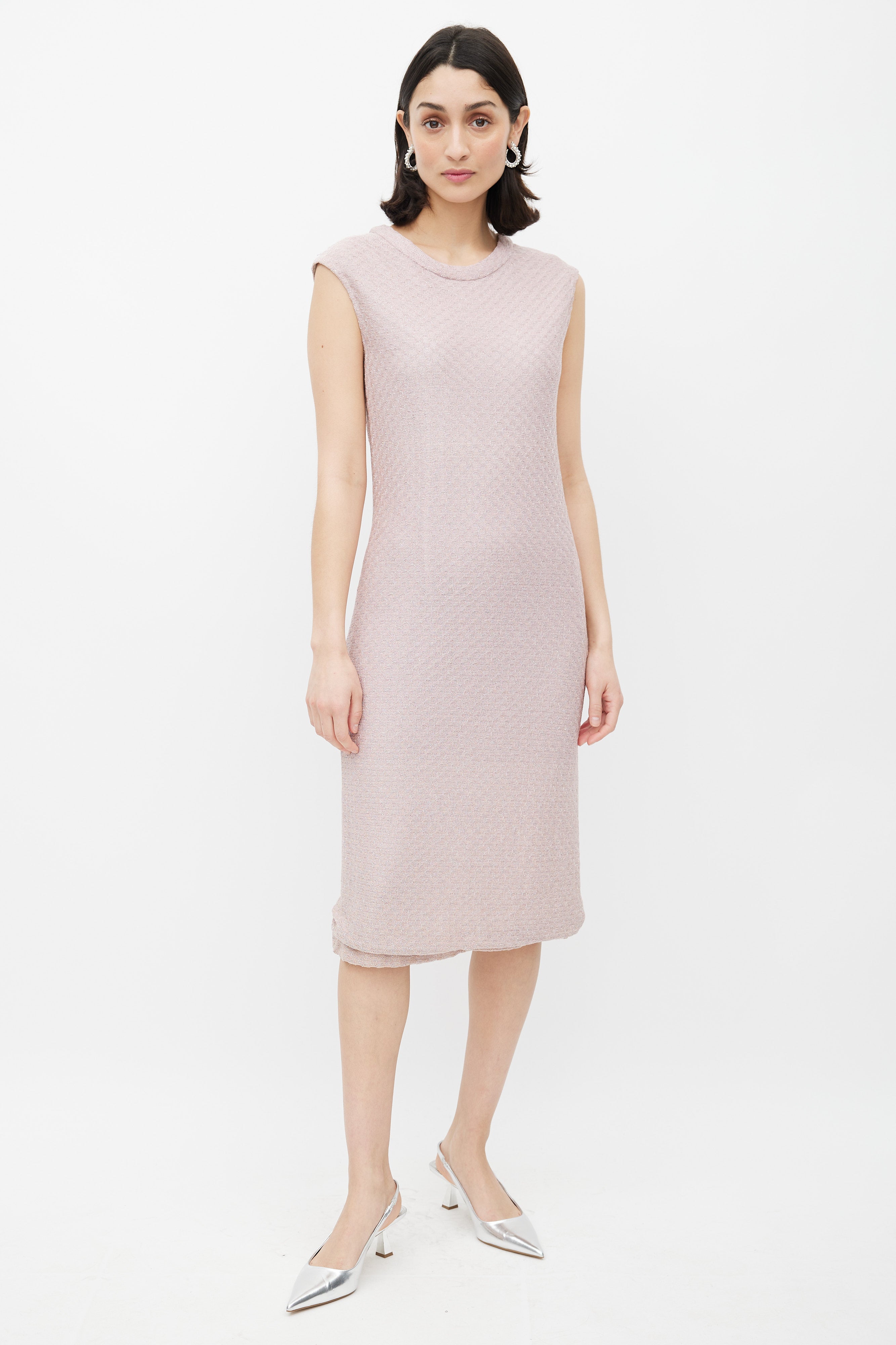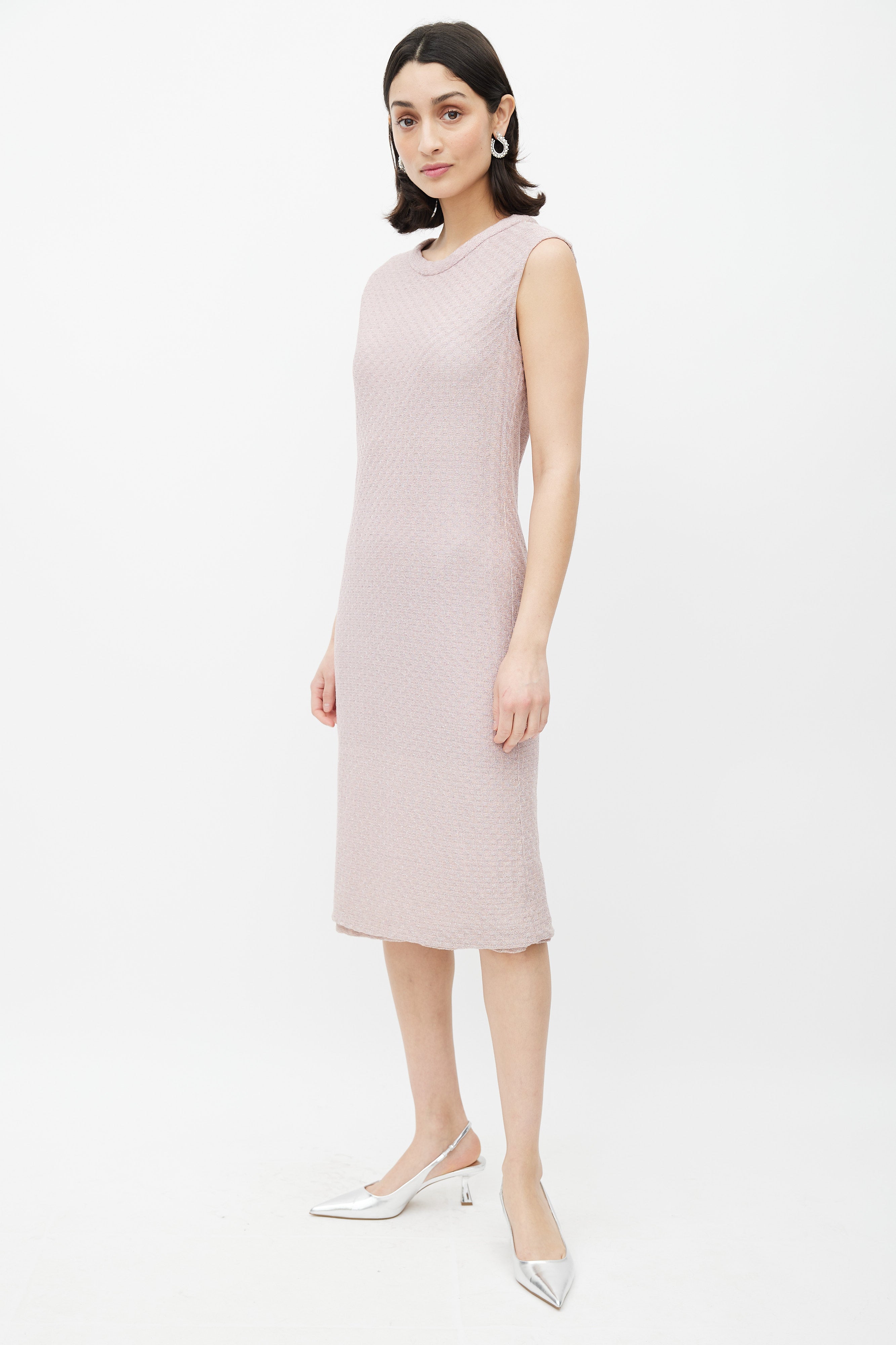 Pre-owned Missoni vintage shift midi dress featuring pink wavy weave knit fabric with silver metallic thread throughout and a rounded neckline.