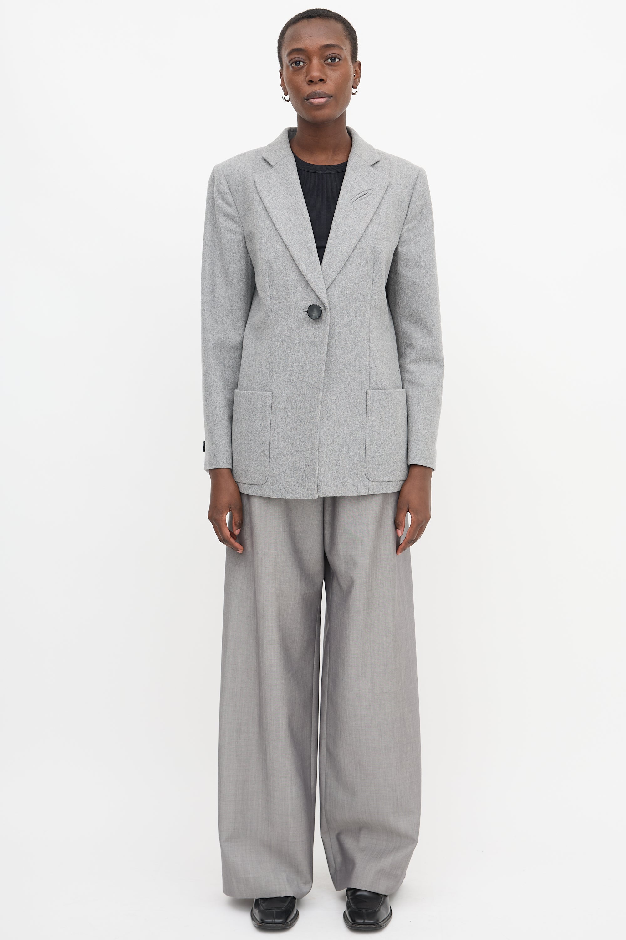 Pre-owned Giorgio Armani grey oversized blazer featuring notched lapel, single button front closure, two front patch pockets, back vent, padded shoulders, and buttoned cuffs. Lined.