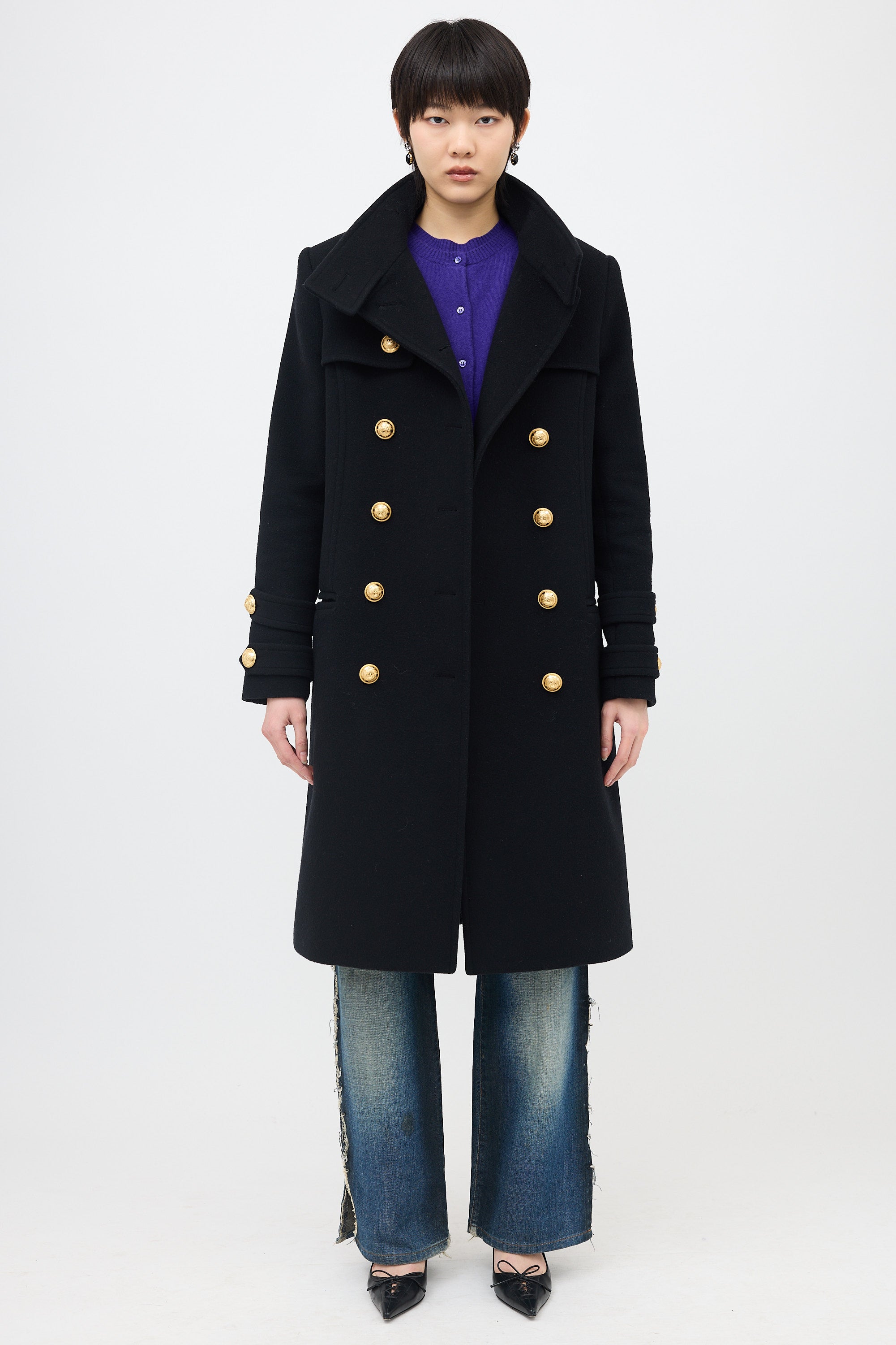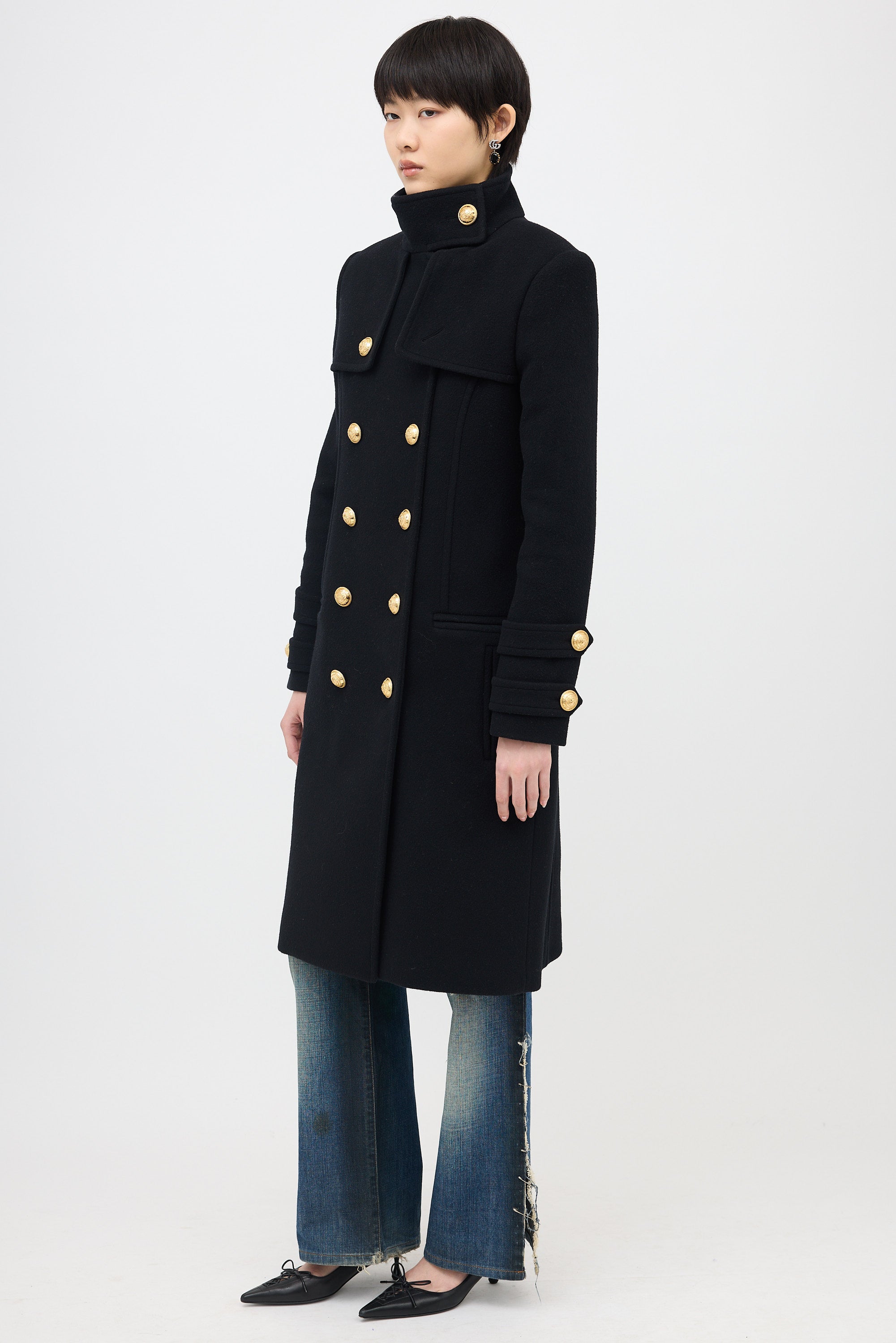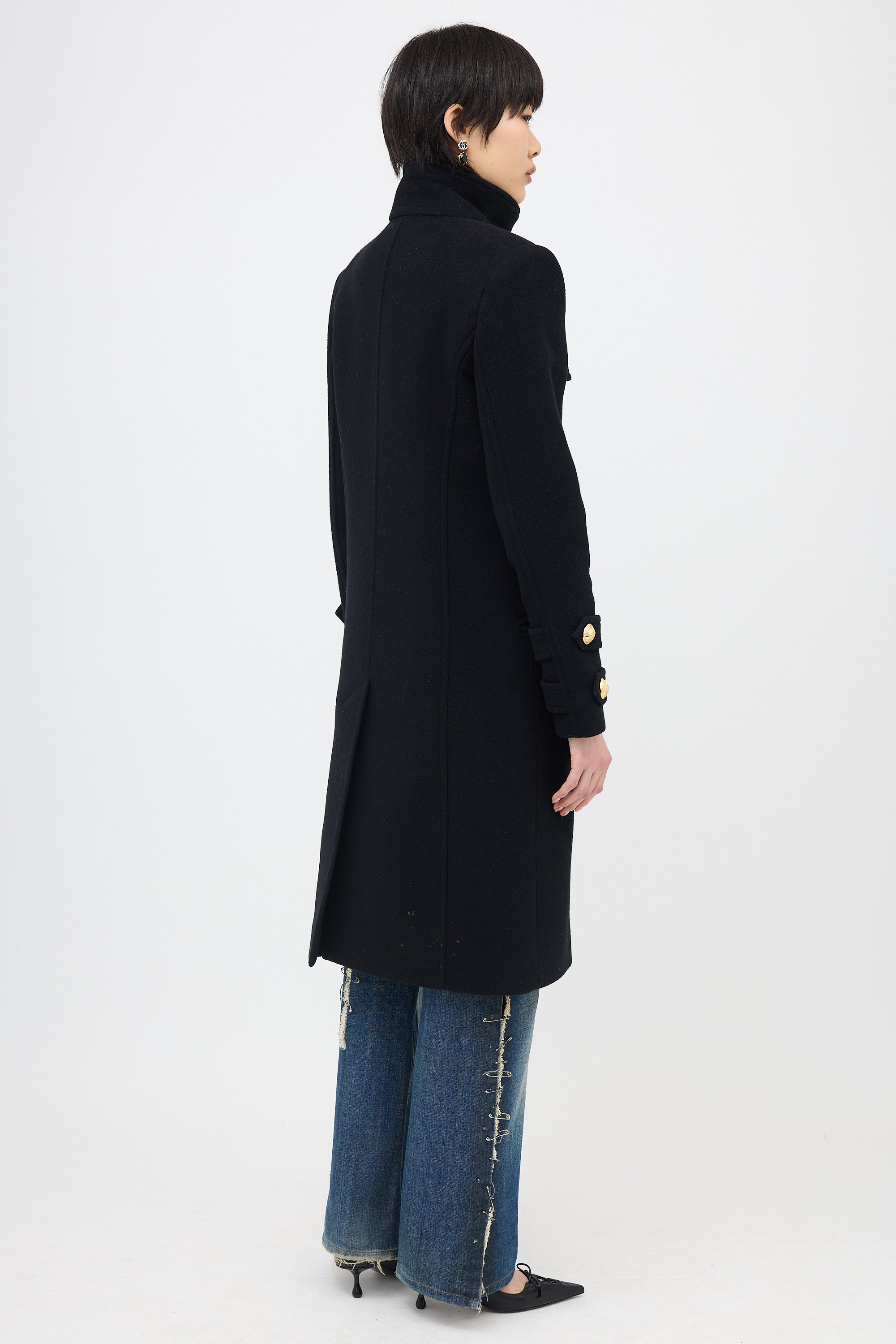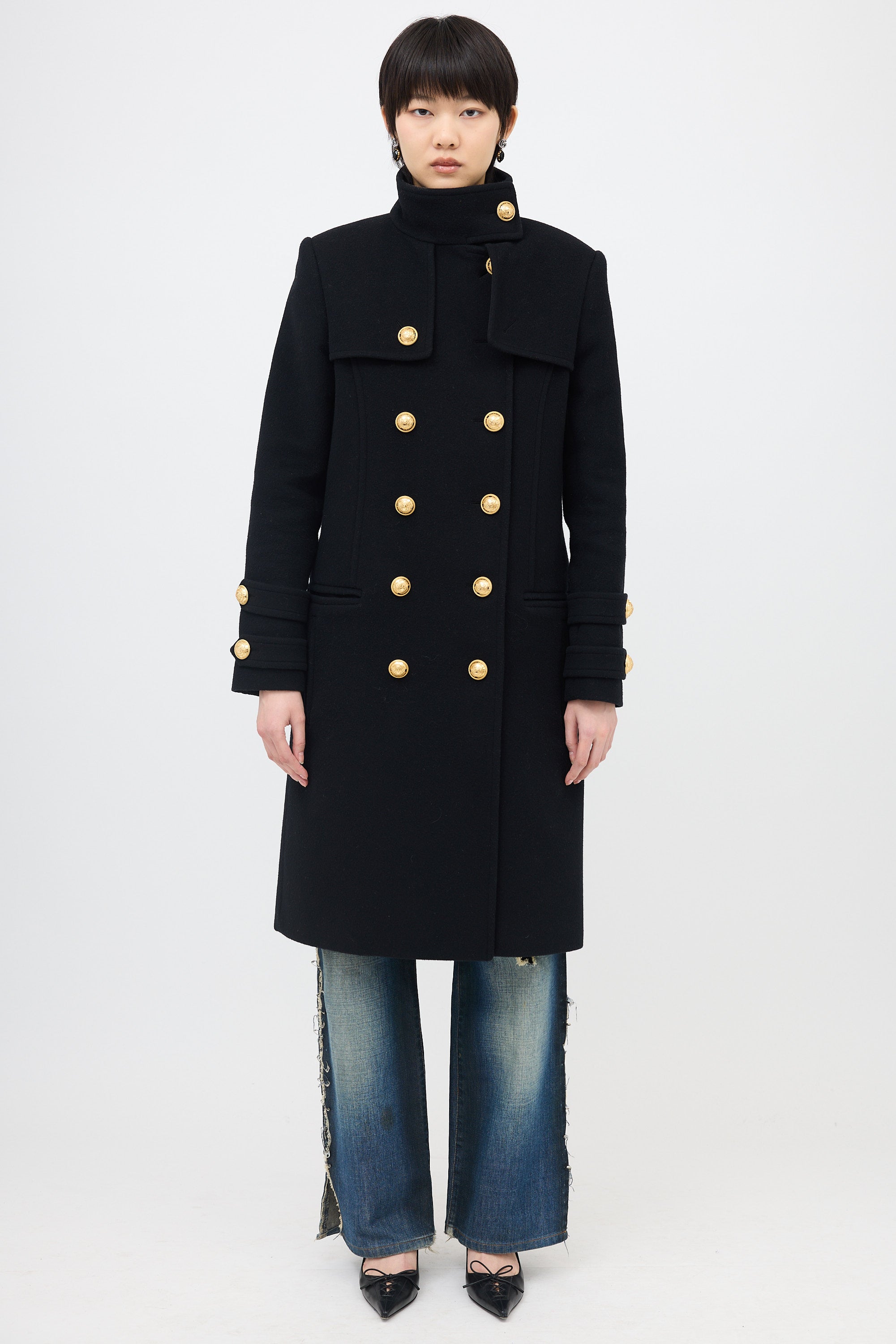 Pre-owned Balmain black wool and cashmere coat featuring gold tone crest buttons, stand collar with button fastening, button front, padded shoulder, storm flaps, double welt pockets, and back vent. Lined.