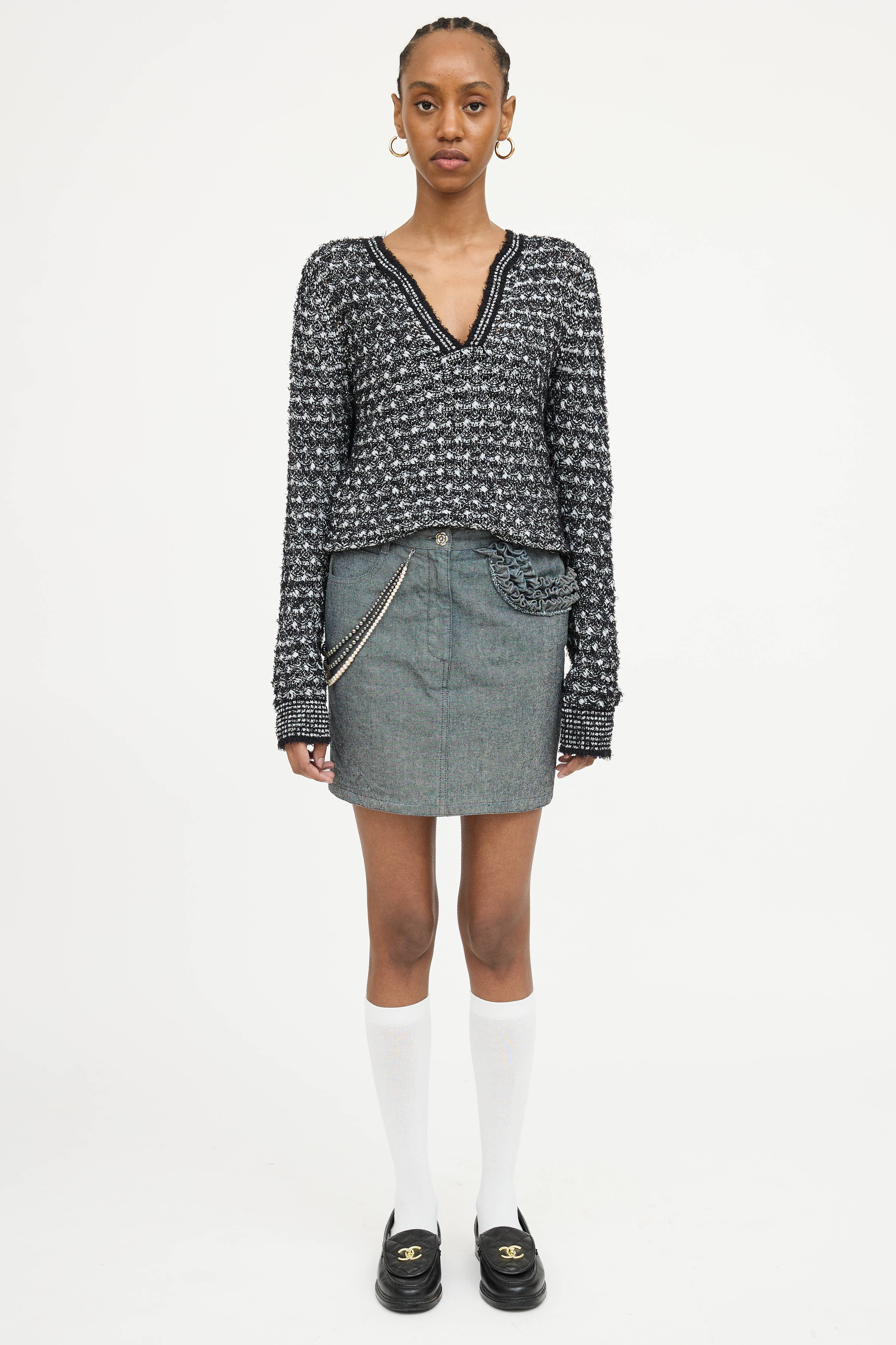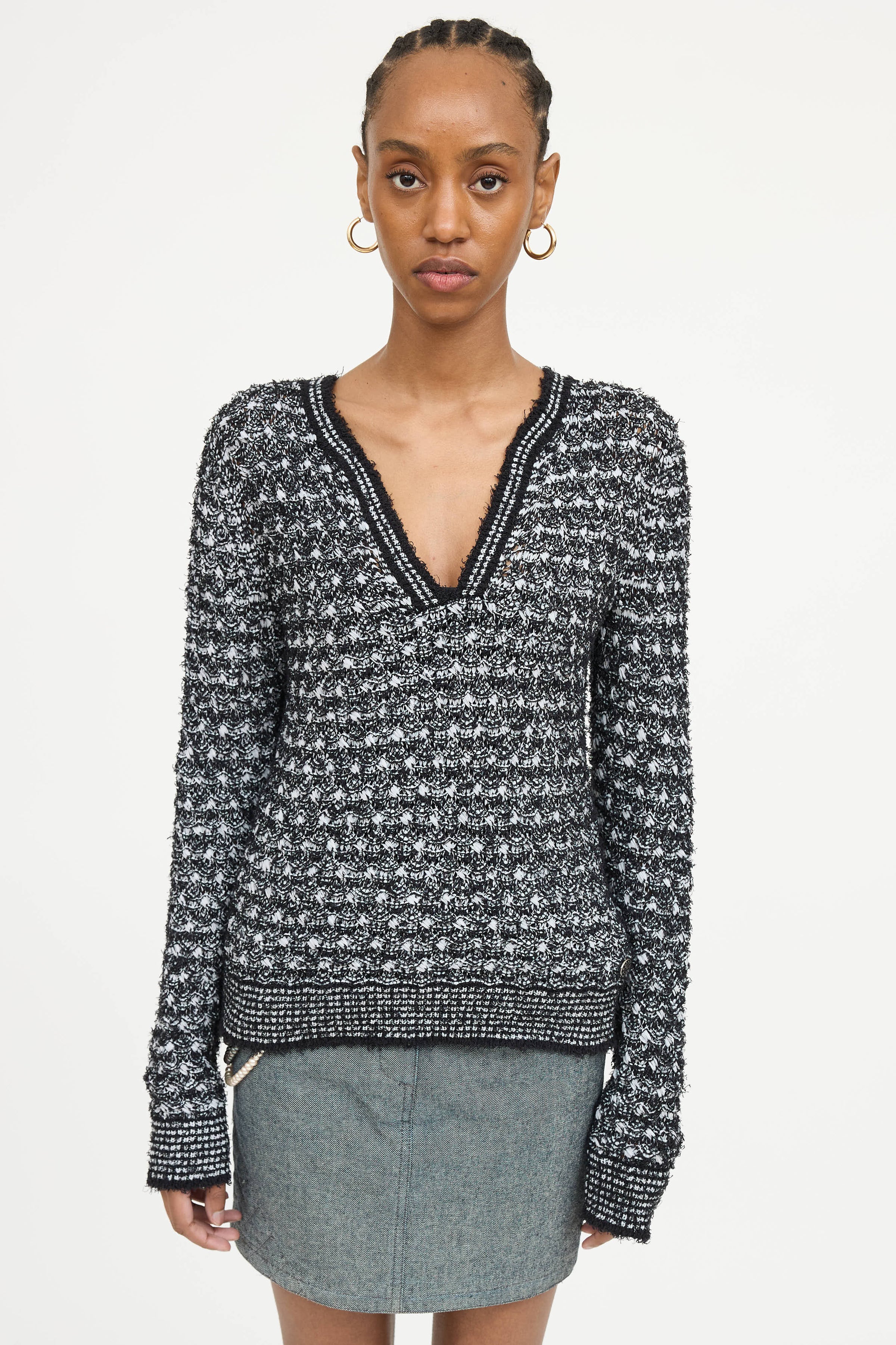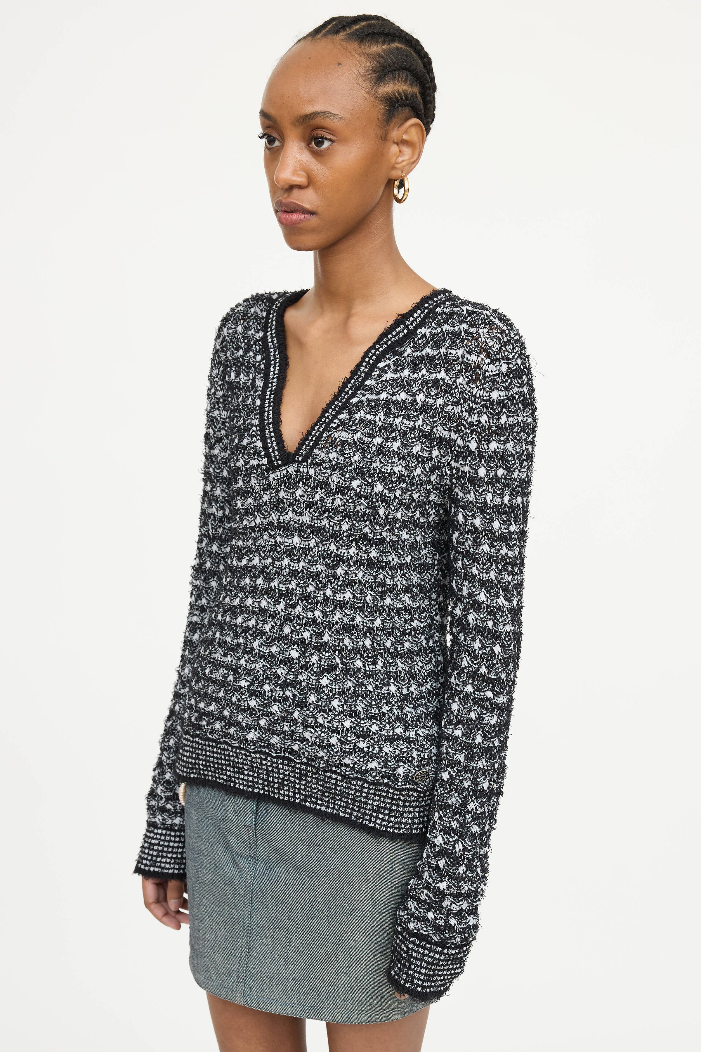 Pre-owned Chanel black and white sweater featuring v-neckline, open knit, striped ribbed trim, and raw hemlines.