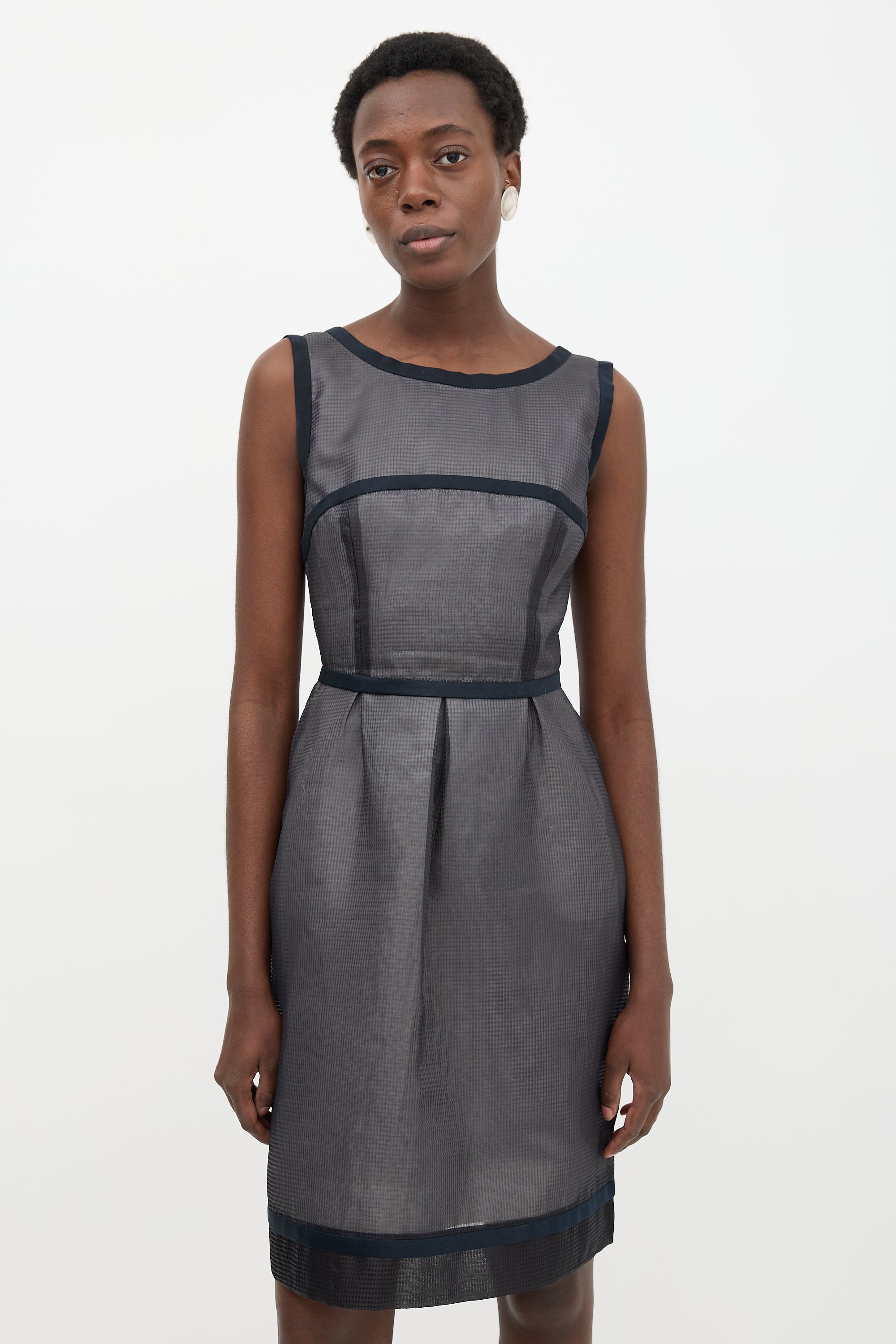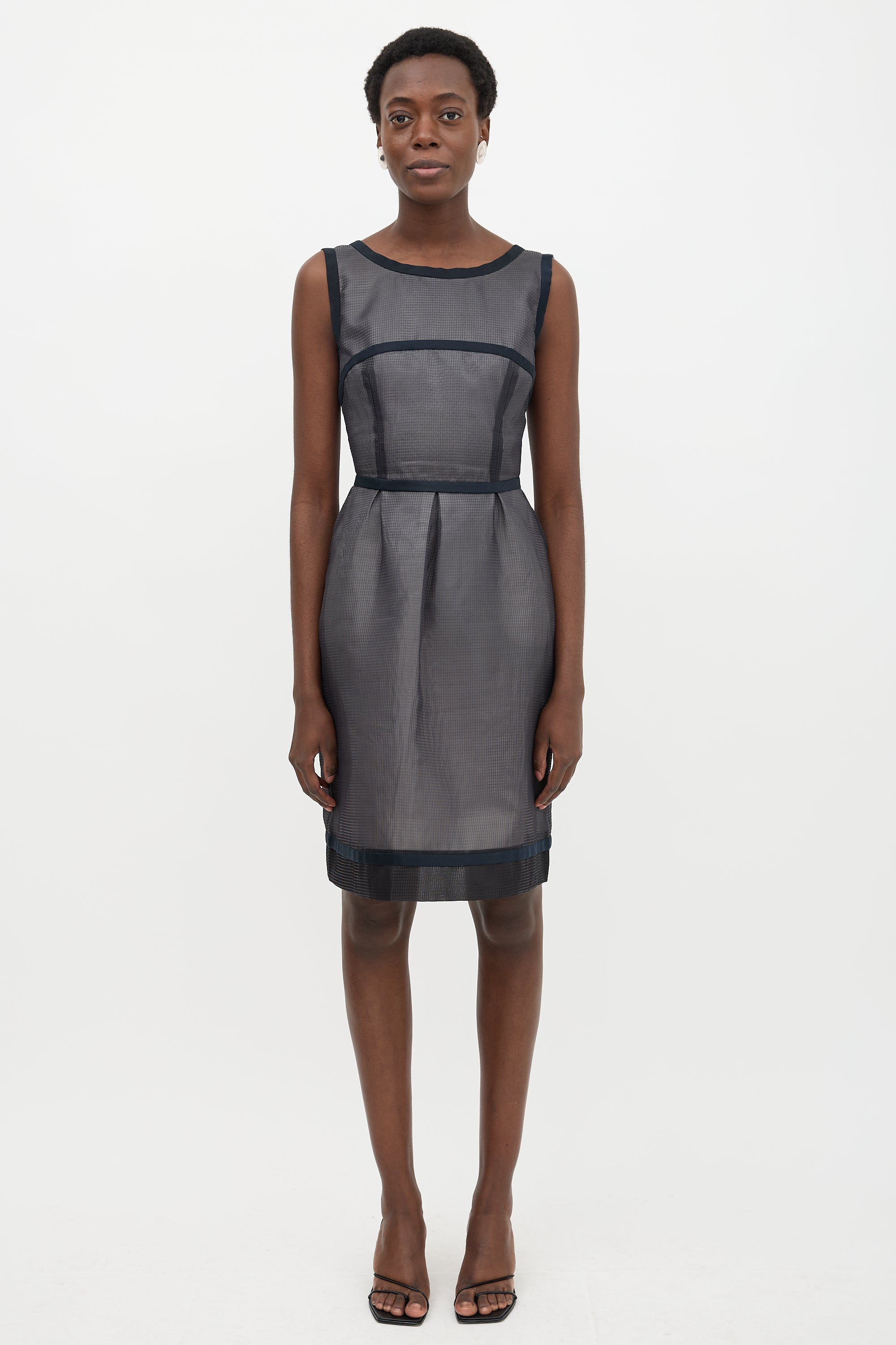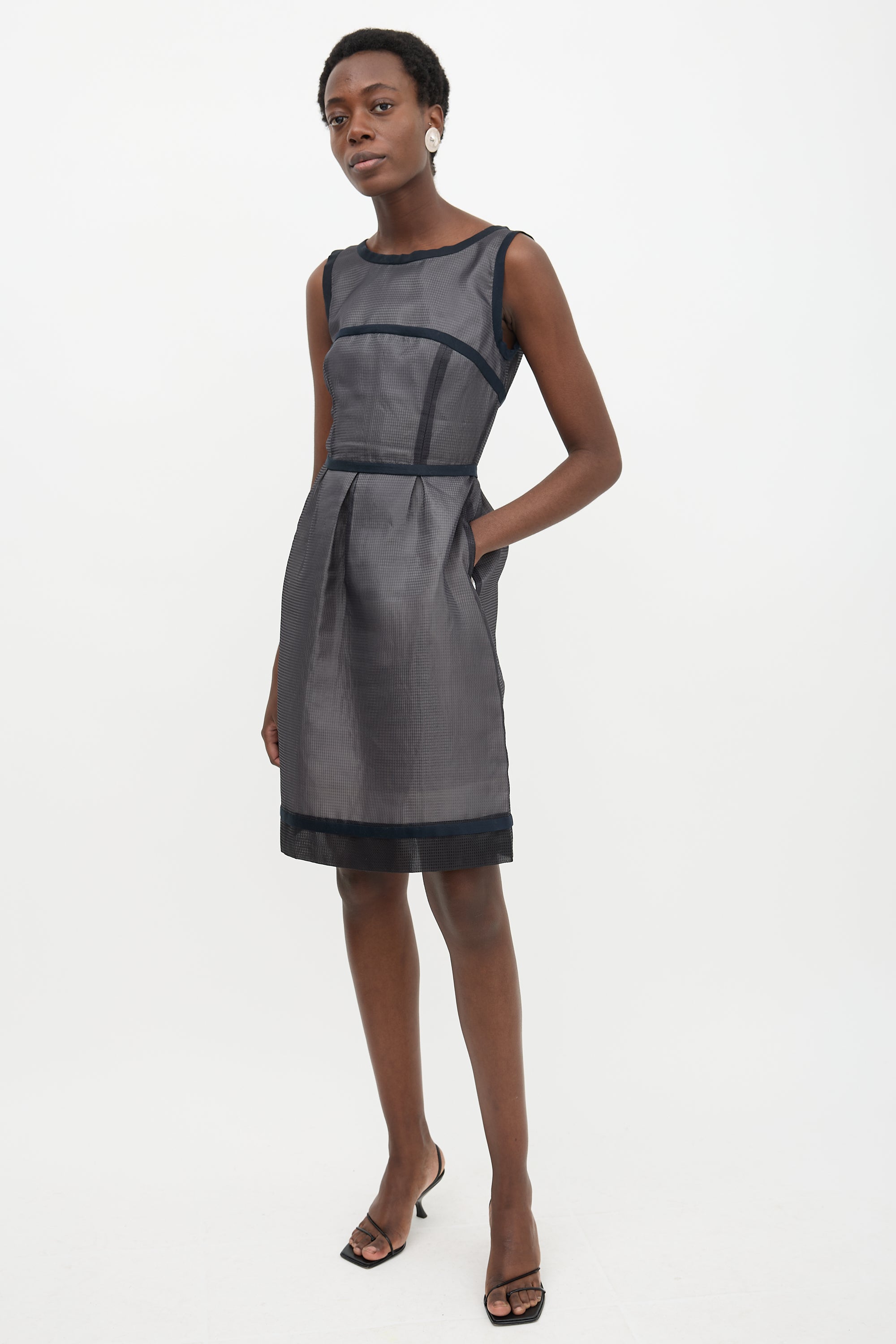 Pre-owned Fendi navy textured organza midi dress featuring bateau neckline, A-line skirt, in seam pockets, back keyhole with button closure, and concealed back zip closure. Lined.