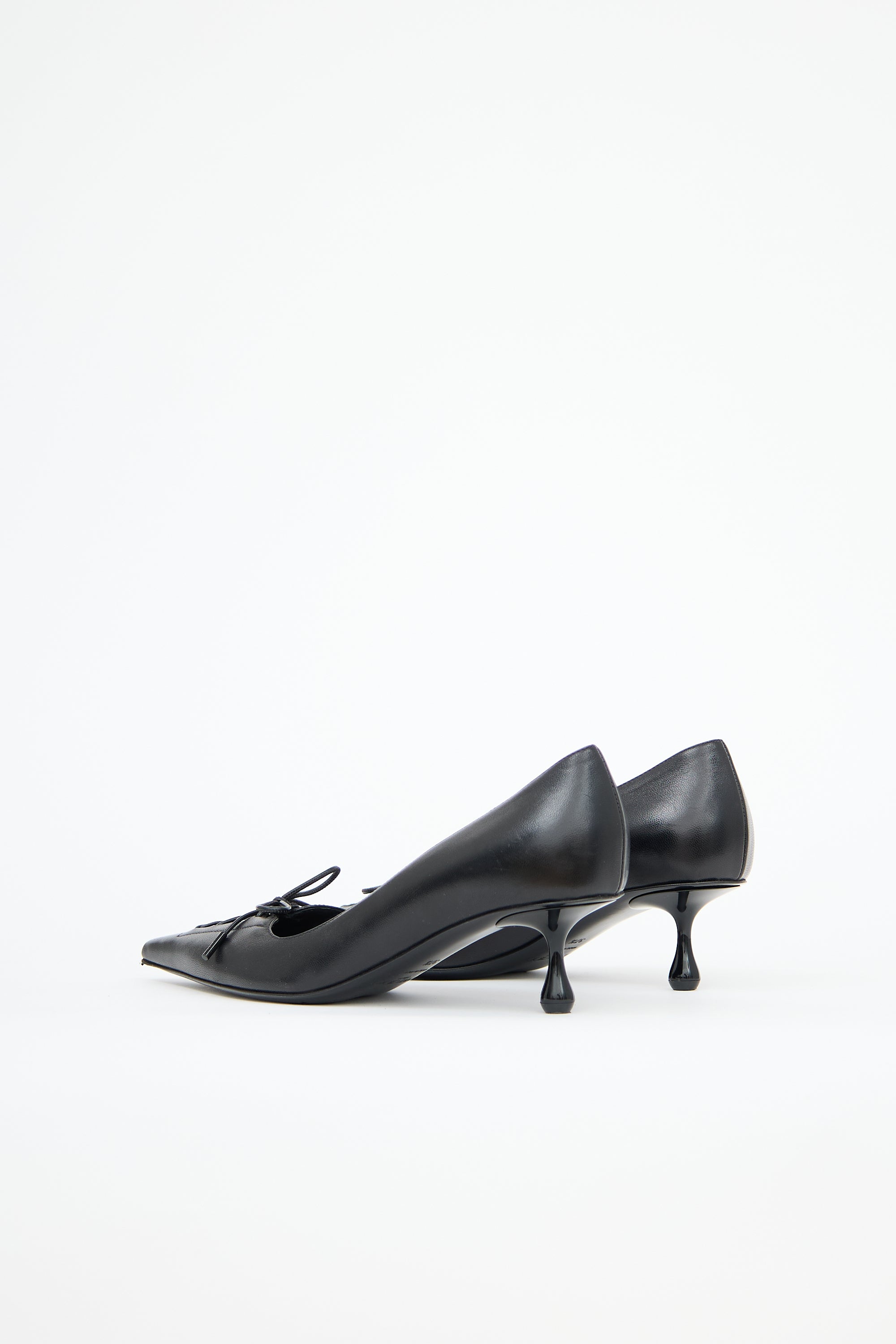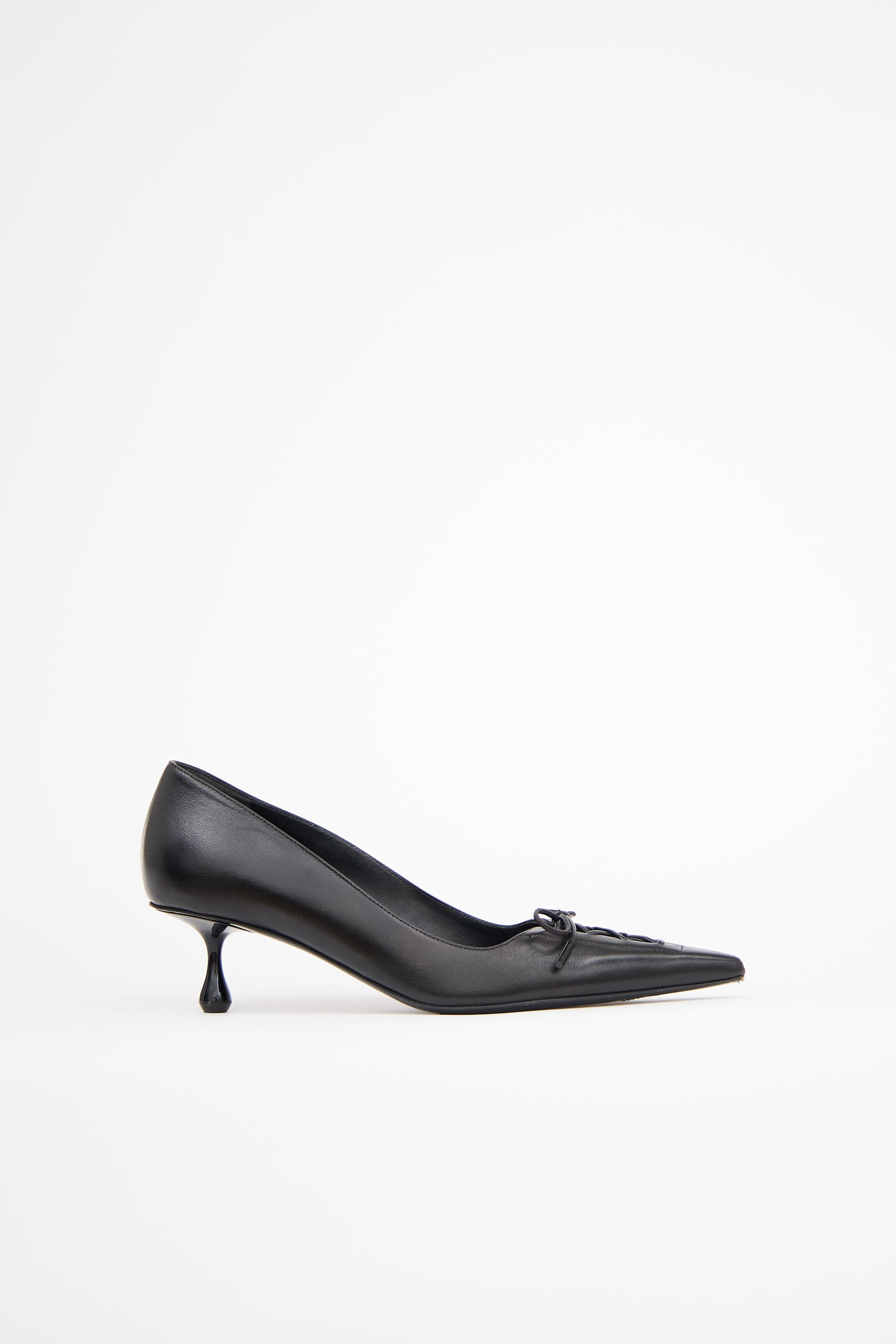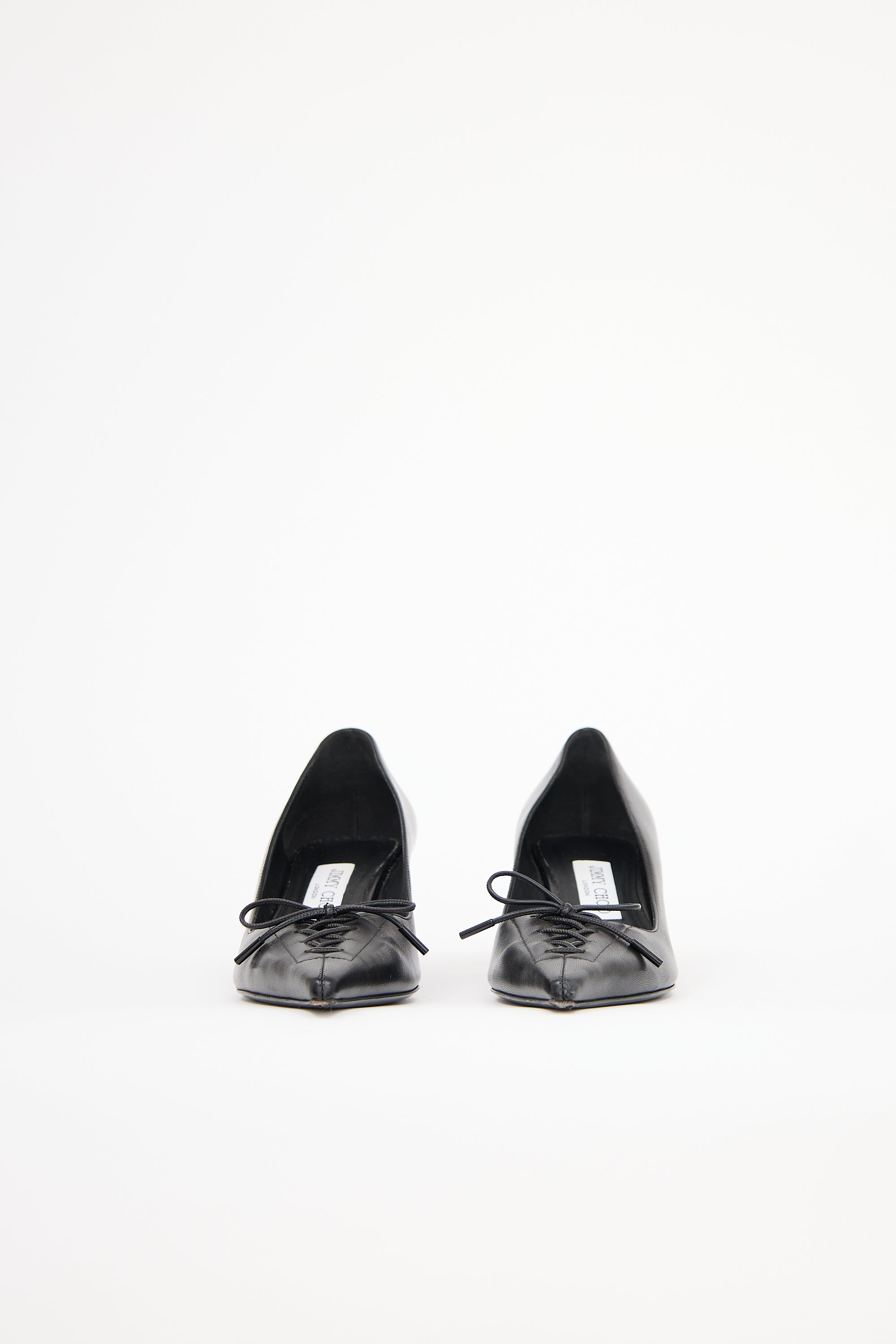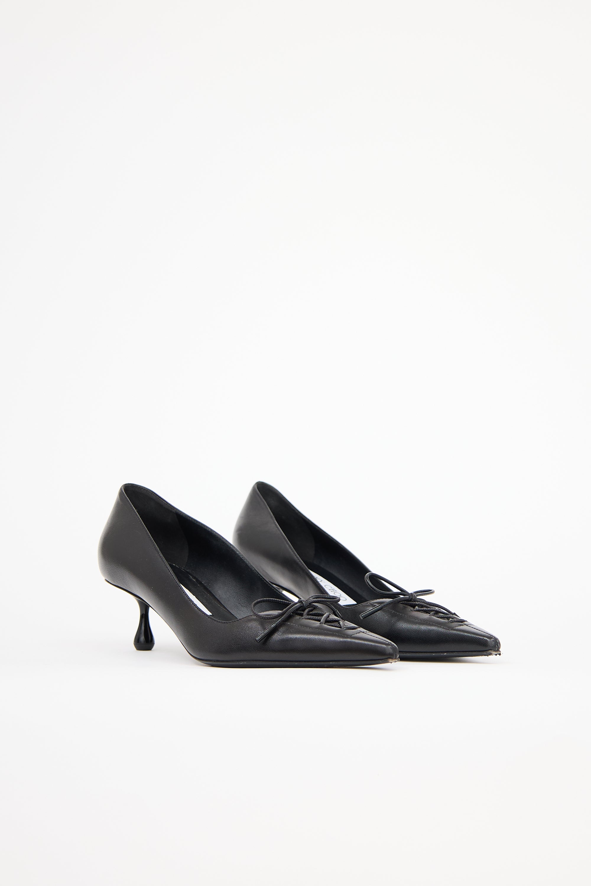 Pre-owned Jimmy Choo black leather Scarlett 50 pumps featuring a pointed toe with lace up detail, slip on entry, and kitten heel.