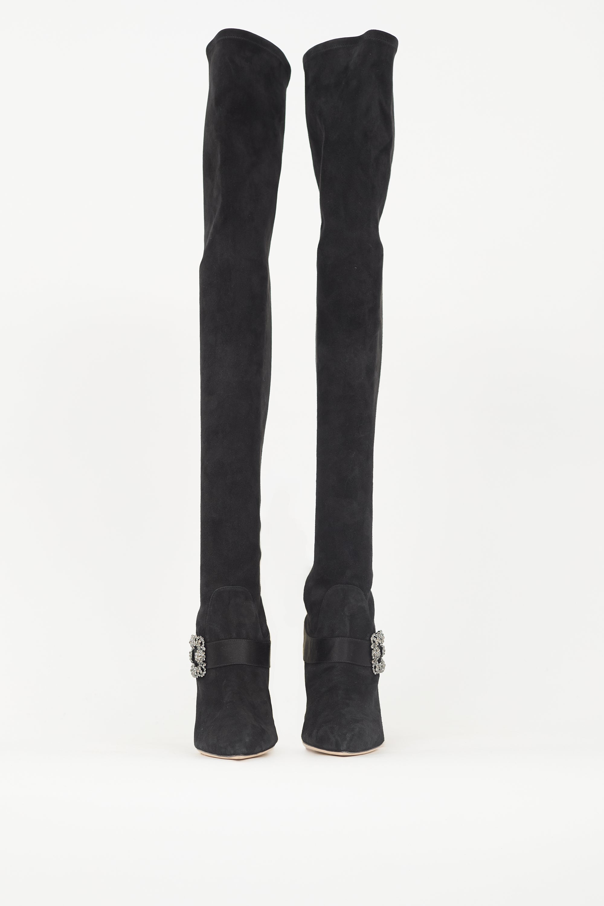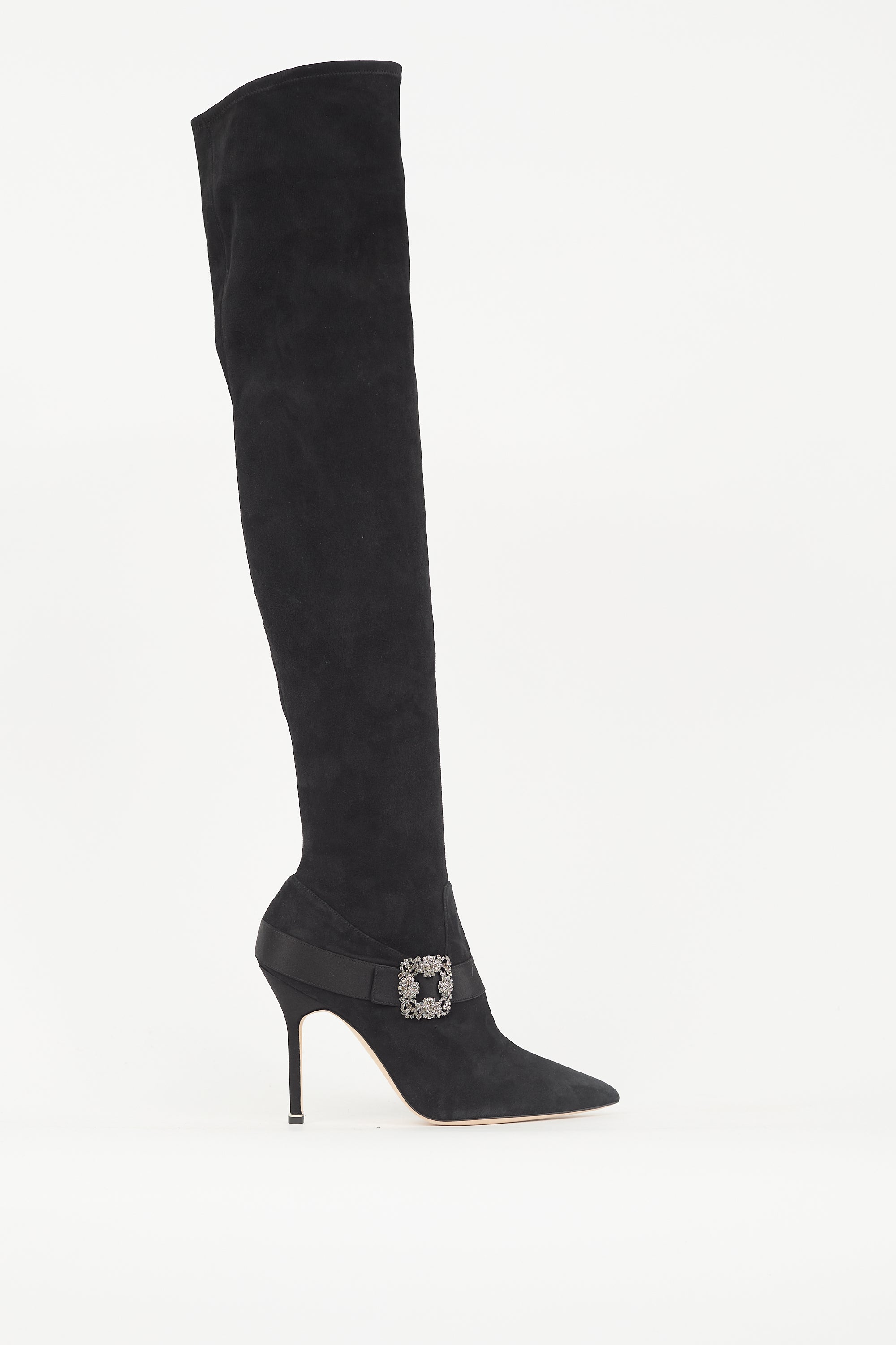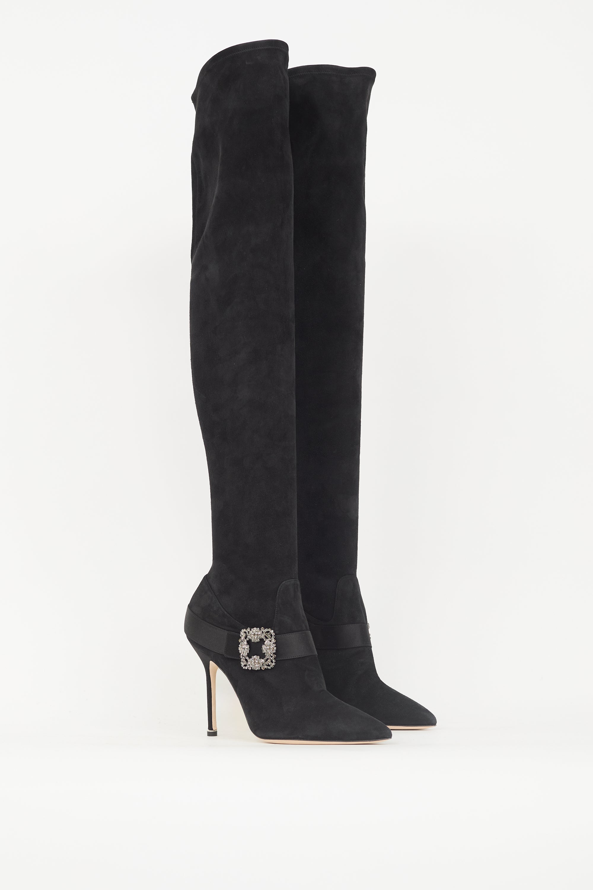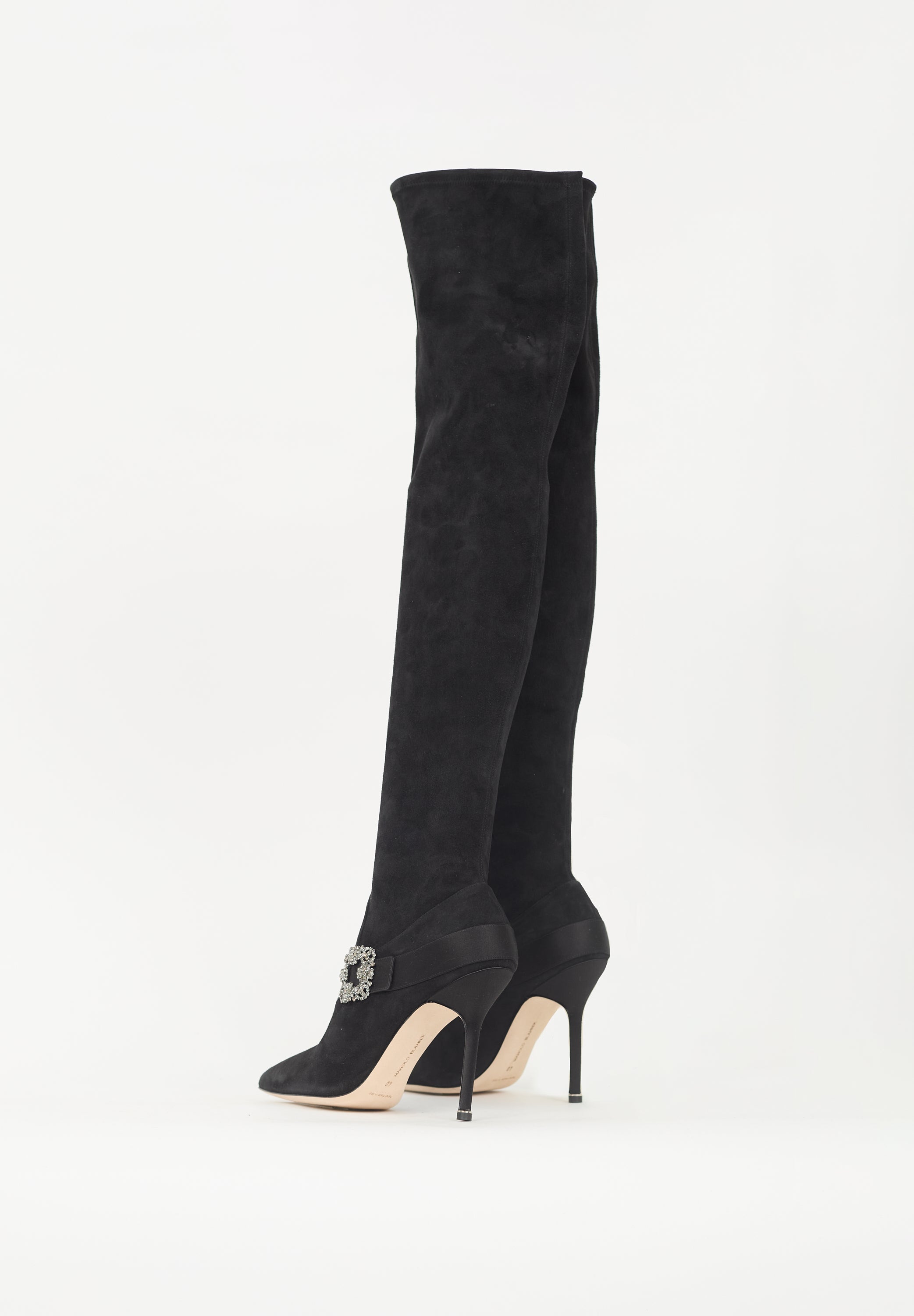 Pre-owned Manolo Blahnik black suede Plinianuthi 105 boots featuring a pointed toe, tonal satin strap with crystal embellished buckle at vamp, pull on entry, and covered stiletto heel.
