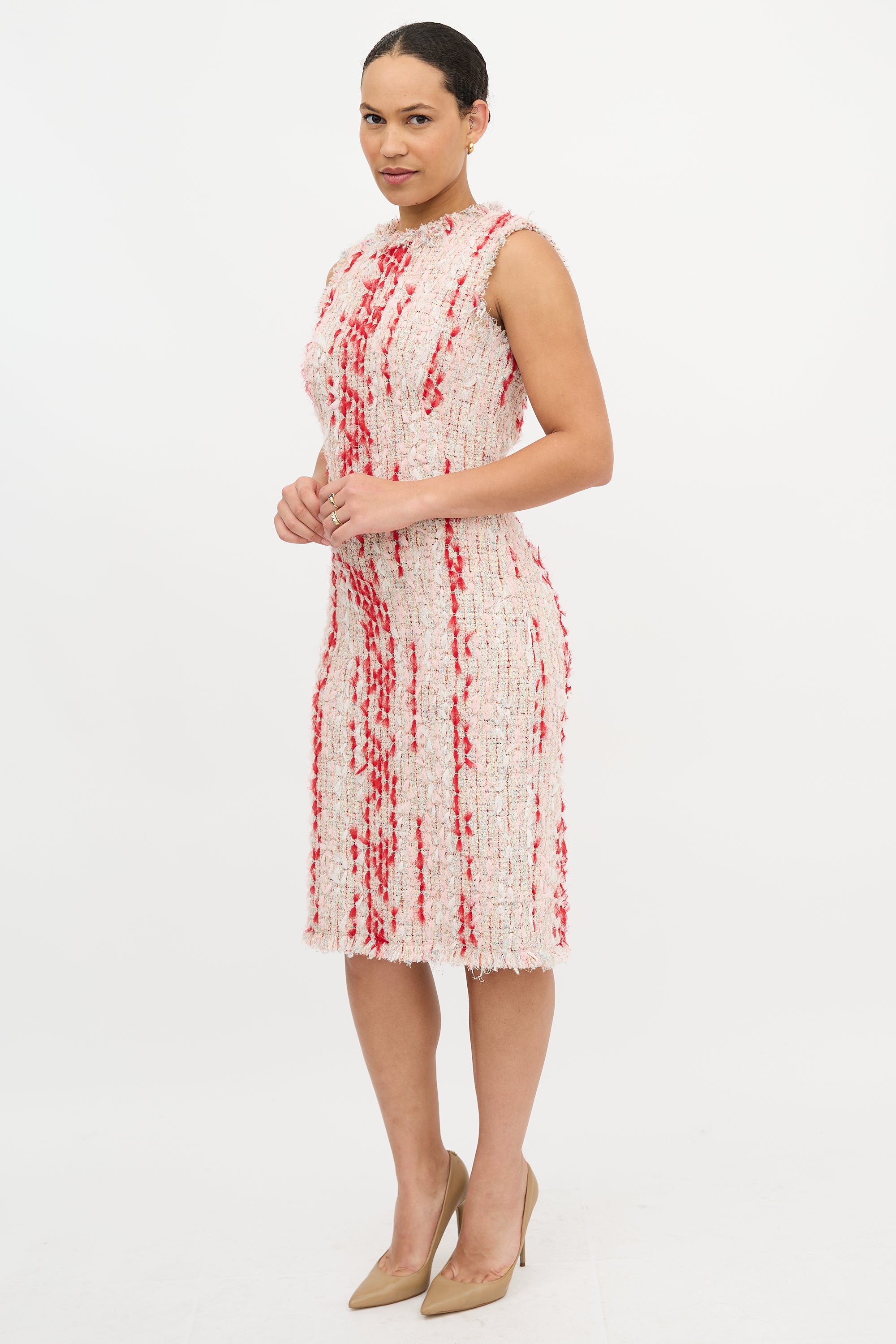 Pre-owned Alexander McQueen pink, red, and multicolour tweed sheath dress featuring a round neckline, back zip closure, frayed raw edges throughout, kick pleat at back, and raw edge hem. Lined. Sarah Burton era design.