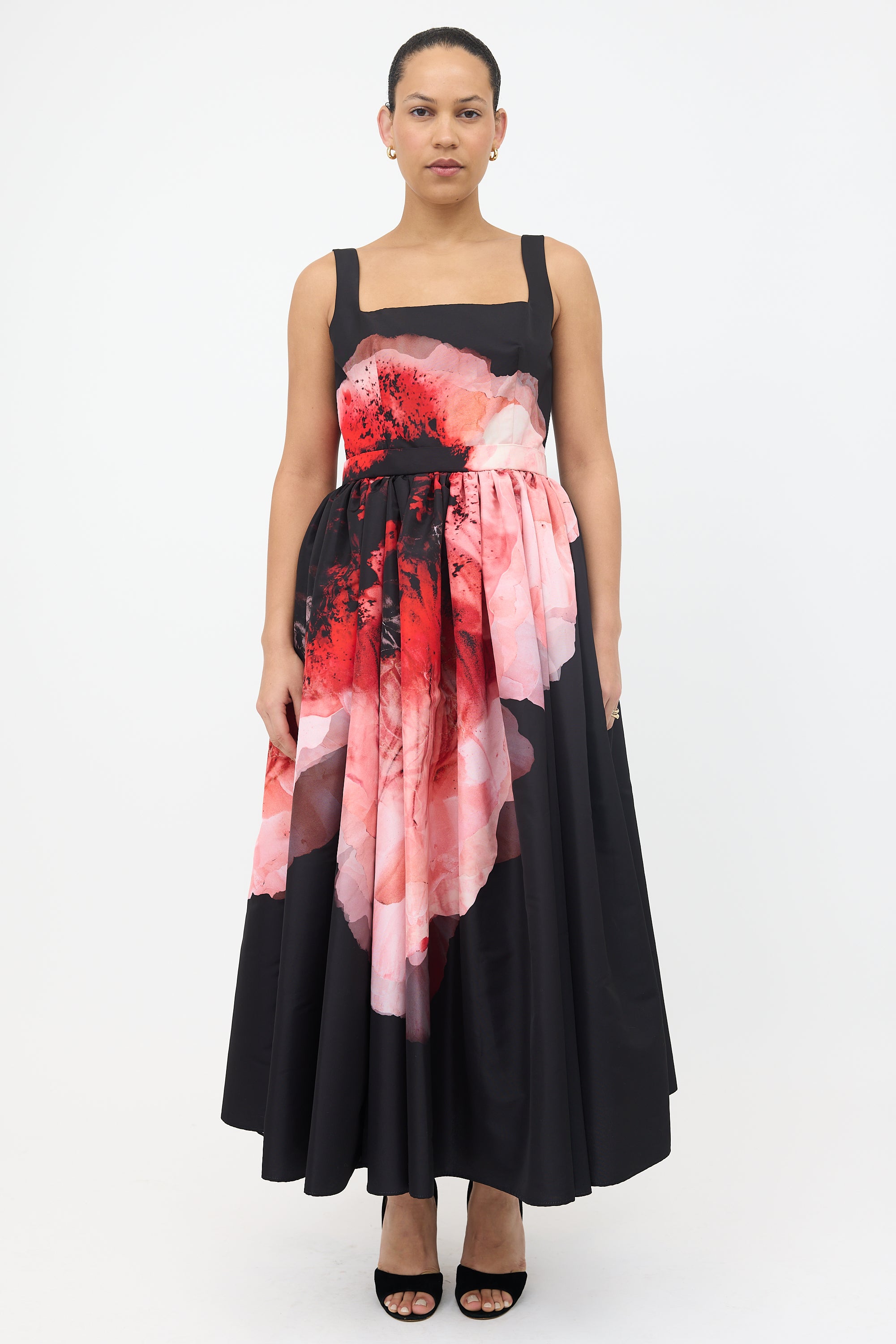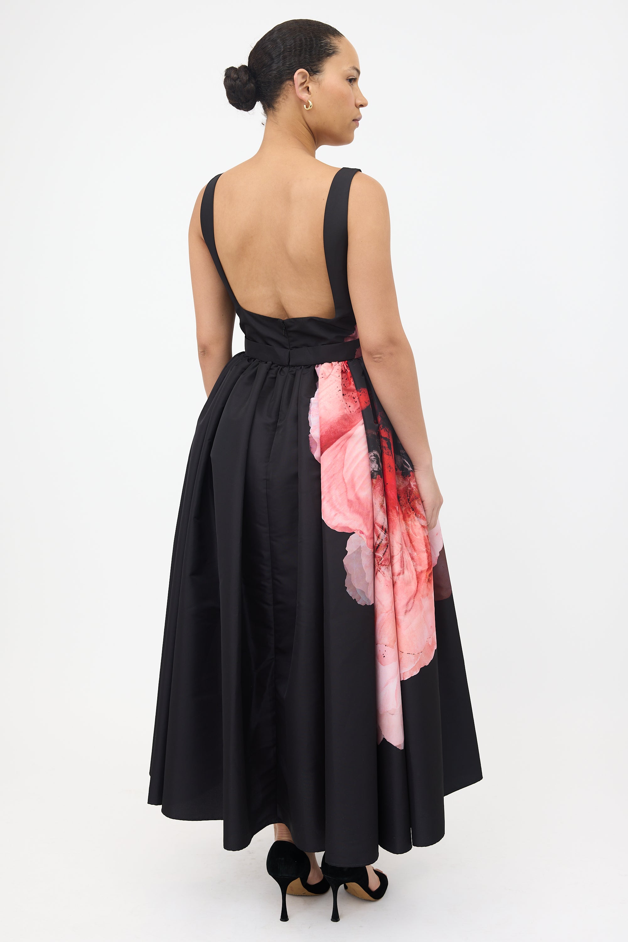 Pre-owned Alexander McQueen Fall/Winter 2021 black polyfaille maxi dress featuring a multicolour digital Anemone flower print, scoop neckline, gathered waist, concealed back zip, and in seam pockets. Sarah Burton era design.
