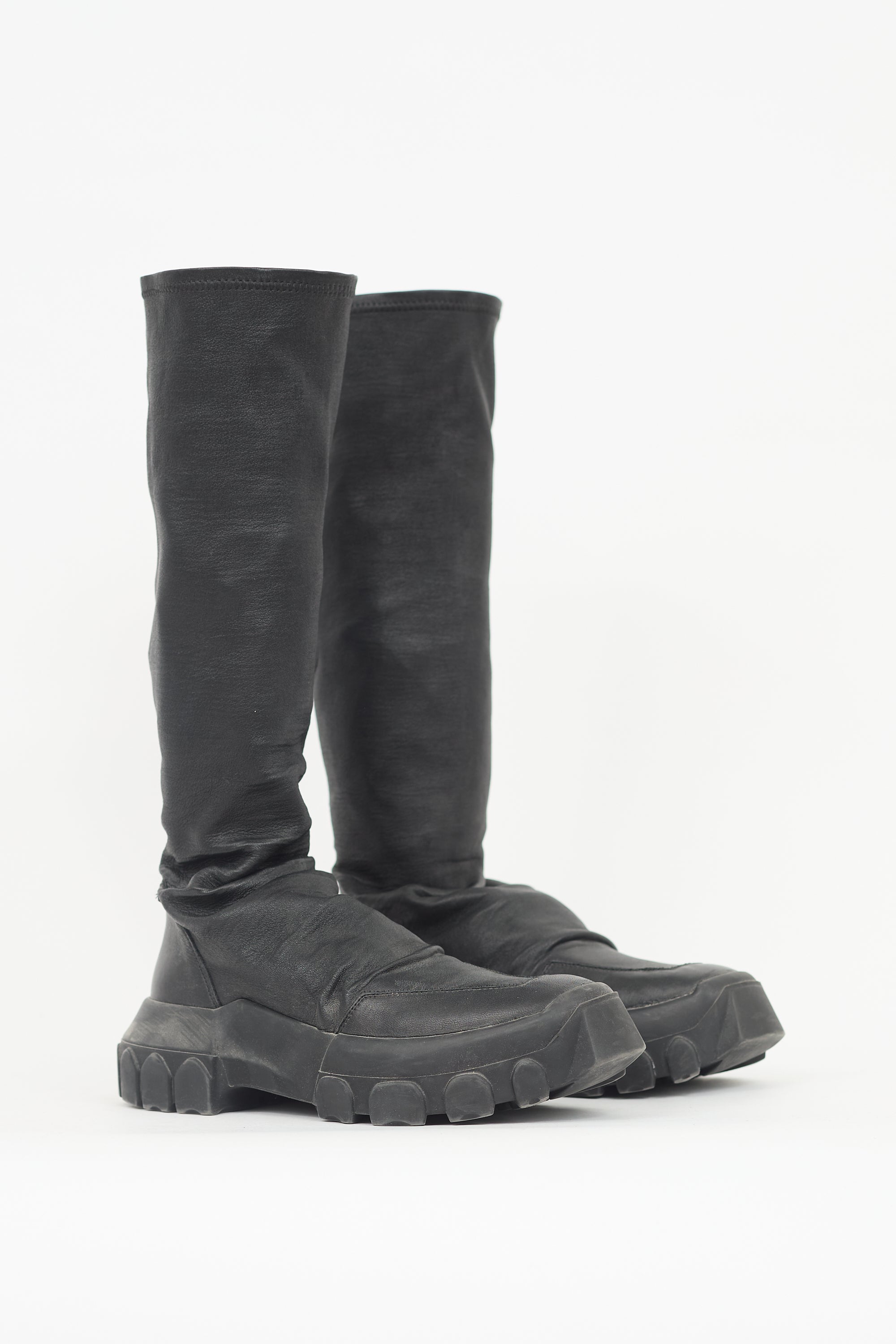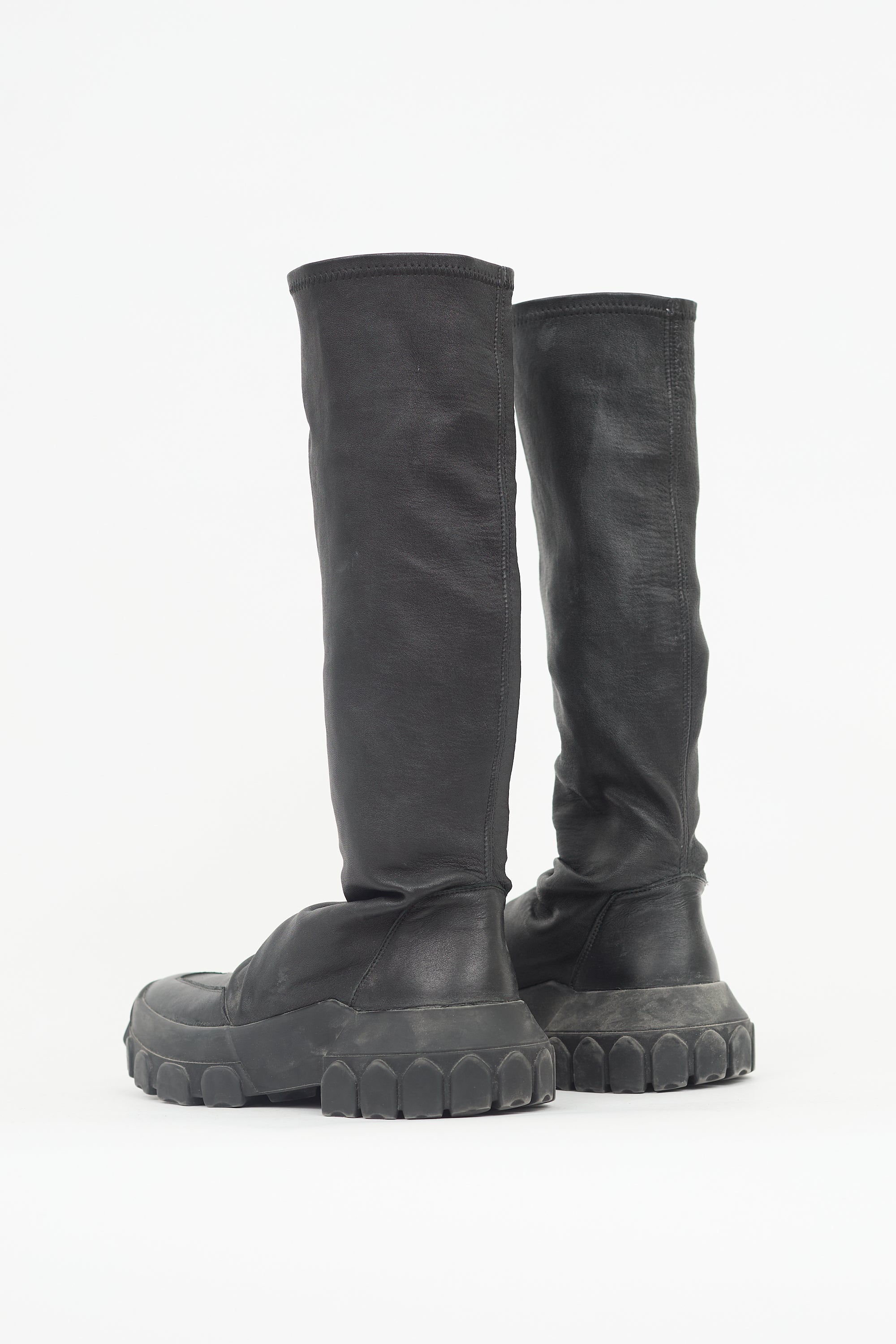 Pre-owned Rick Owens black leather Tractor Sock boots featuring rounded toe, stretch leather upper, pull on entry, and chunky rubber sole. Comes with original box, dust bags, and care guide.
