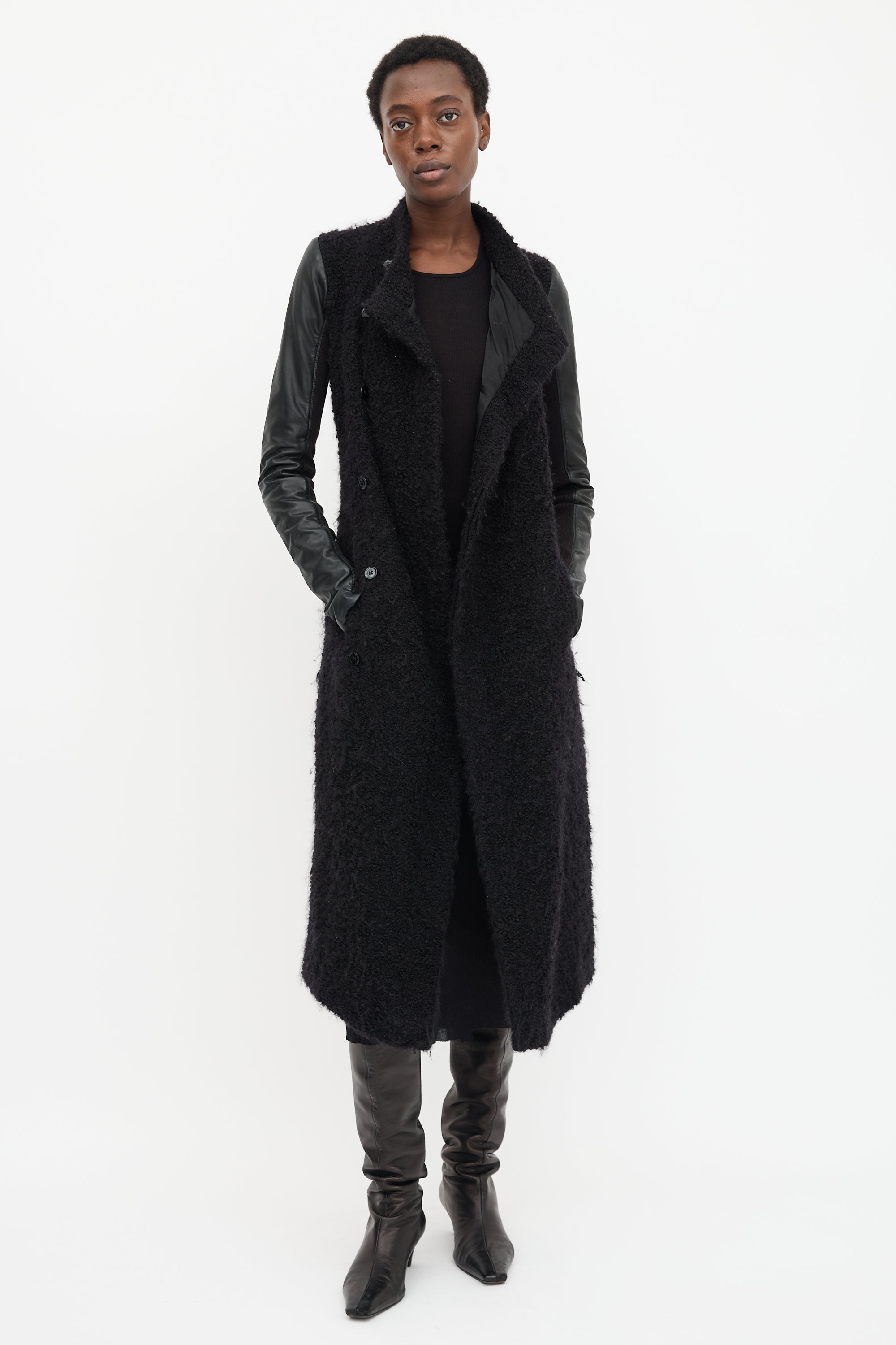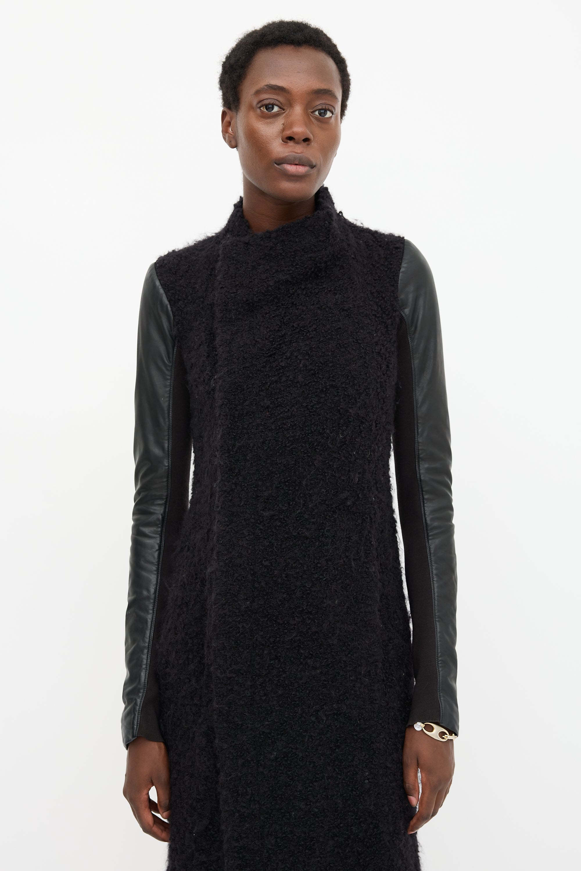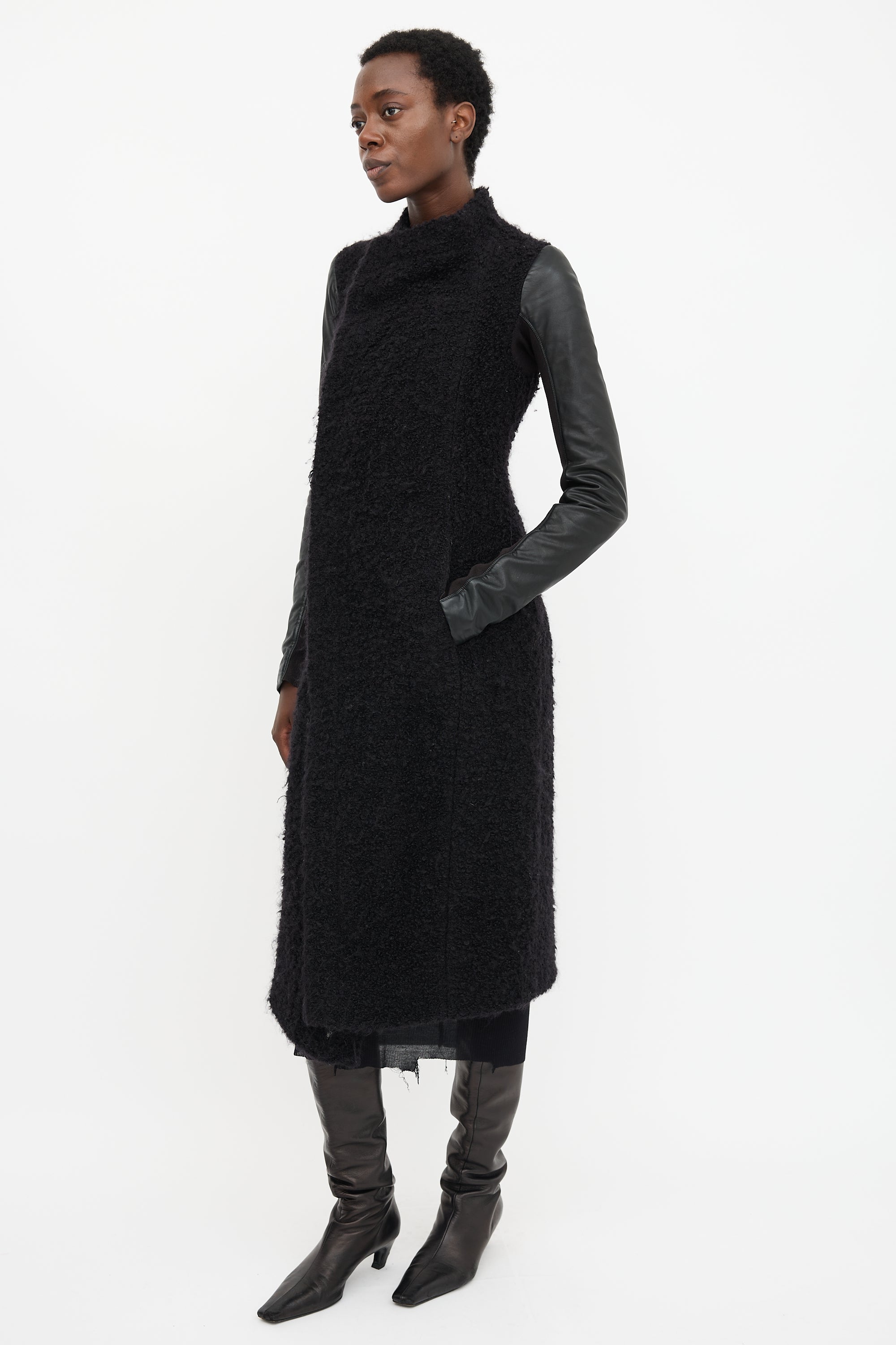 Pre-owned Rick Owens black coat featuring wool blend boucle bodice, asymmetrical button up front, two front slip pockets, and leather sleeves with ribbed knit panels. Lined.