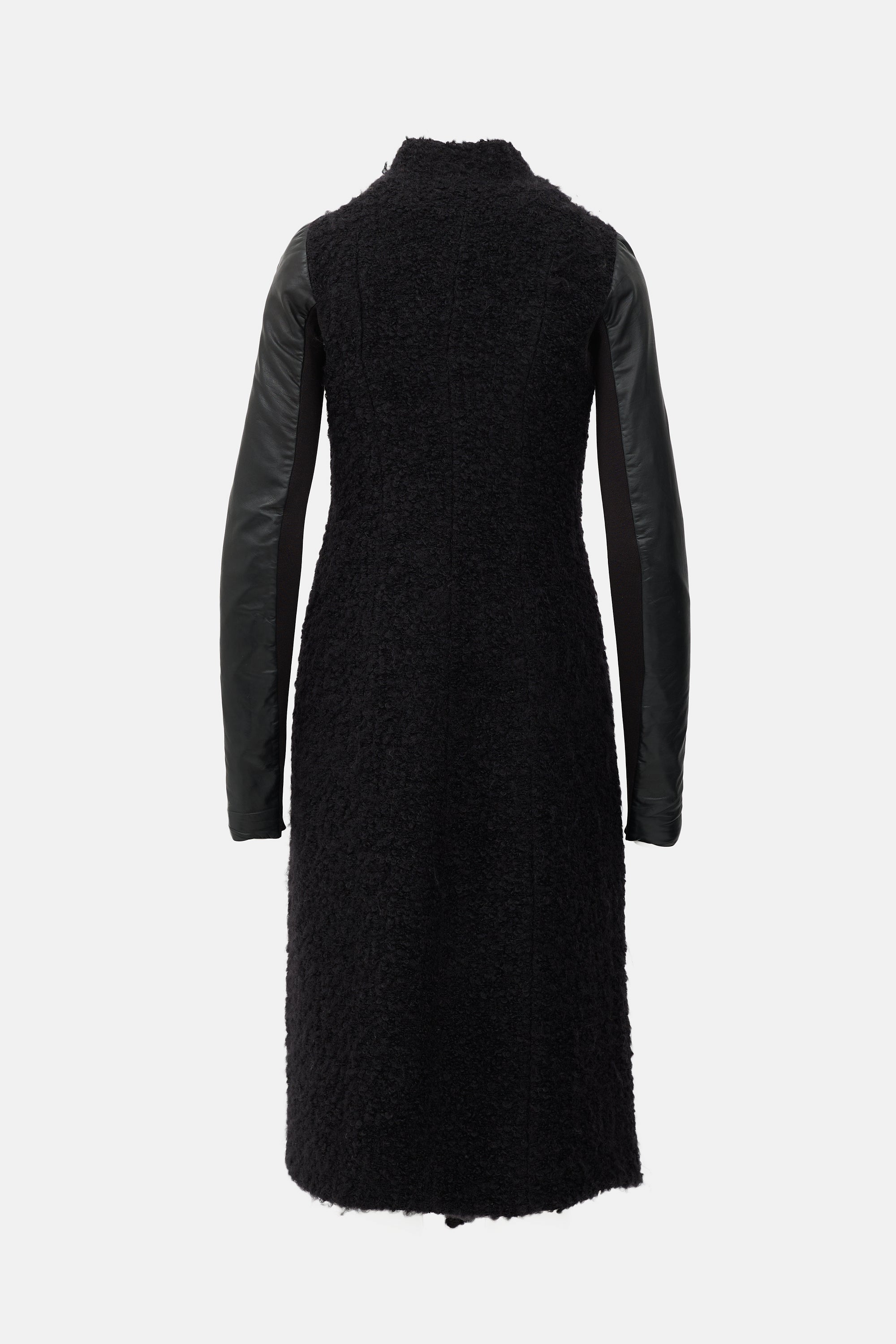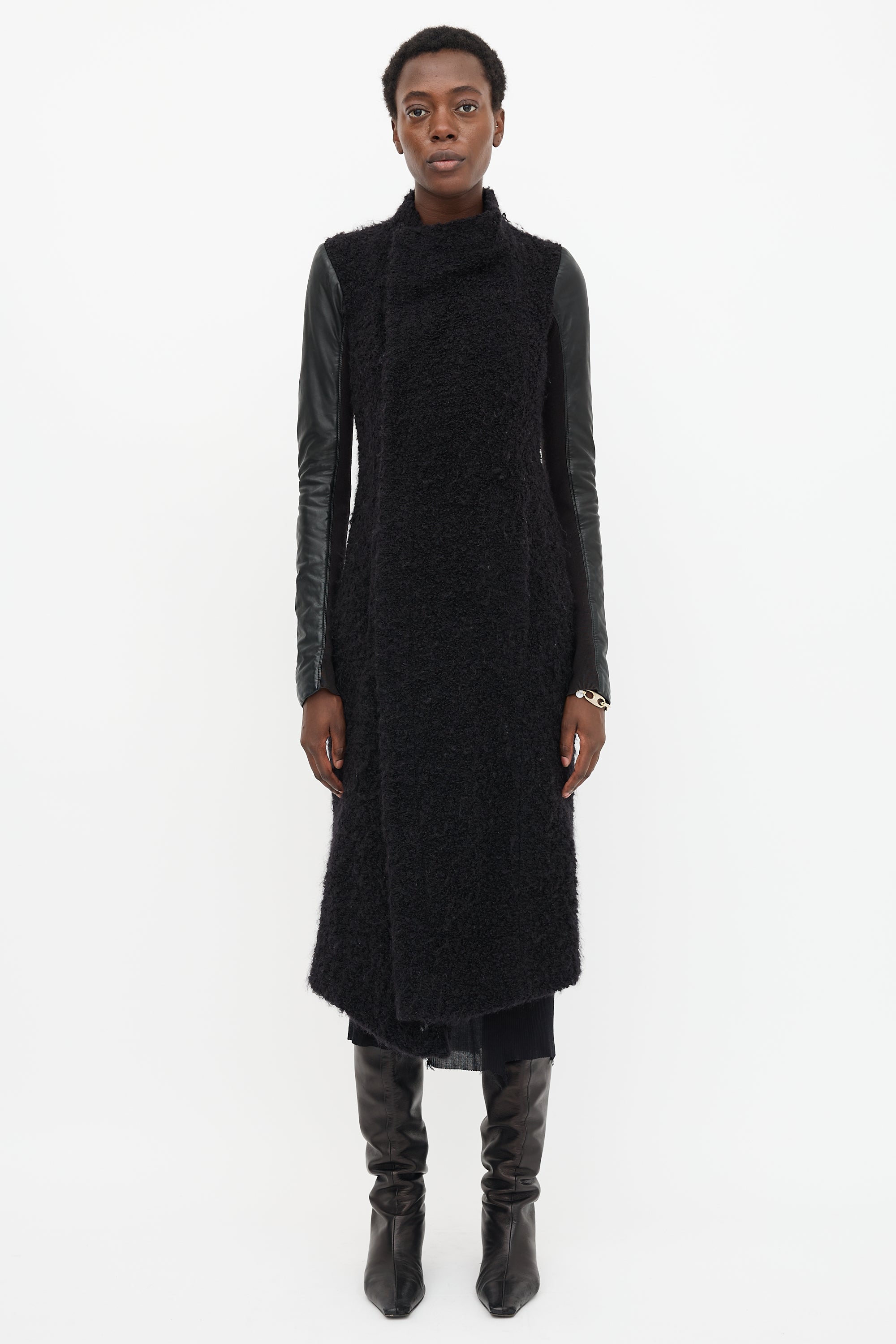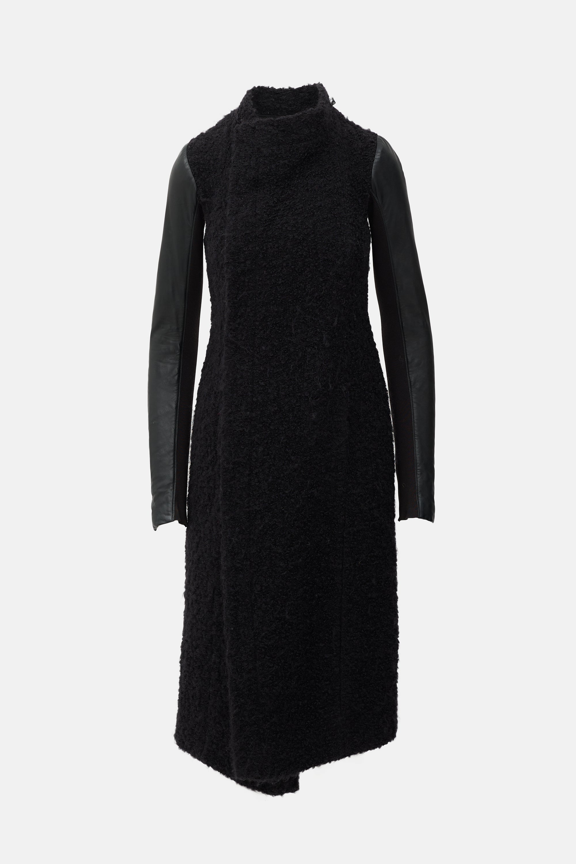 Pre-owned Rick Owens black coat featuring wool blend boucle bodice, asymmetrical button up front, two front slip pockets, and leather sleeves with ribbed knit panels. Lined.