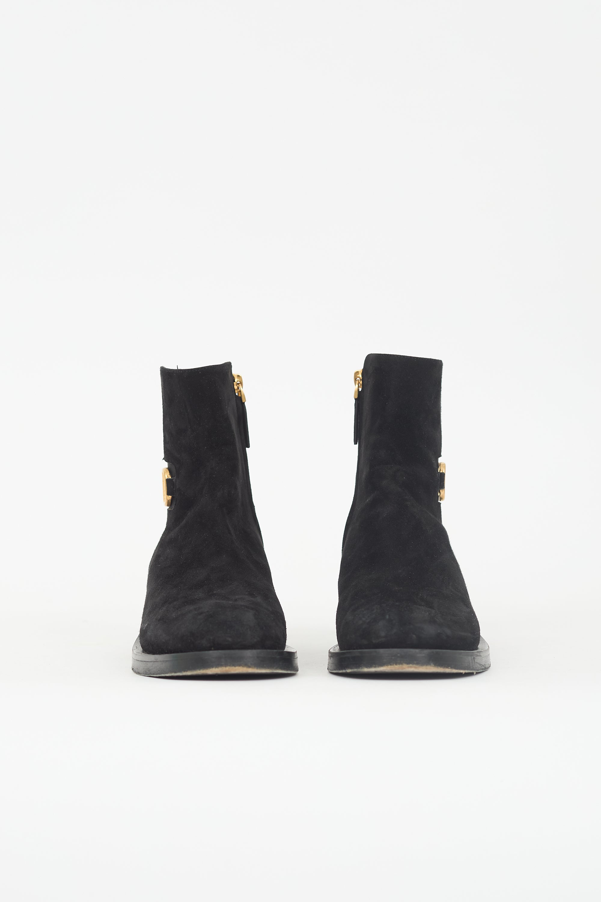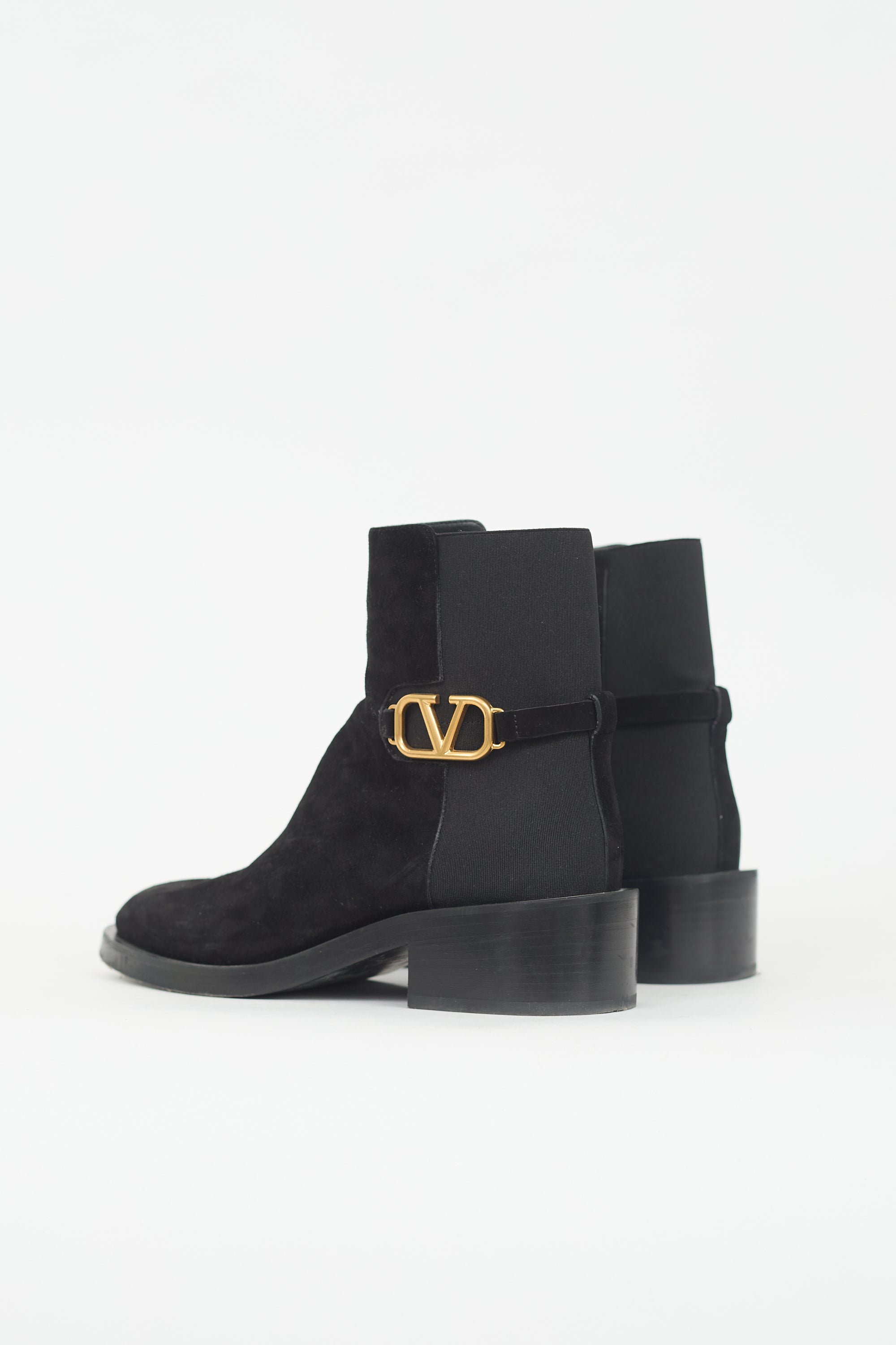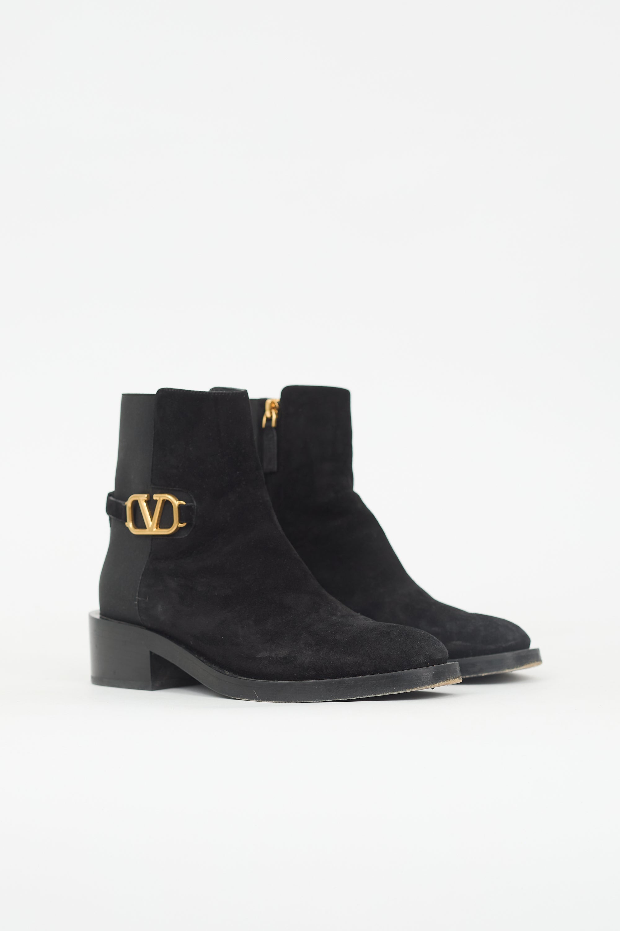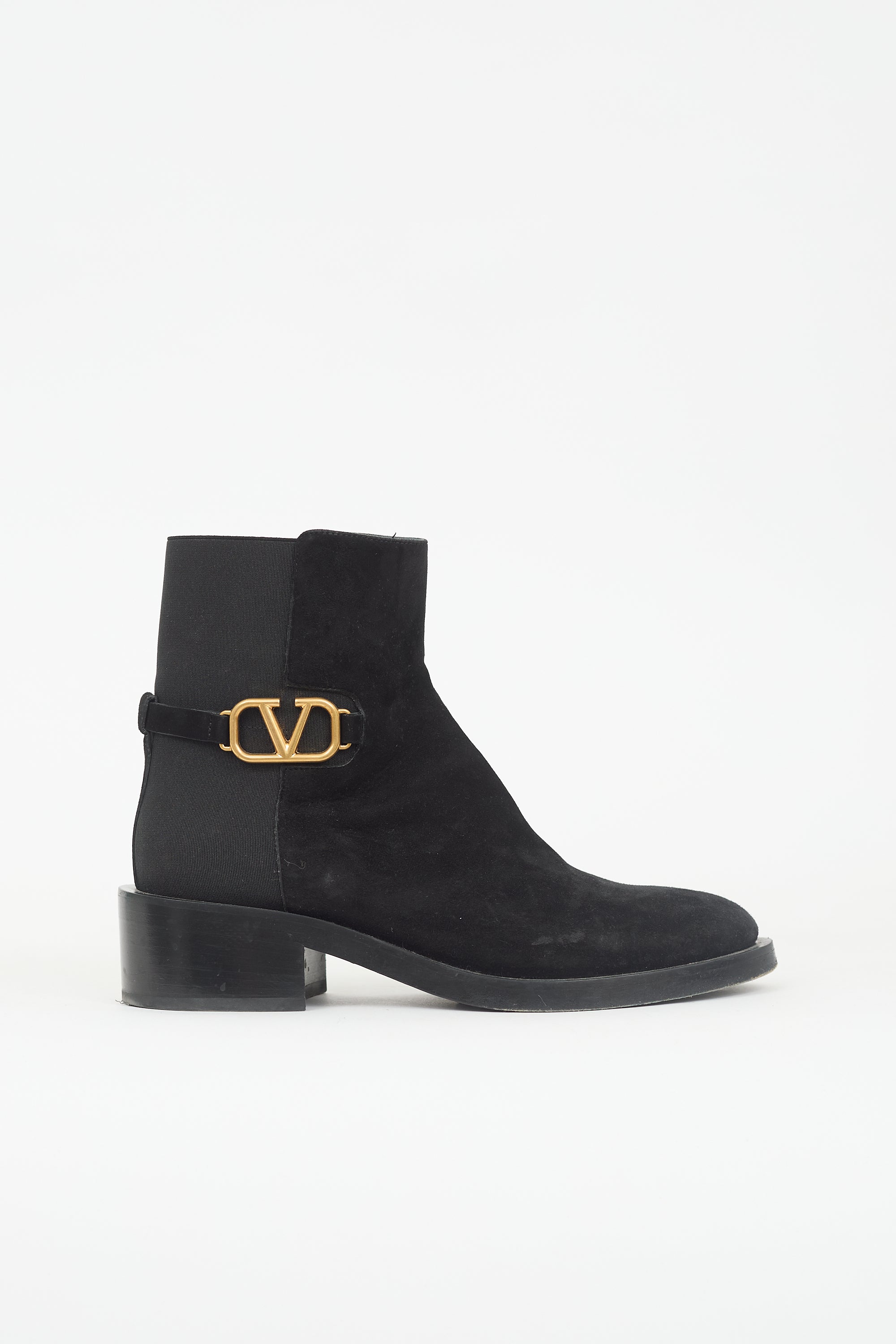 Pre-owned Valentino black suede ankle boots featuring a rounded toe, side zip, elasticized gore panel at counter, leather ankle strap with gold tone Vlogo hardware, and stacked heel.