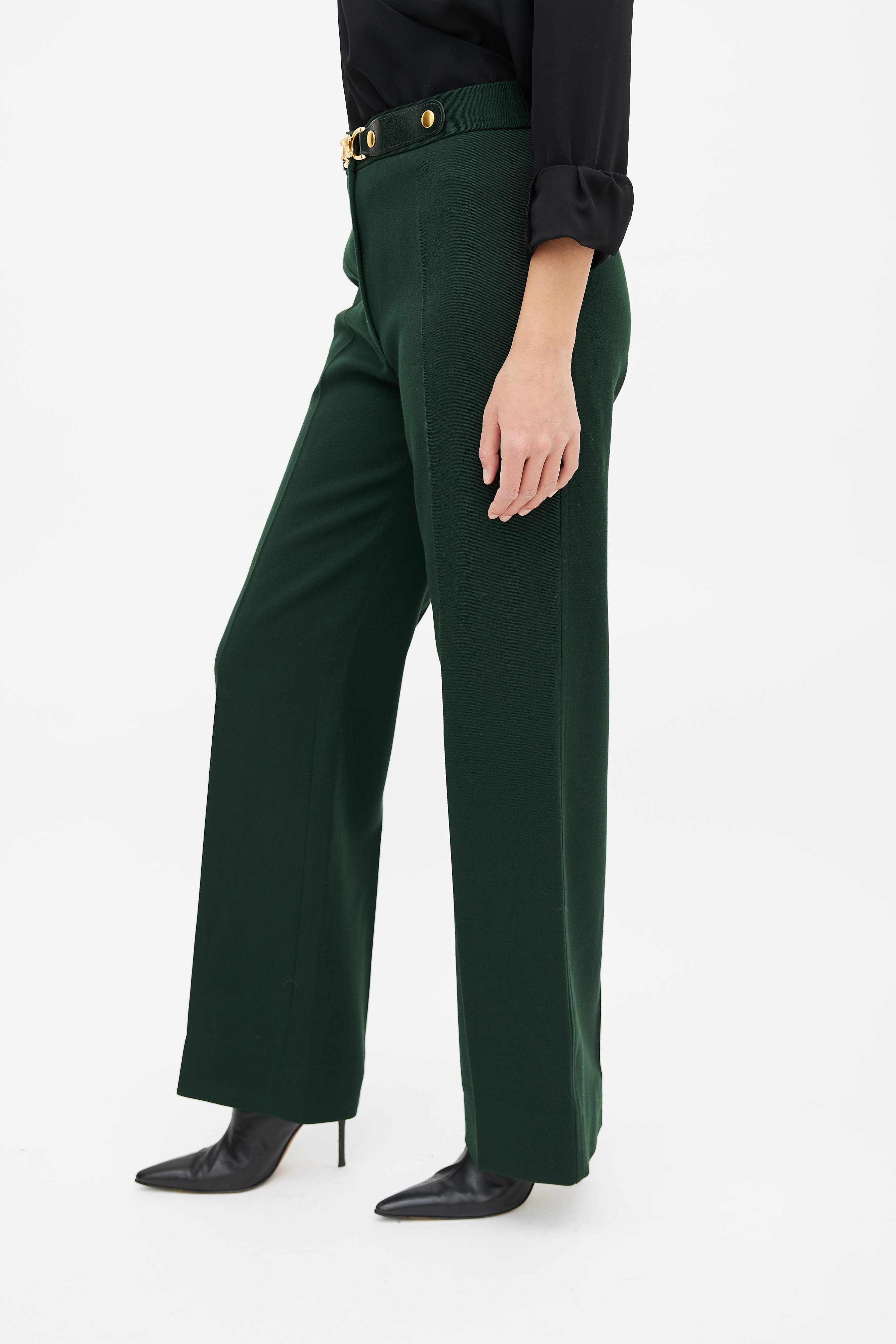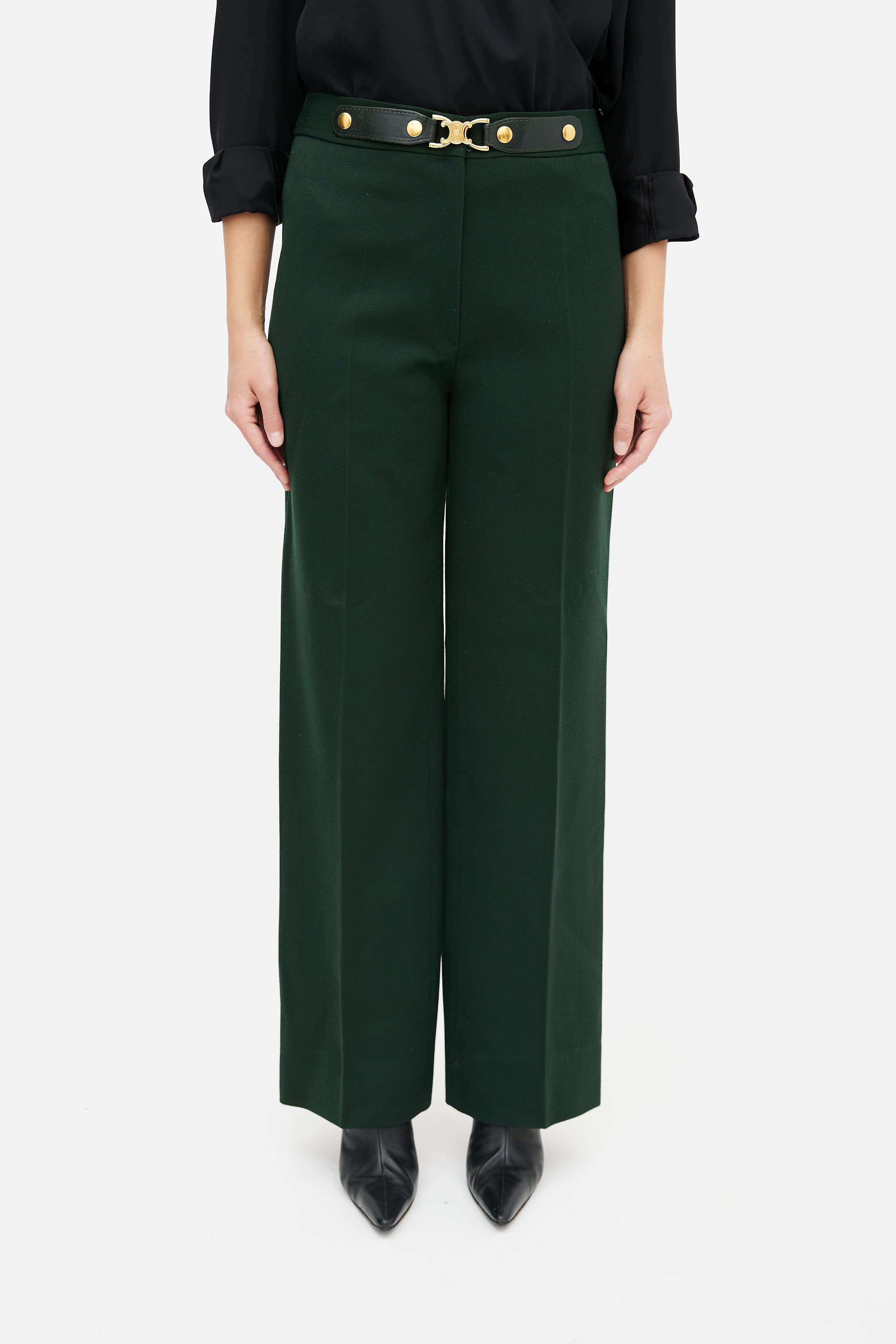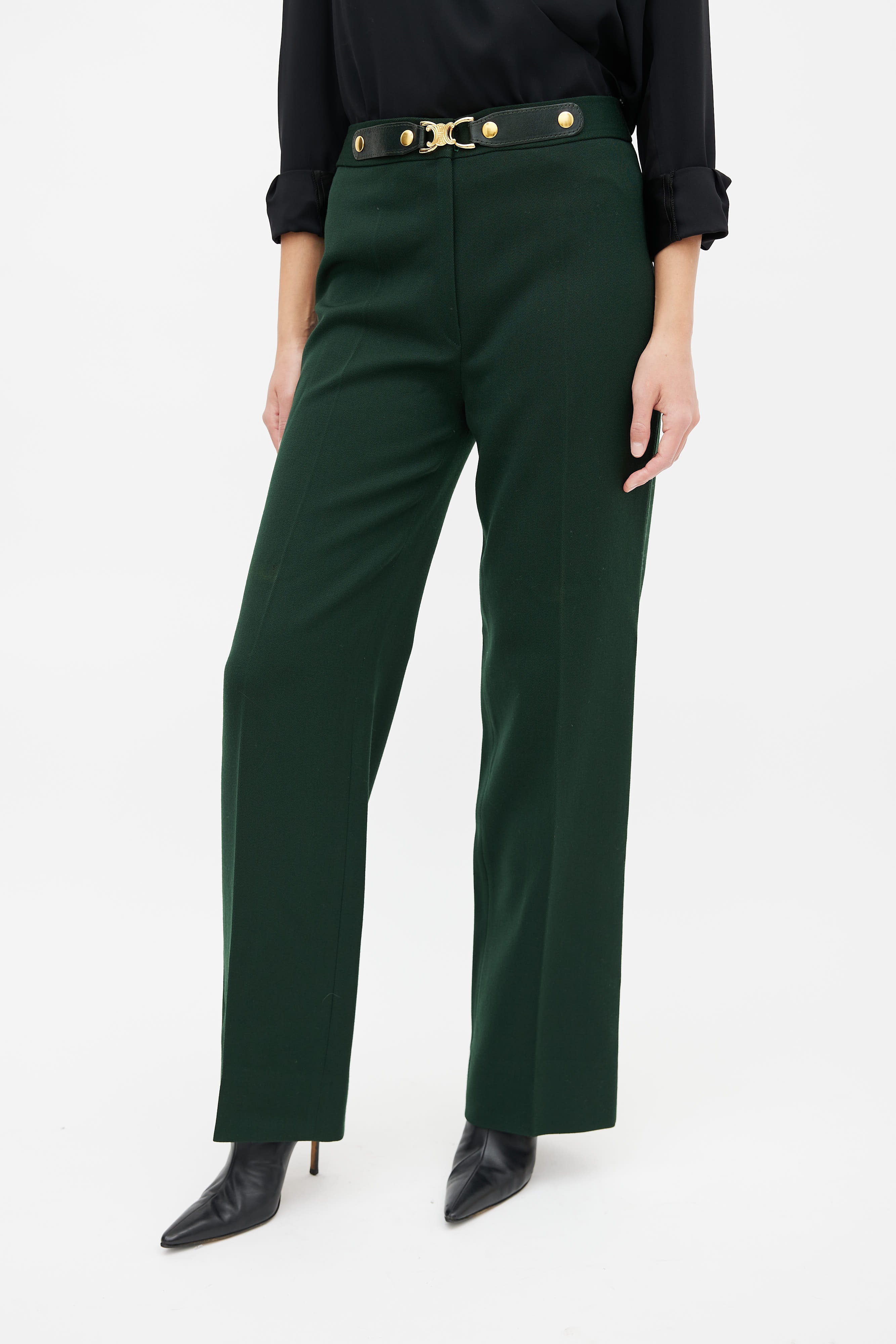 Pre-owned Celine green and gold belted trouser featuring a high waisted fit, zip fly, gold-tone metal Triomphe motif and black leather belt detail at waist and a straight leg fit.
