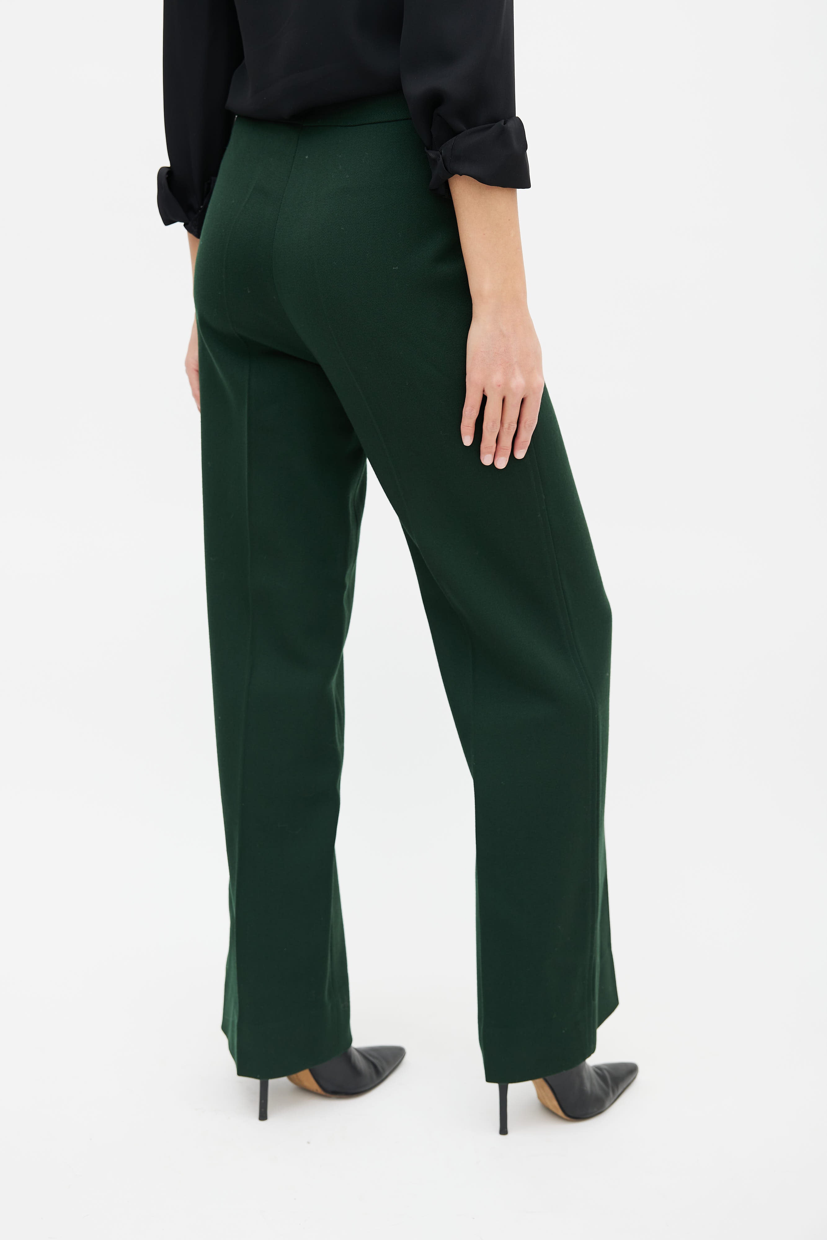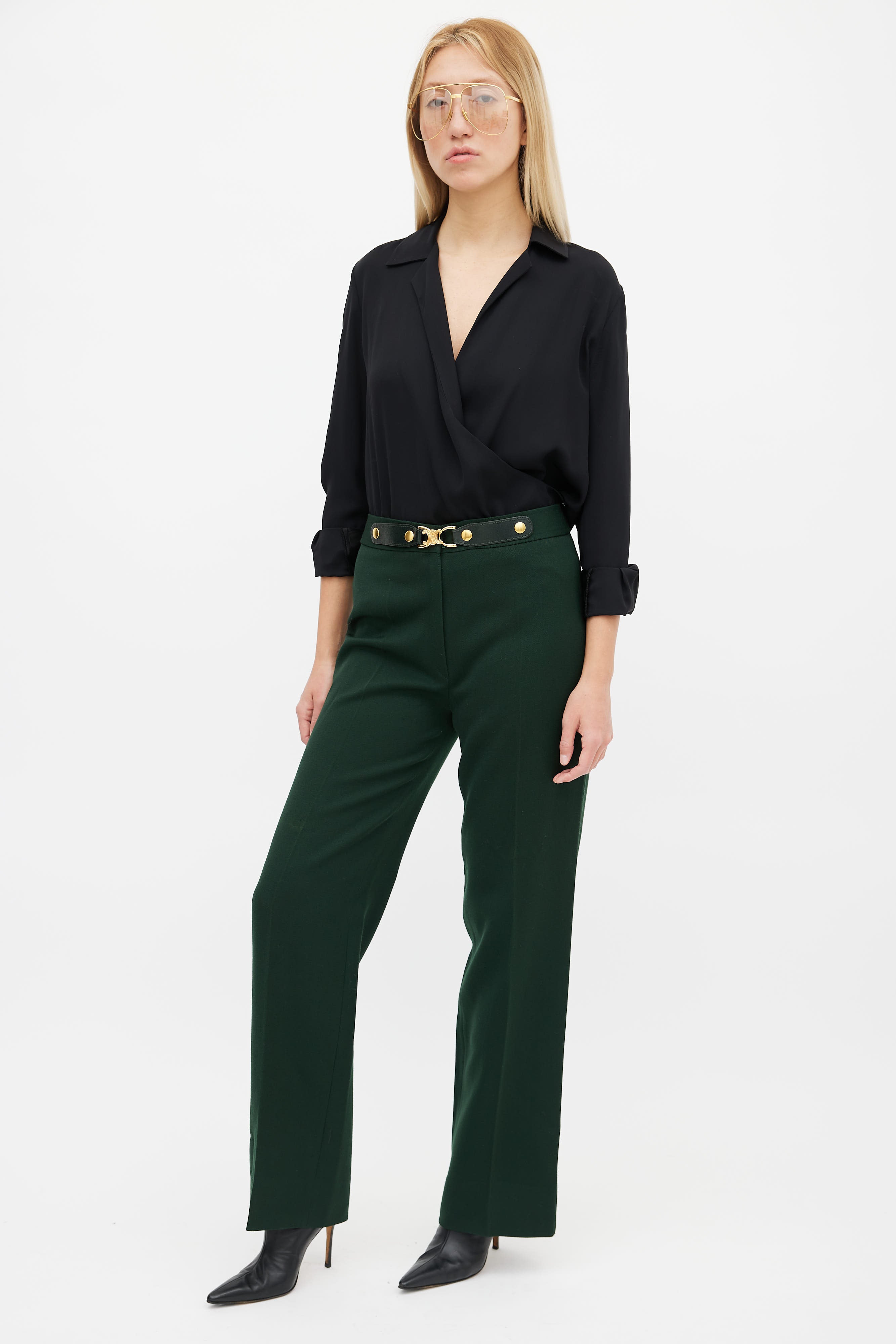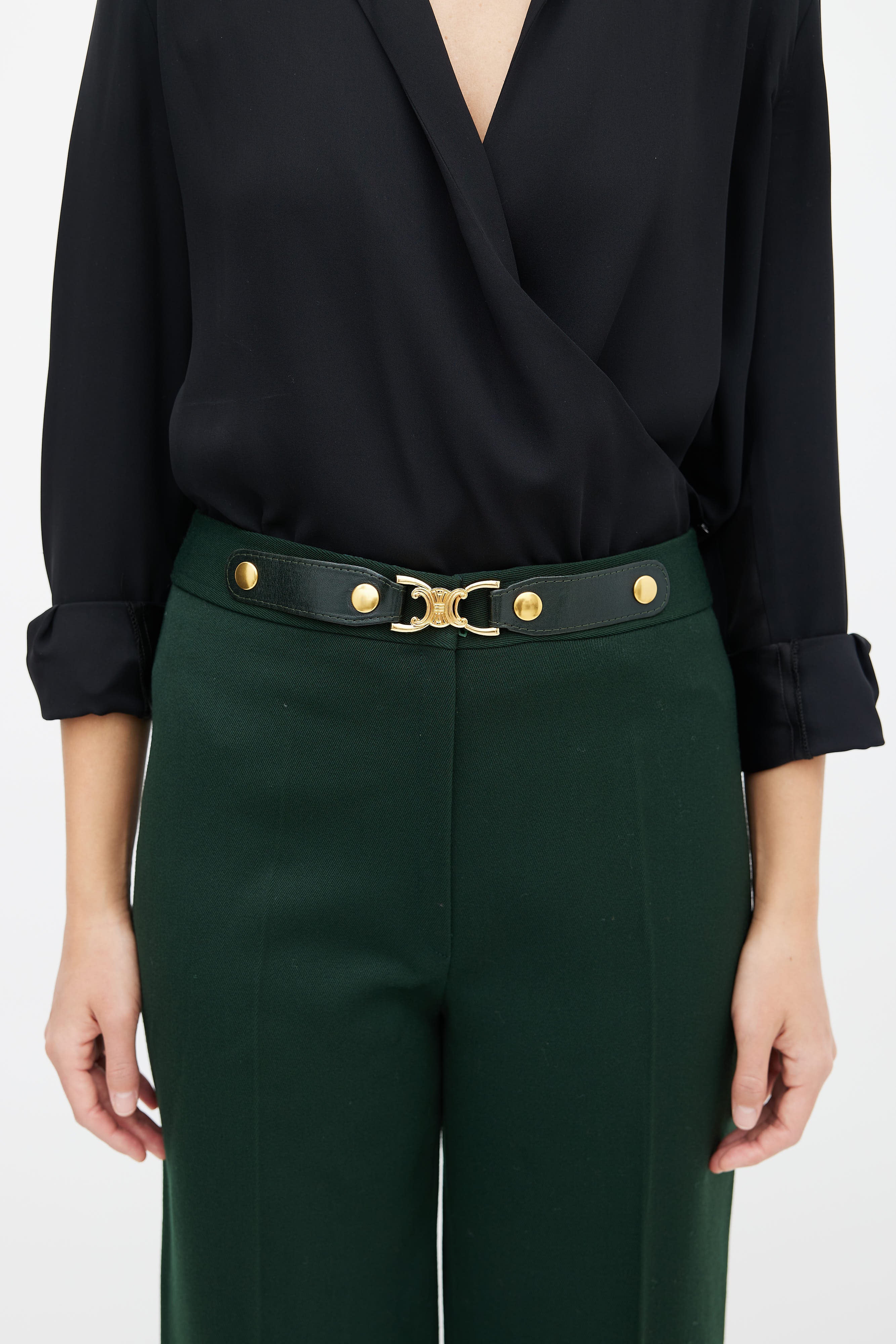 Pre-owned Celine green and gold belted trouser featuring a high waisted fit, zip fly, gold-tone metal Triomphe motif and black leather belt detail at waist and a straight leg fit.