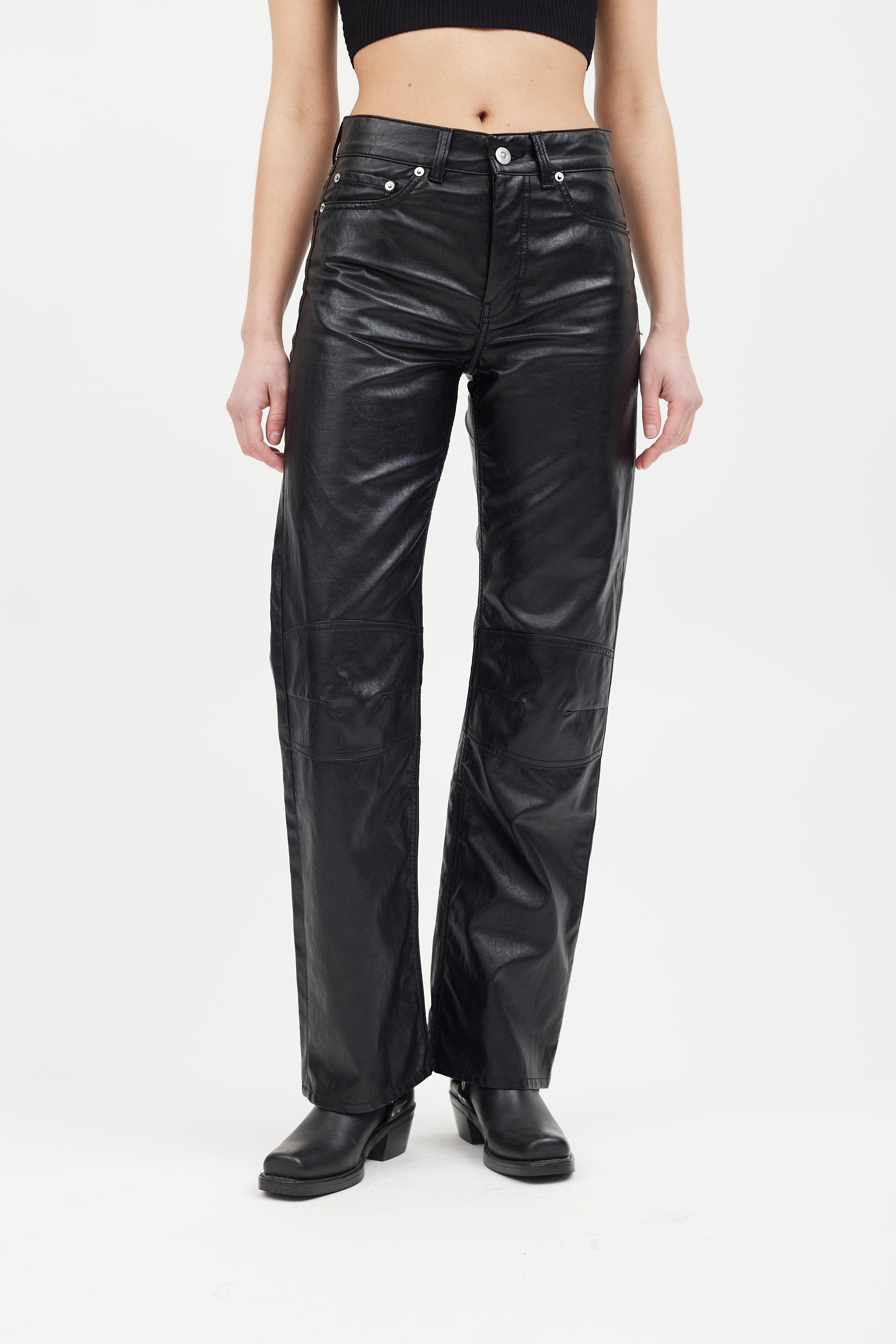 Pre-owned Our Legacy black faux leather Linear Moto pants featuring five pocket styling, belt loops, button fly, knee panels, and clear jacron patch at back.