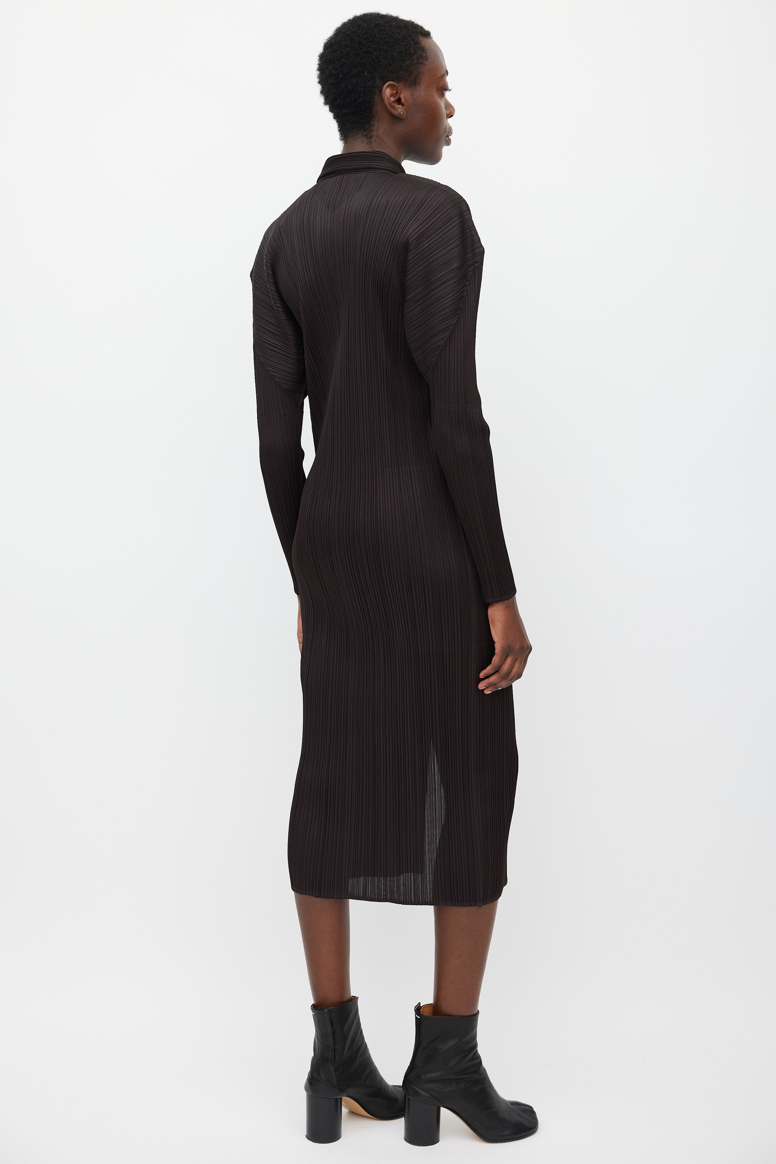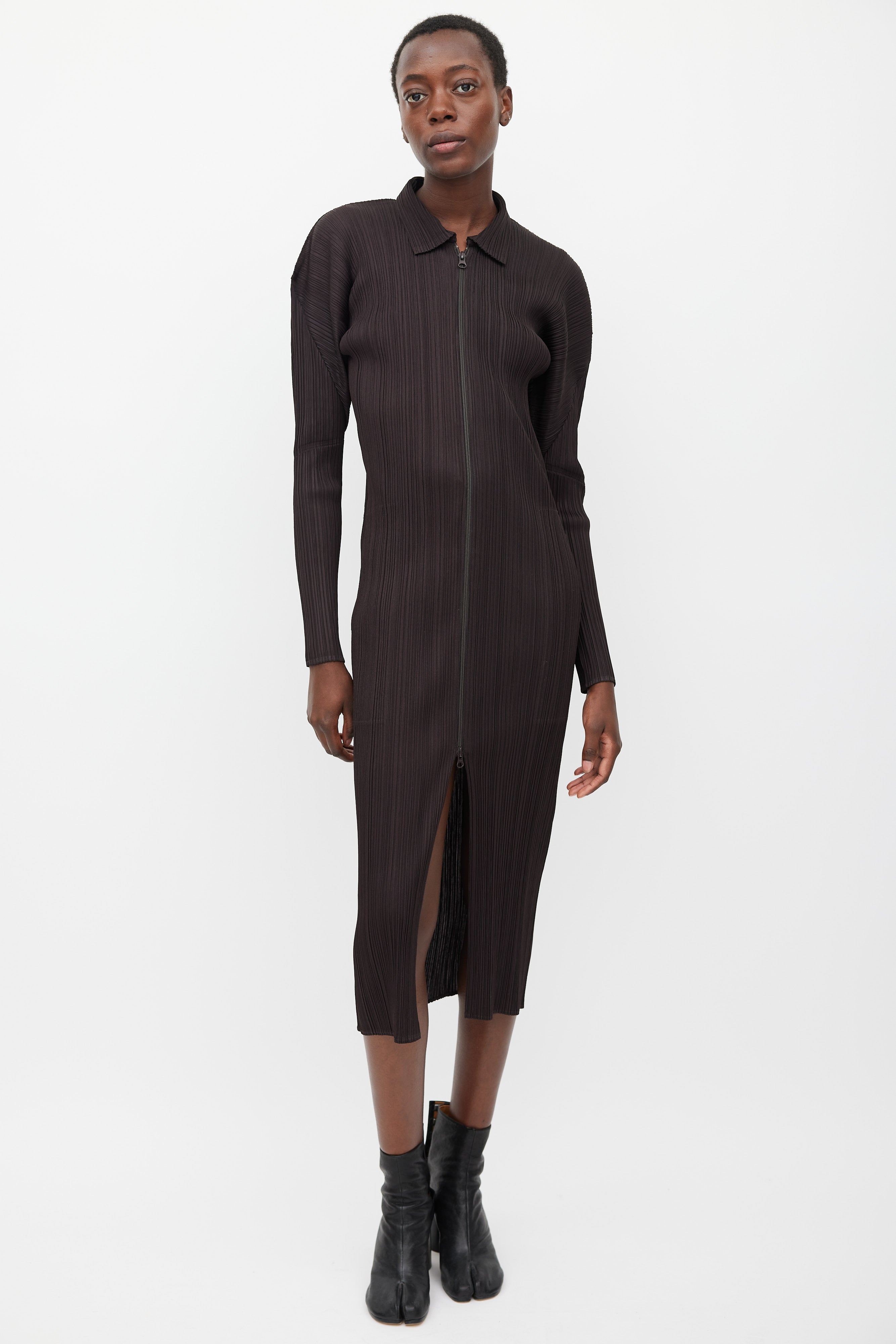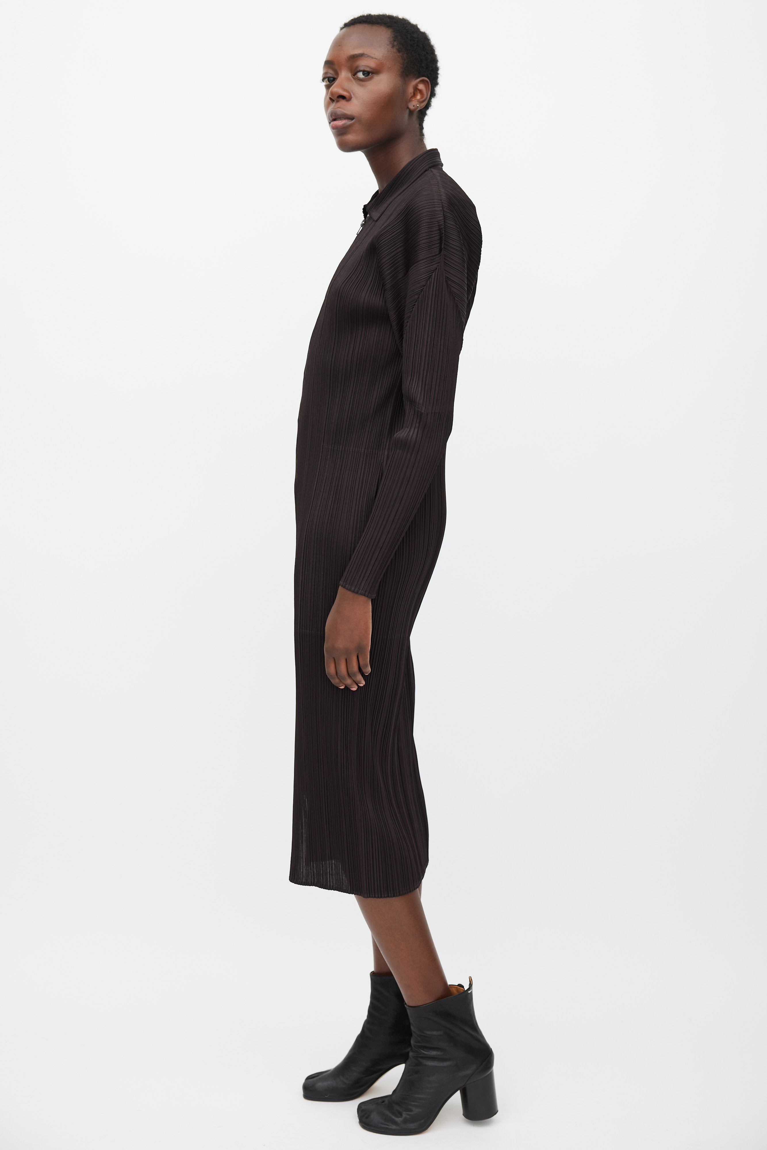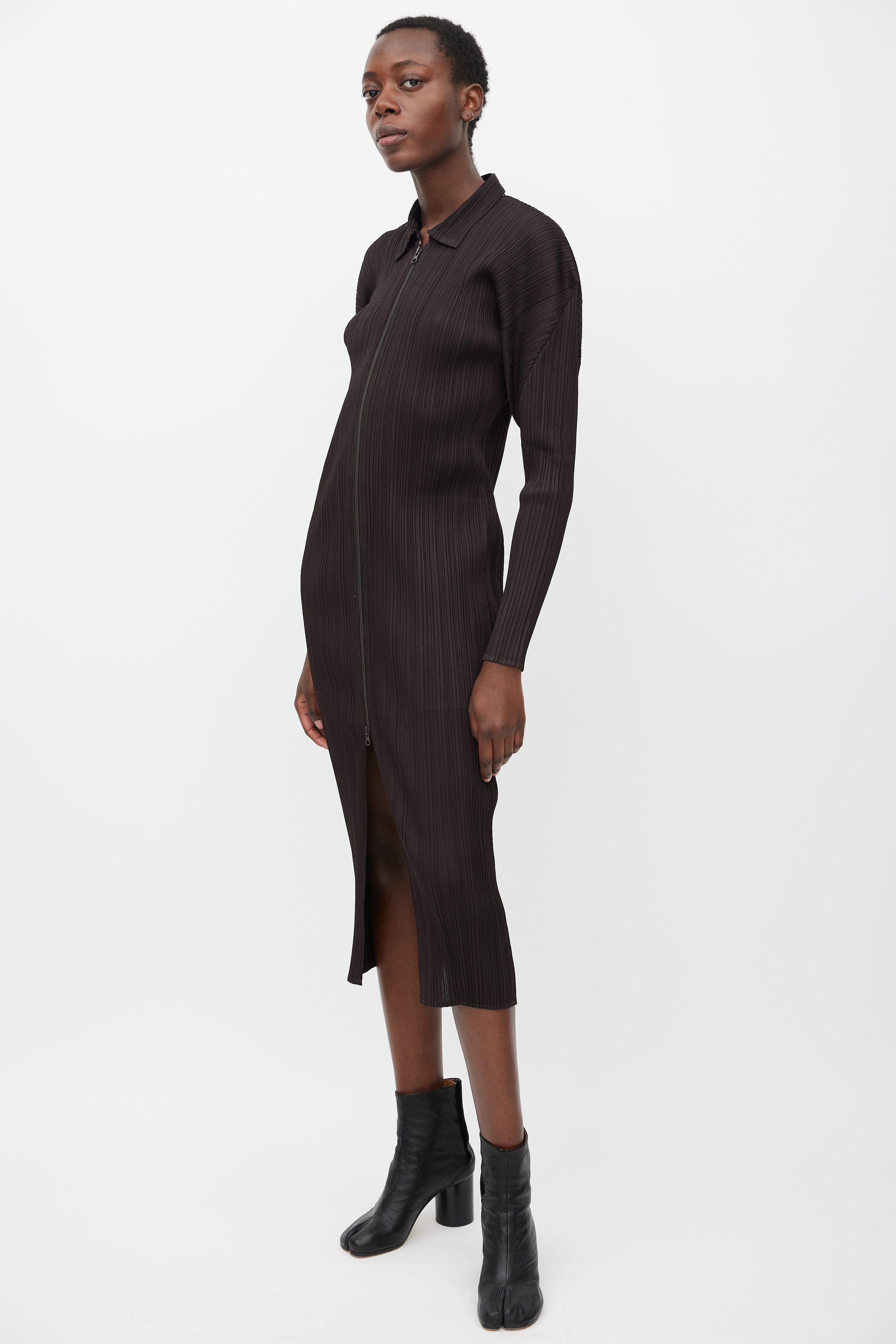Pre-owned Pleats Please Issey Miyake dark brown dress featuring plisse throughout, pointed collar, two-way zip closure, structured dolman sleeves, and two hip pockets. Unlined.