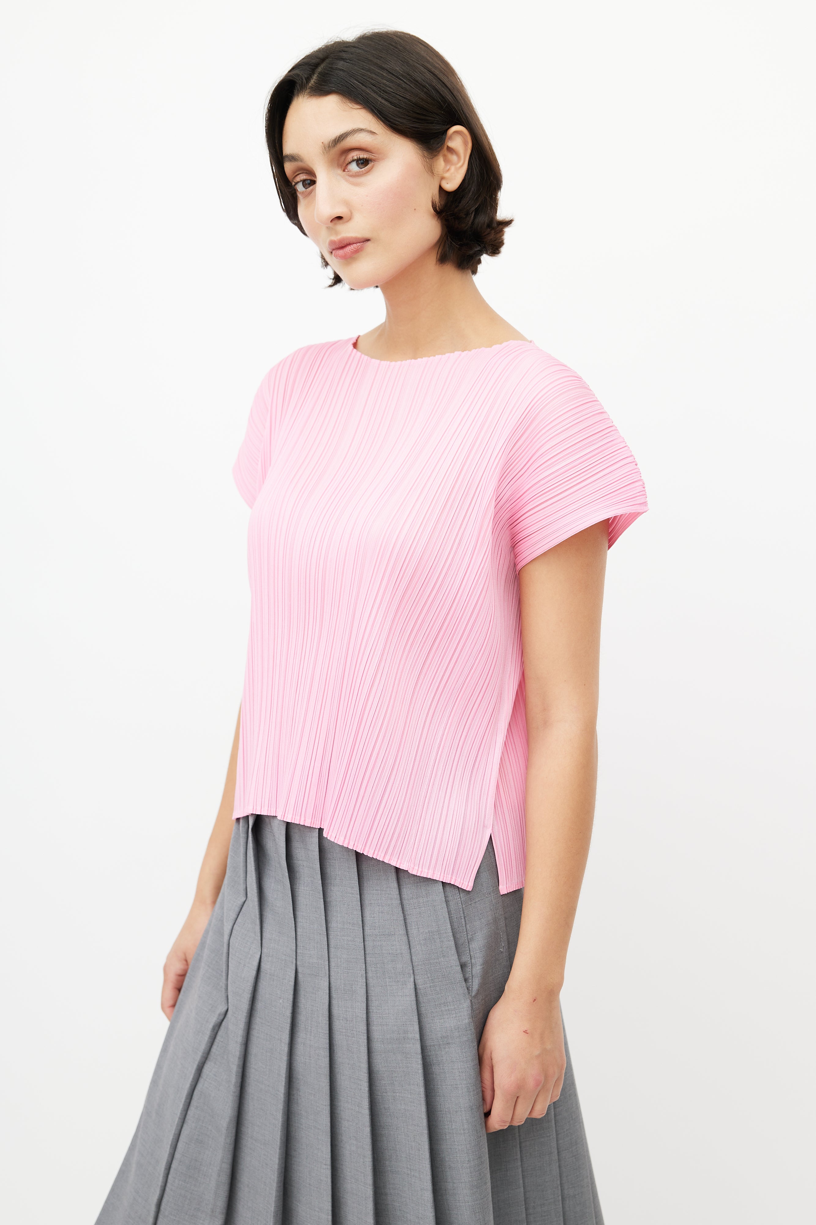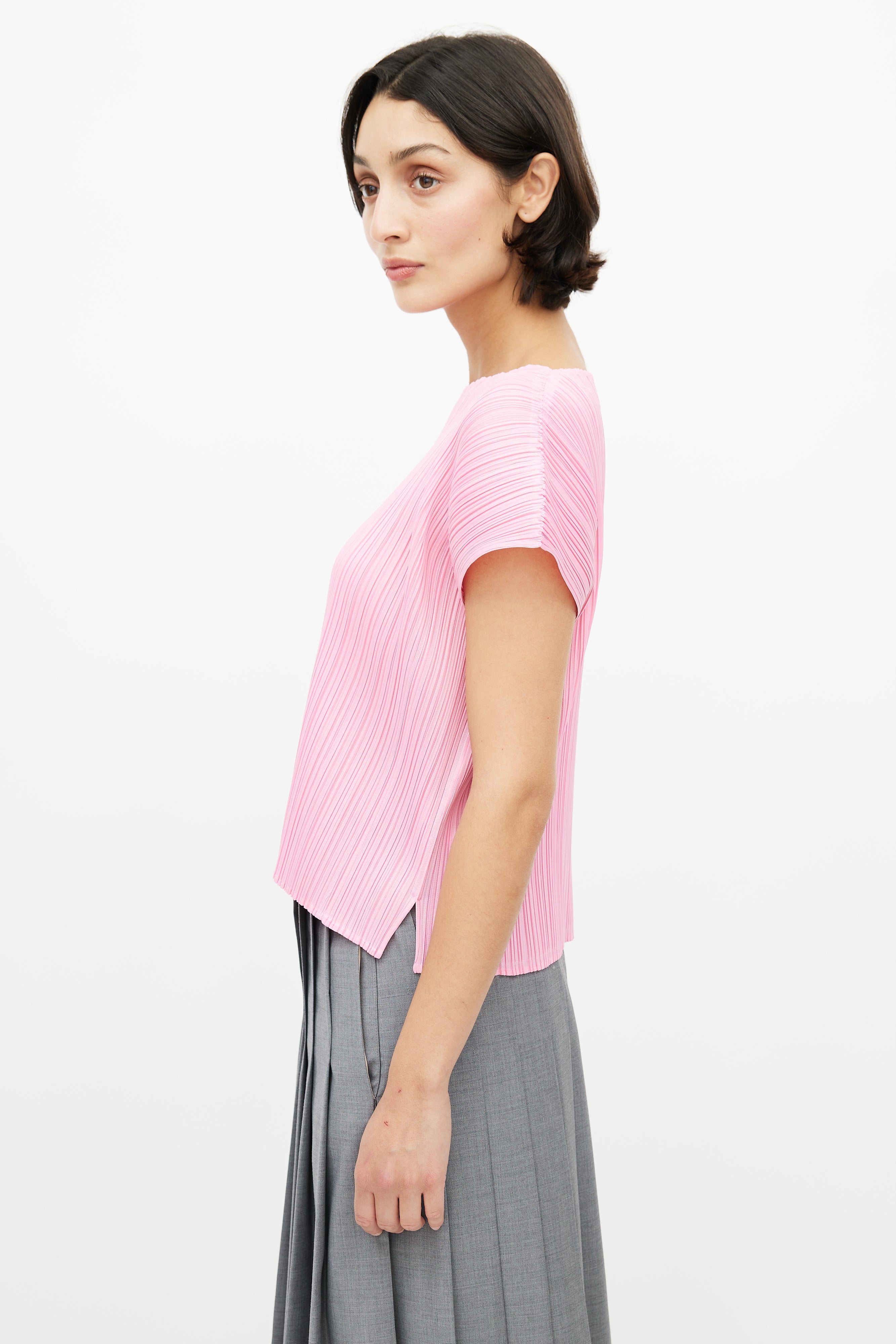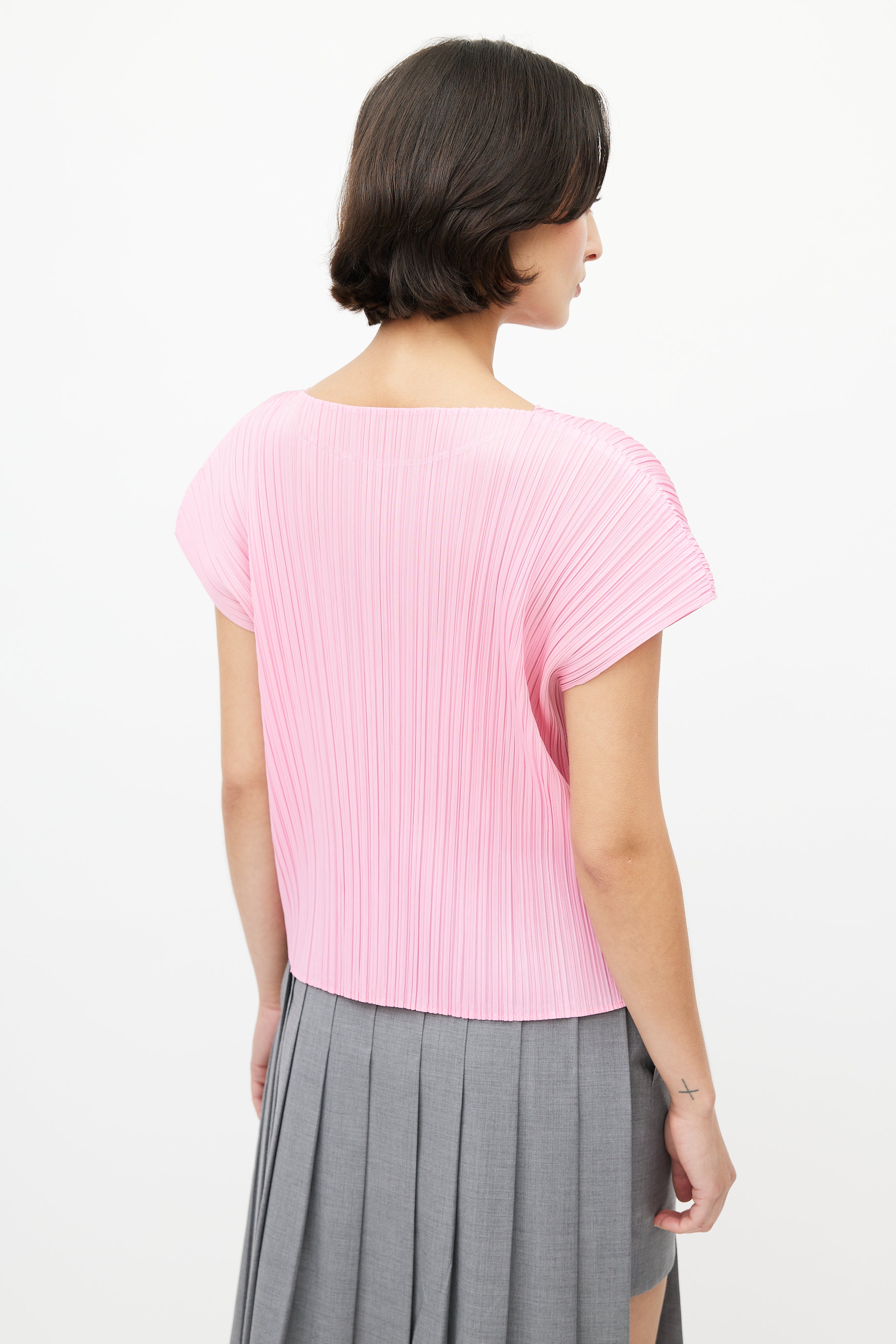 Pre-owned Pleats Please Issey Miyake pink top featuring wide neckline, cap sleeves, and tight pleating throughout.