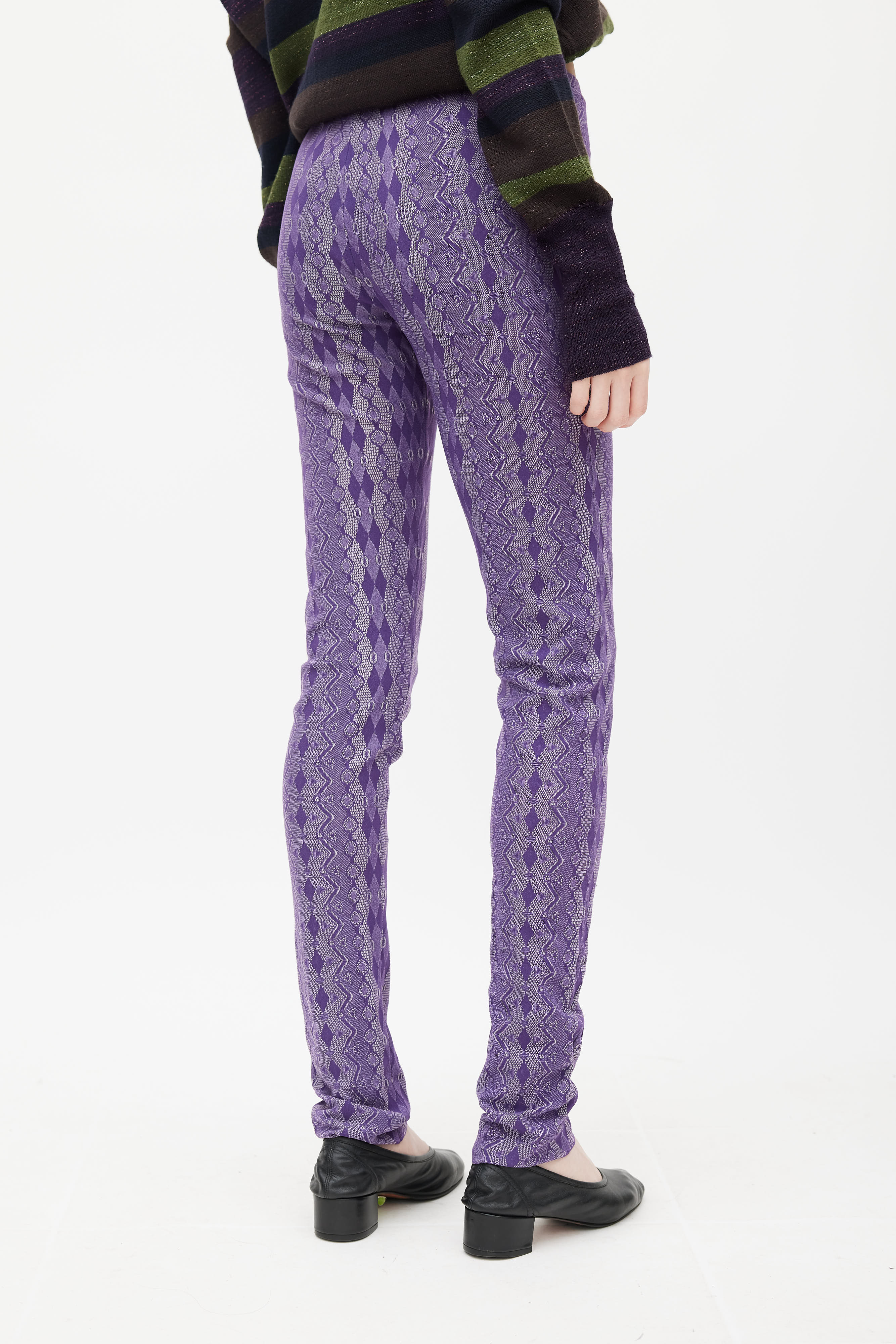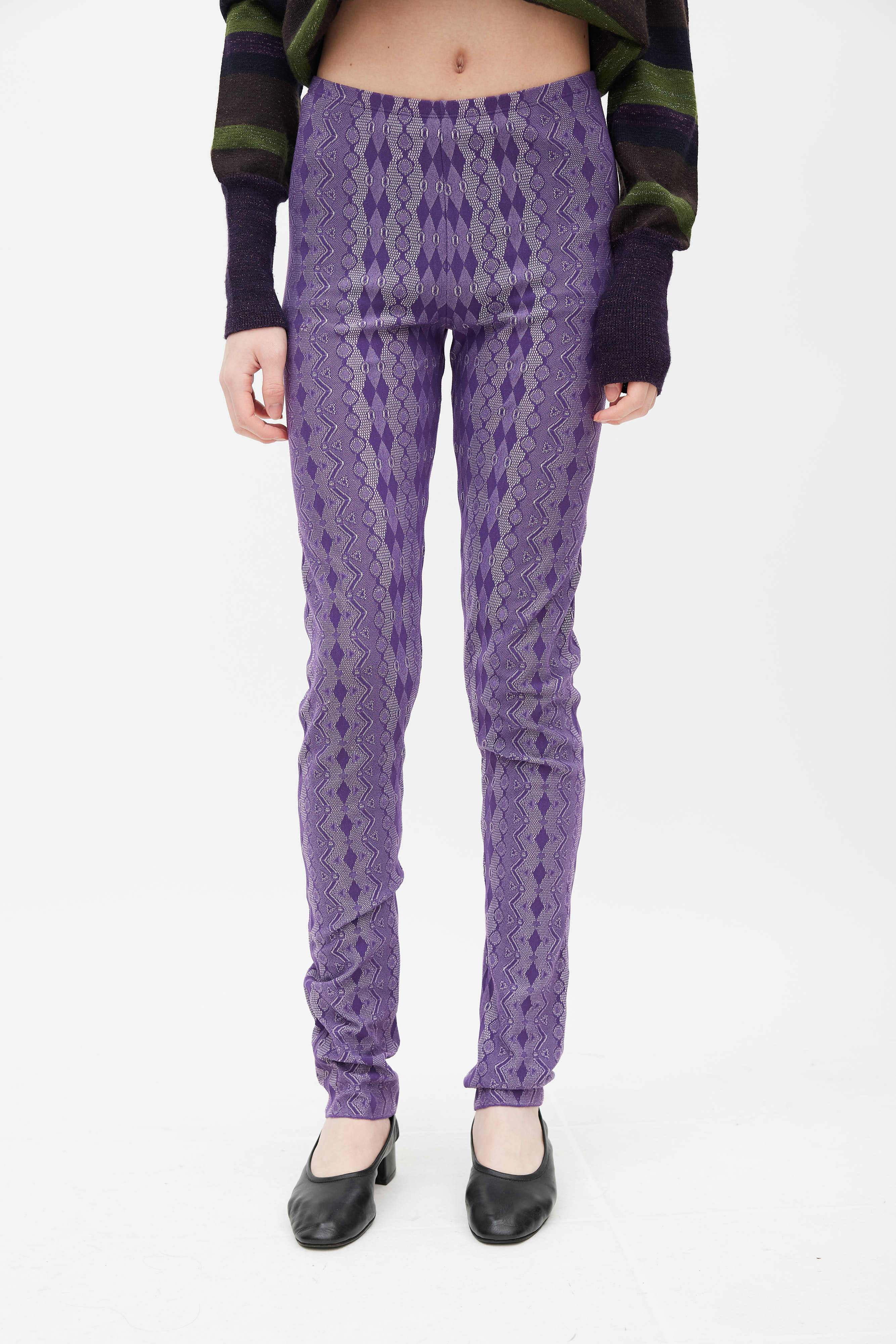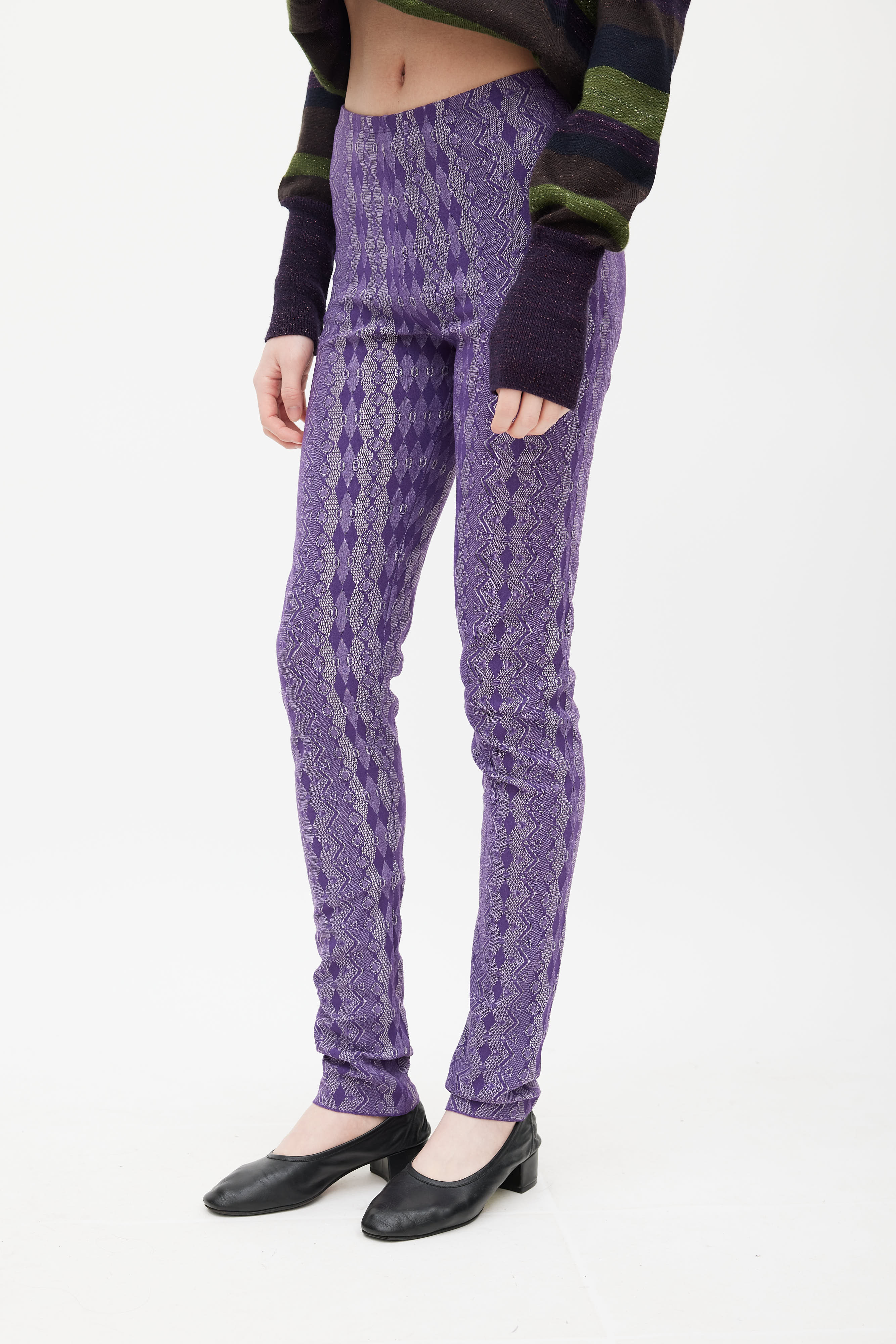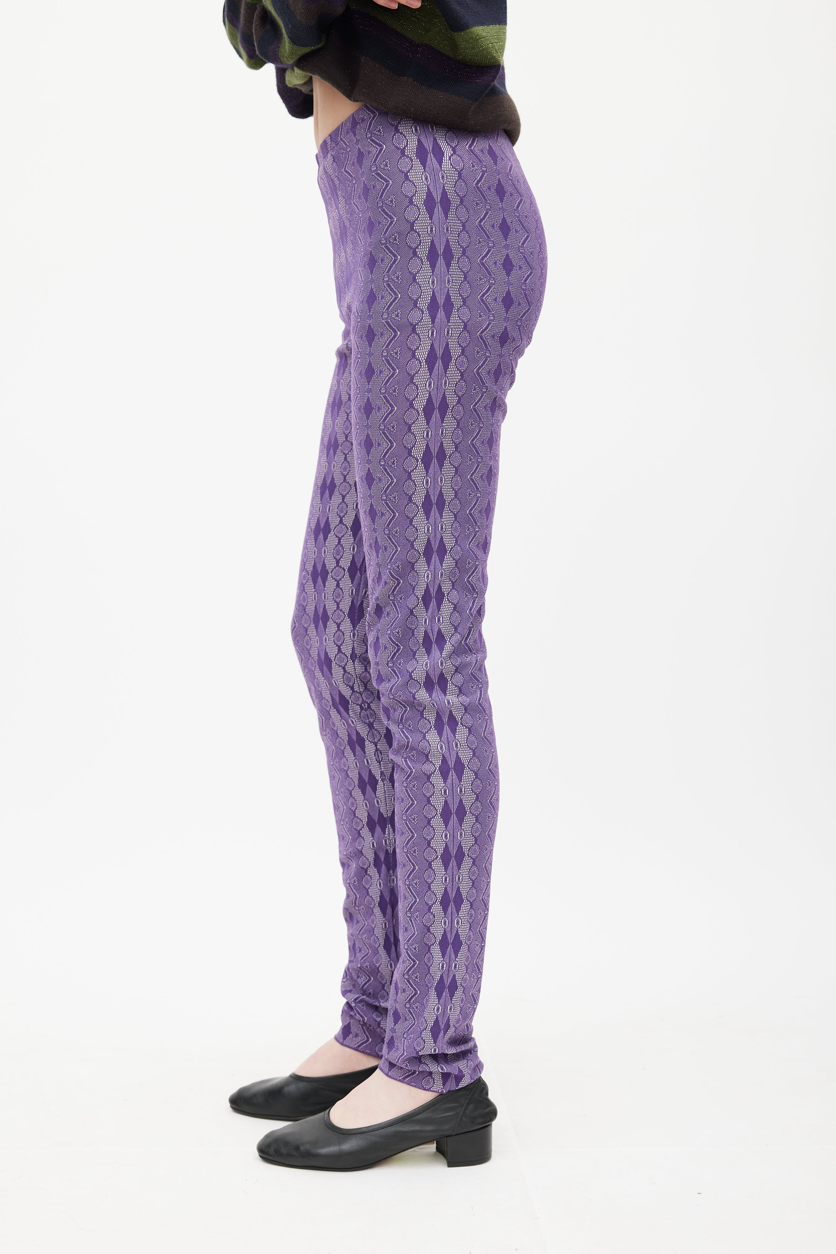 Pre-owned Pleats Please Issey Miyake purple leggings featuring a white argyle pattern throughout, elasticized waist, and slim leg.