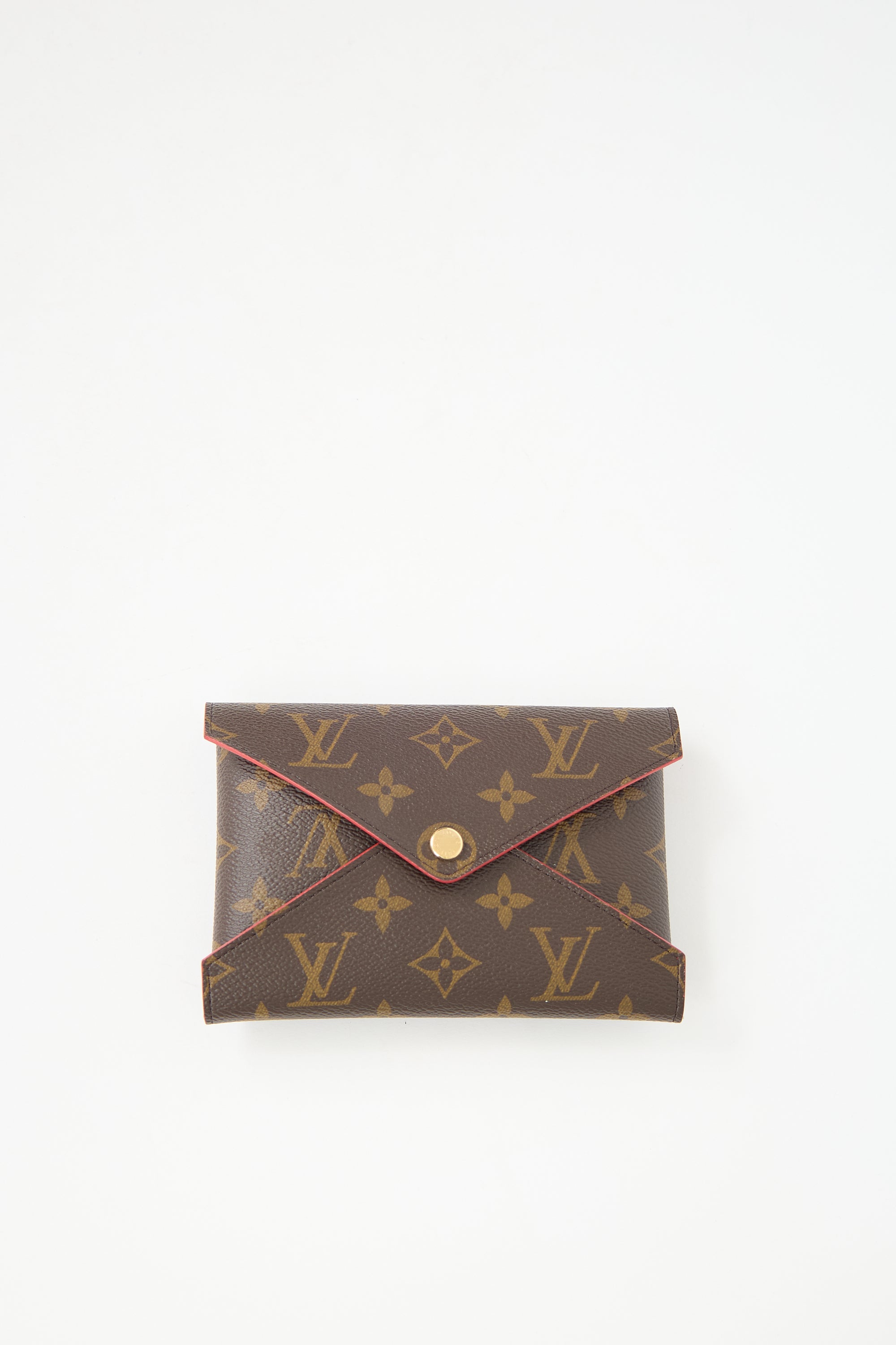 Pre-owned Louis Vuitton brown medium Kirigami pouch featuring monogram coated canvas, snap button closure, and one main compartment with red leather lining. Original dust bag included.