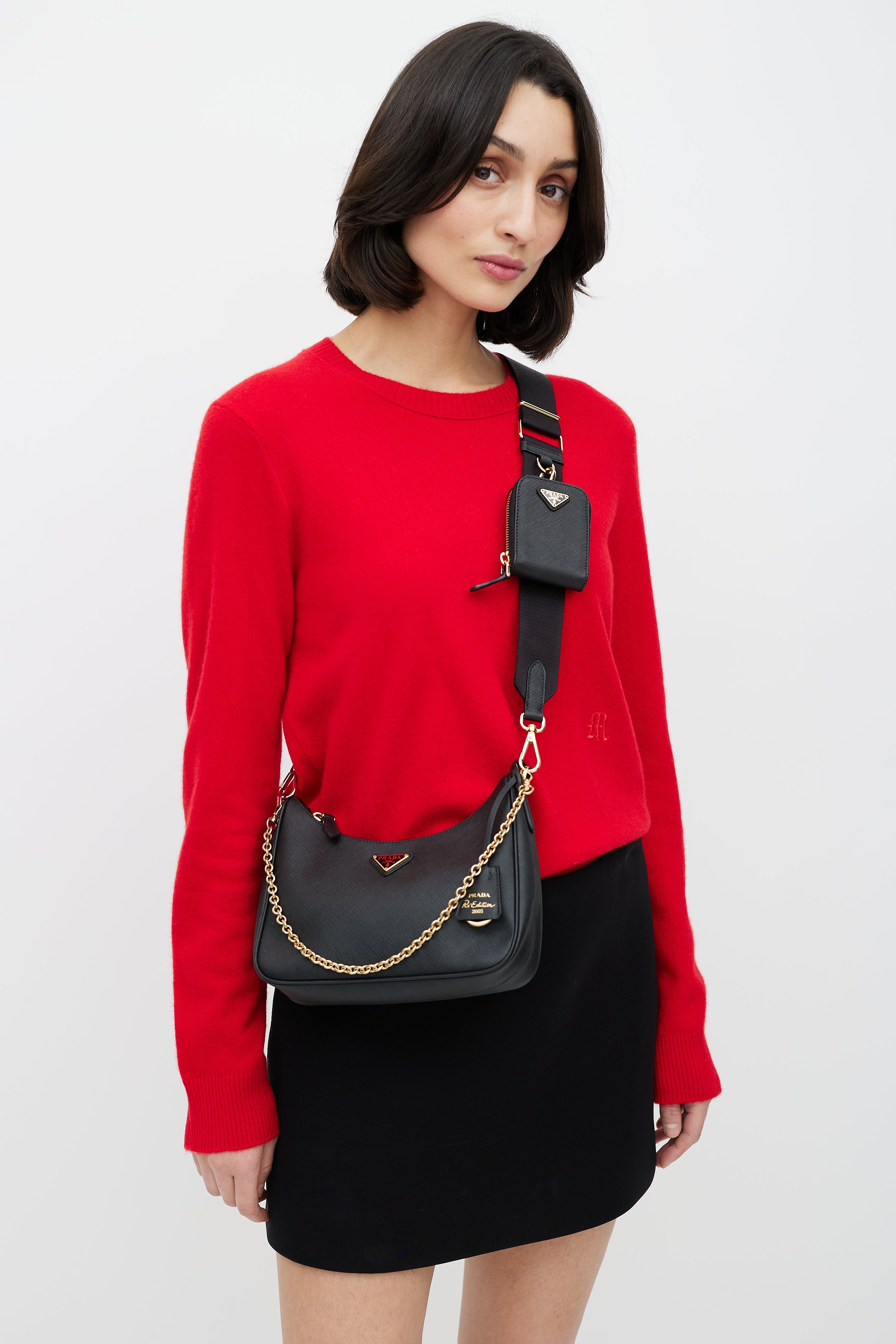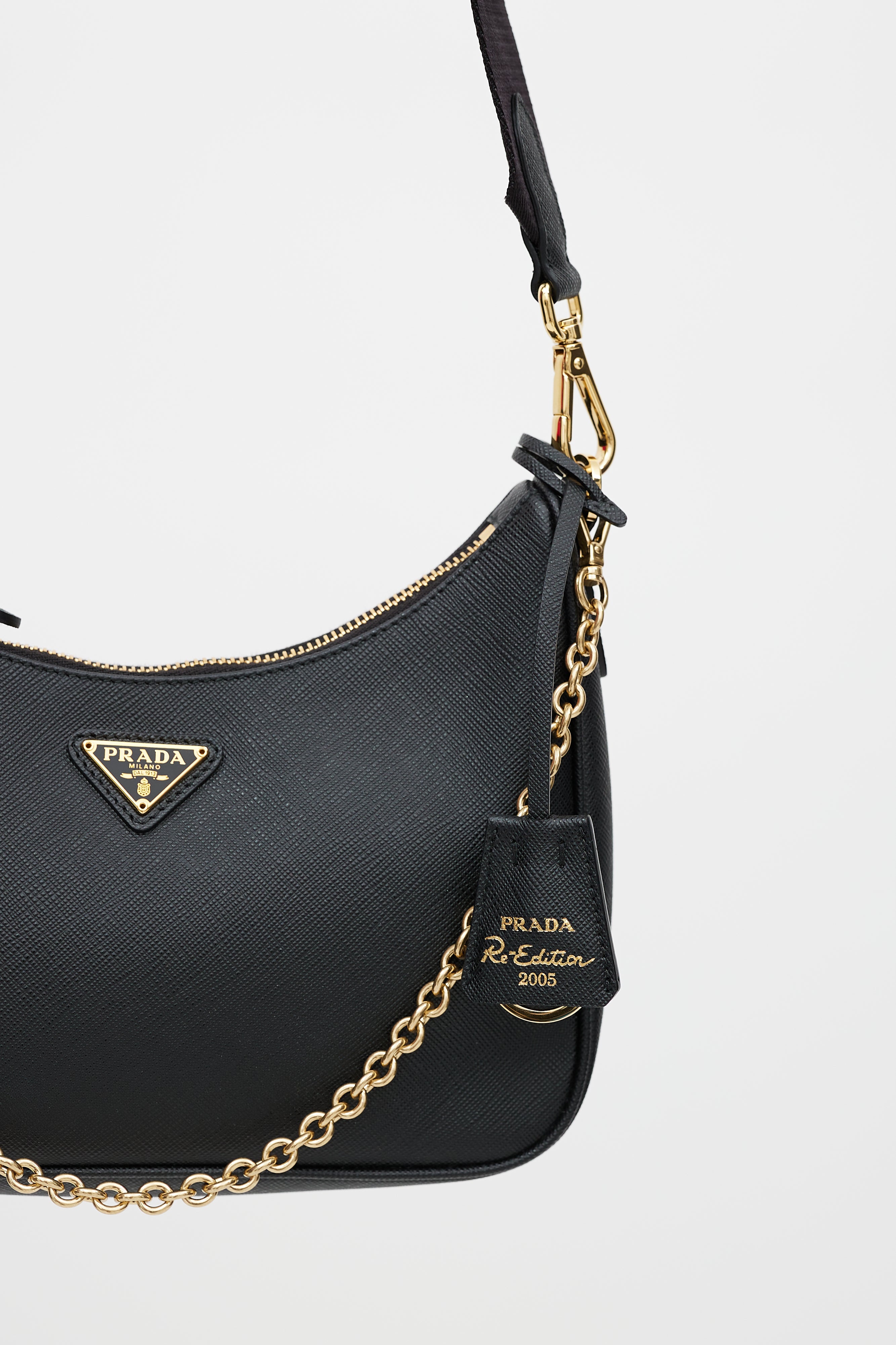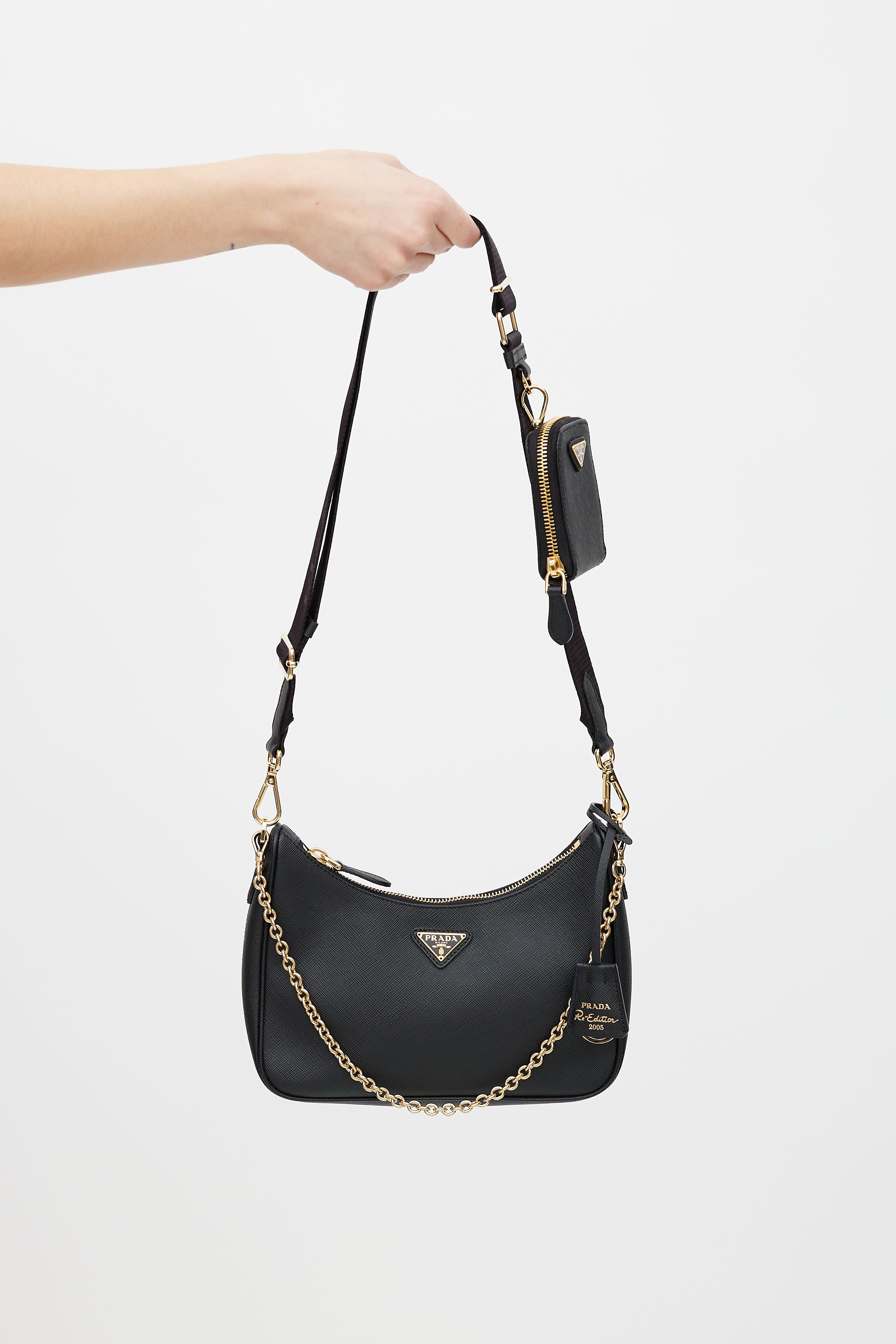 Pre-owned Prada black Re-Edition 2005 shoulder bag featuring Saffiano leather, gold tone hardware, detachable chain strap, detachable and adjustable canvas strap, detachable zip pouch, triangle logo hardware at front of bag and zip pouch, zip closure at top, detachable key charm with stamped logo and "Re-Edition 2005", and printed lining at main compartment.