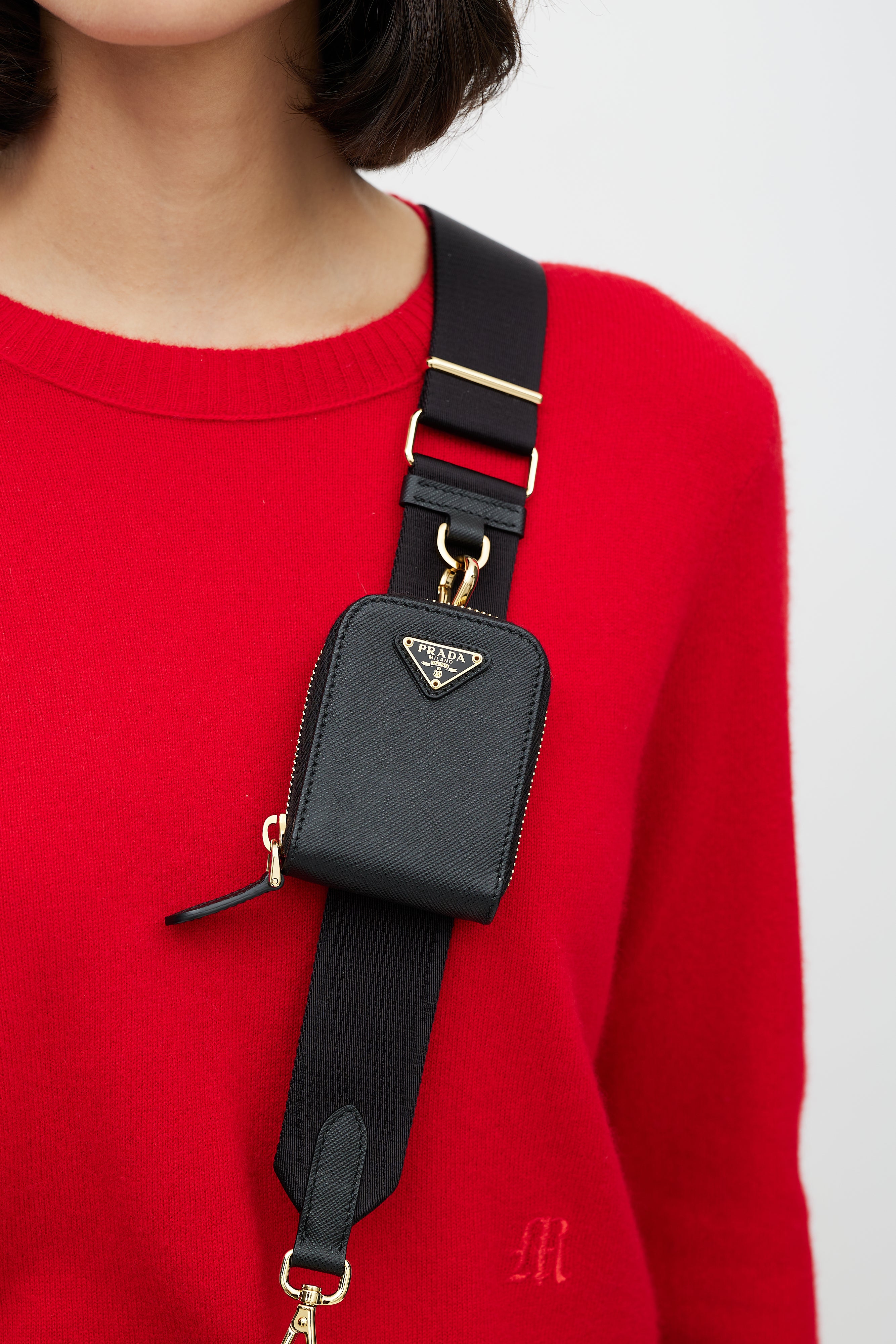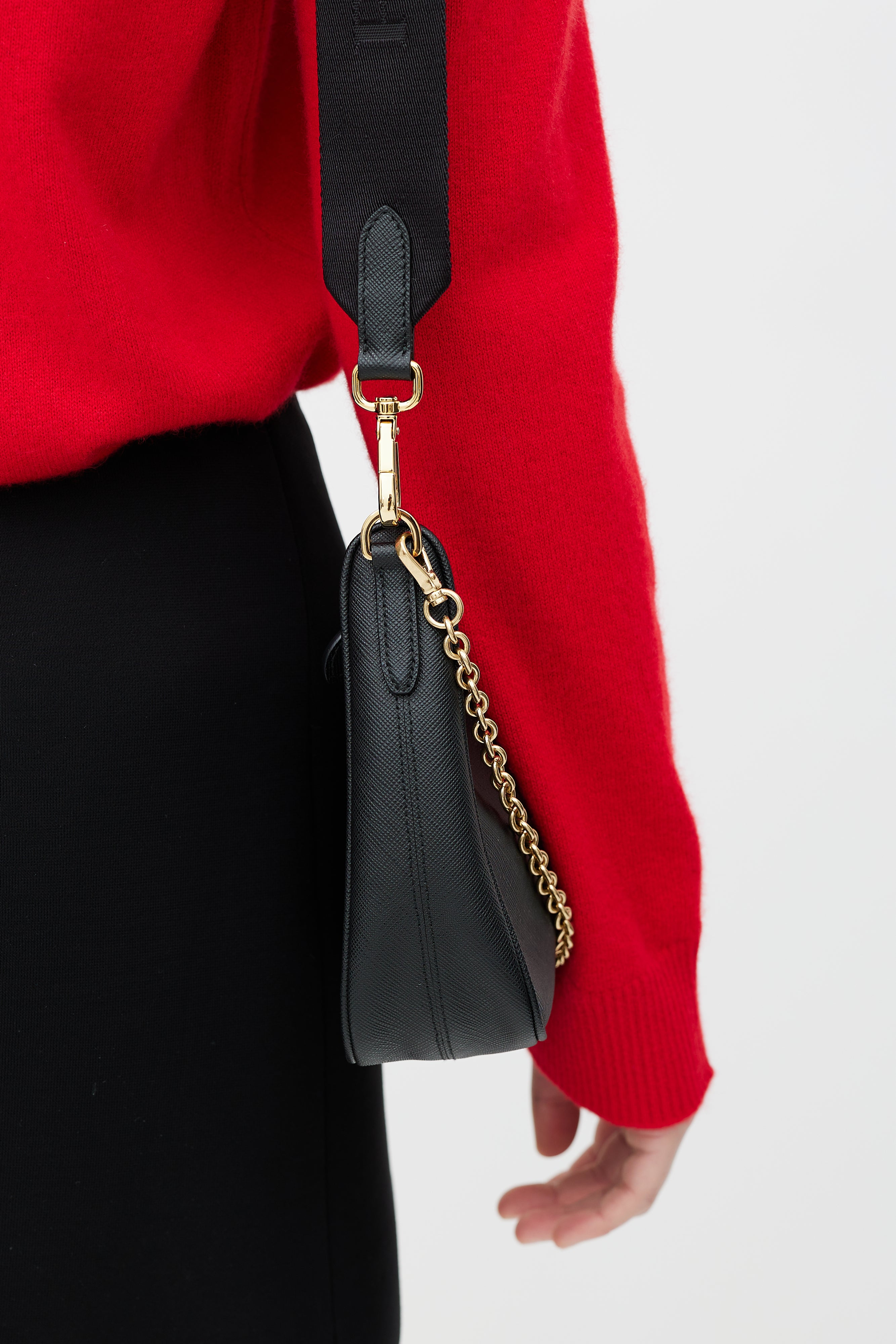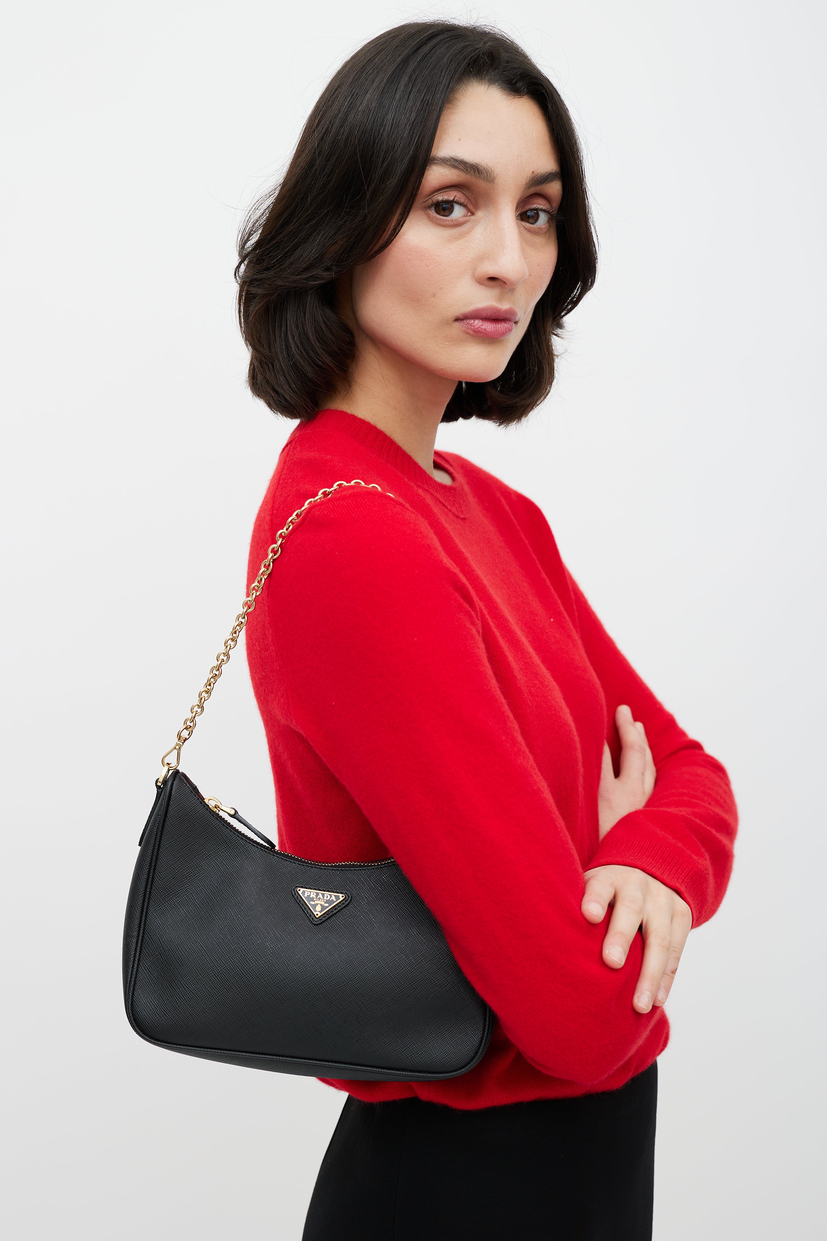 Pre-owned Prada black Re-Edition 2005 shoulder bag featuring Saffiano leather, gold tone hardware, detachable chain strap, detachable and adjustable canvas strap, detachable zip pouch, triangle logo hardware at front of bag and zip pouch, zip closure at top, detachable key charm with stamped logo and "Re-Edition 2005", and printed lining at main compartment.