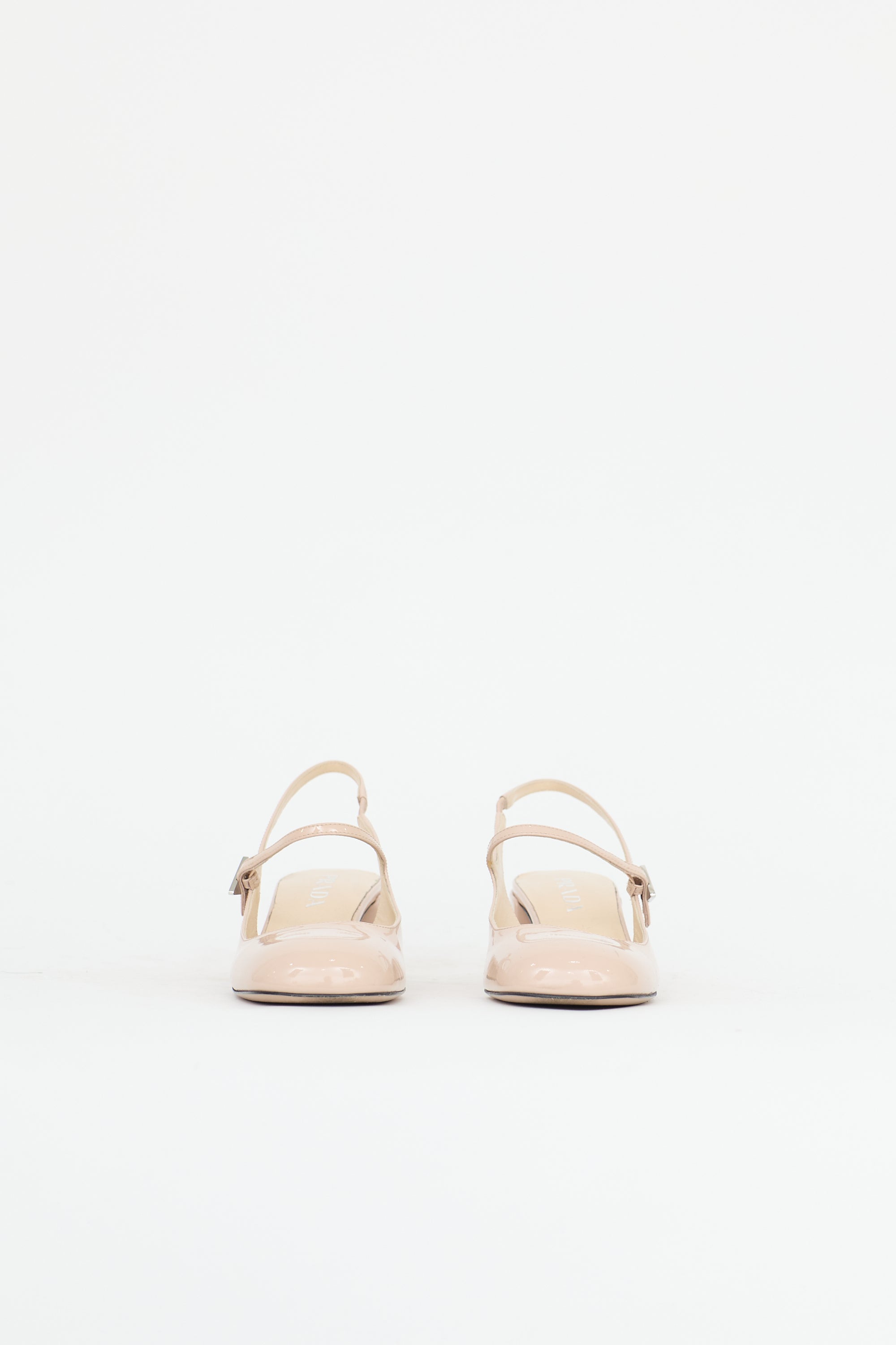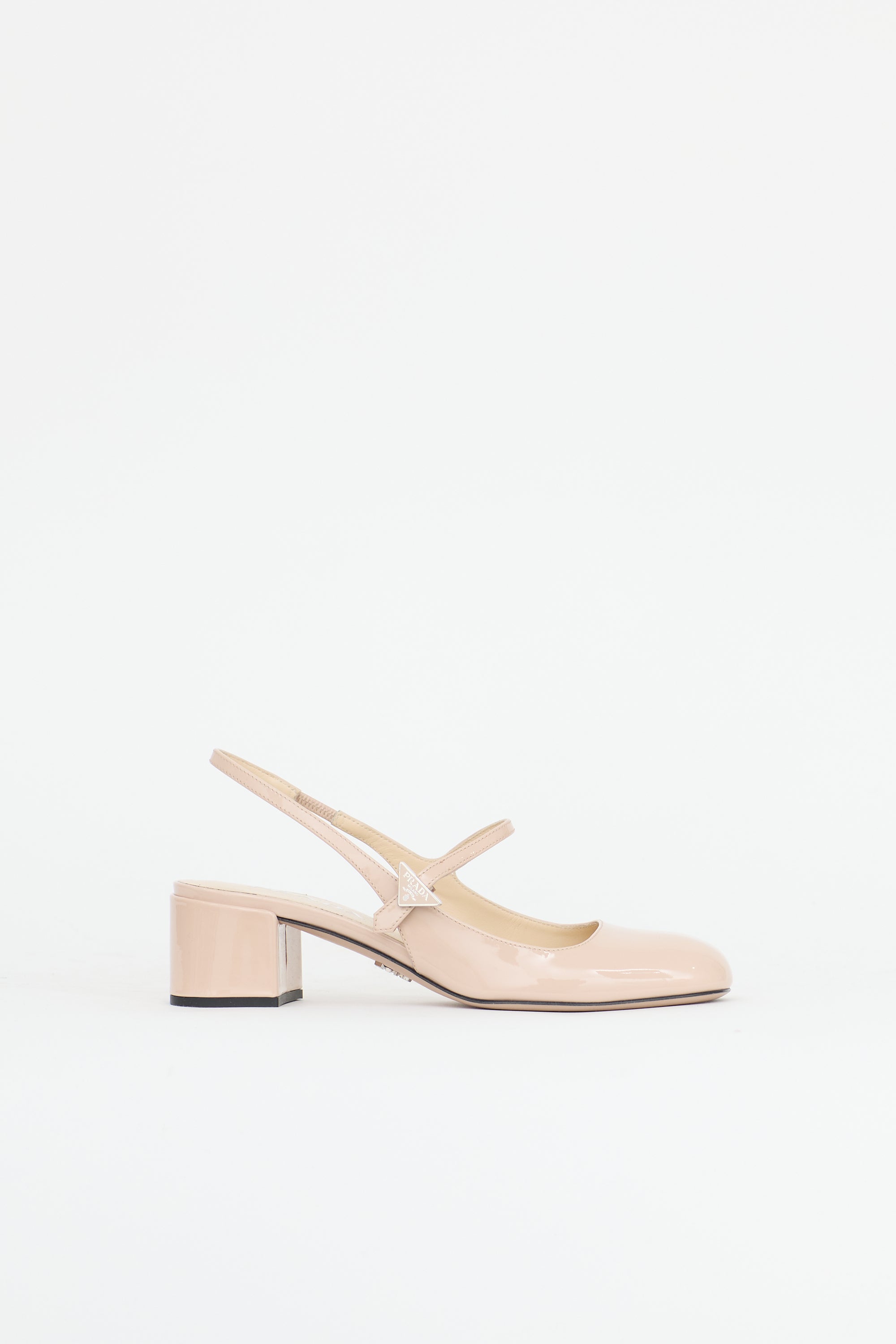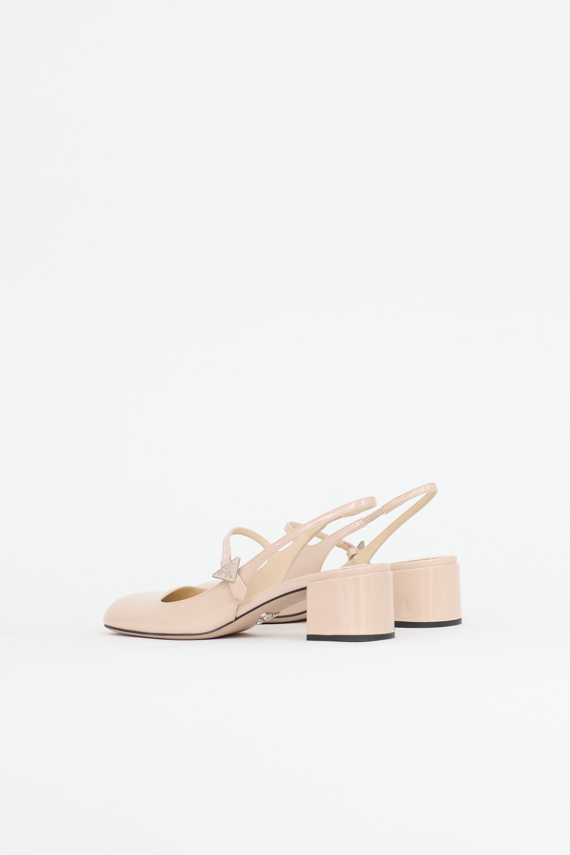 Pre-owned Prada beige patent leather Mary Jane heels featuring a rounded toe, elasticized strap at vamp with signature triangle logo plaque, elasticized slingback strap, and covered block heel.