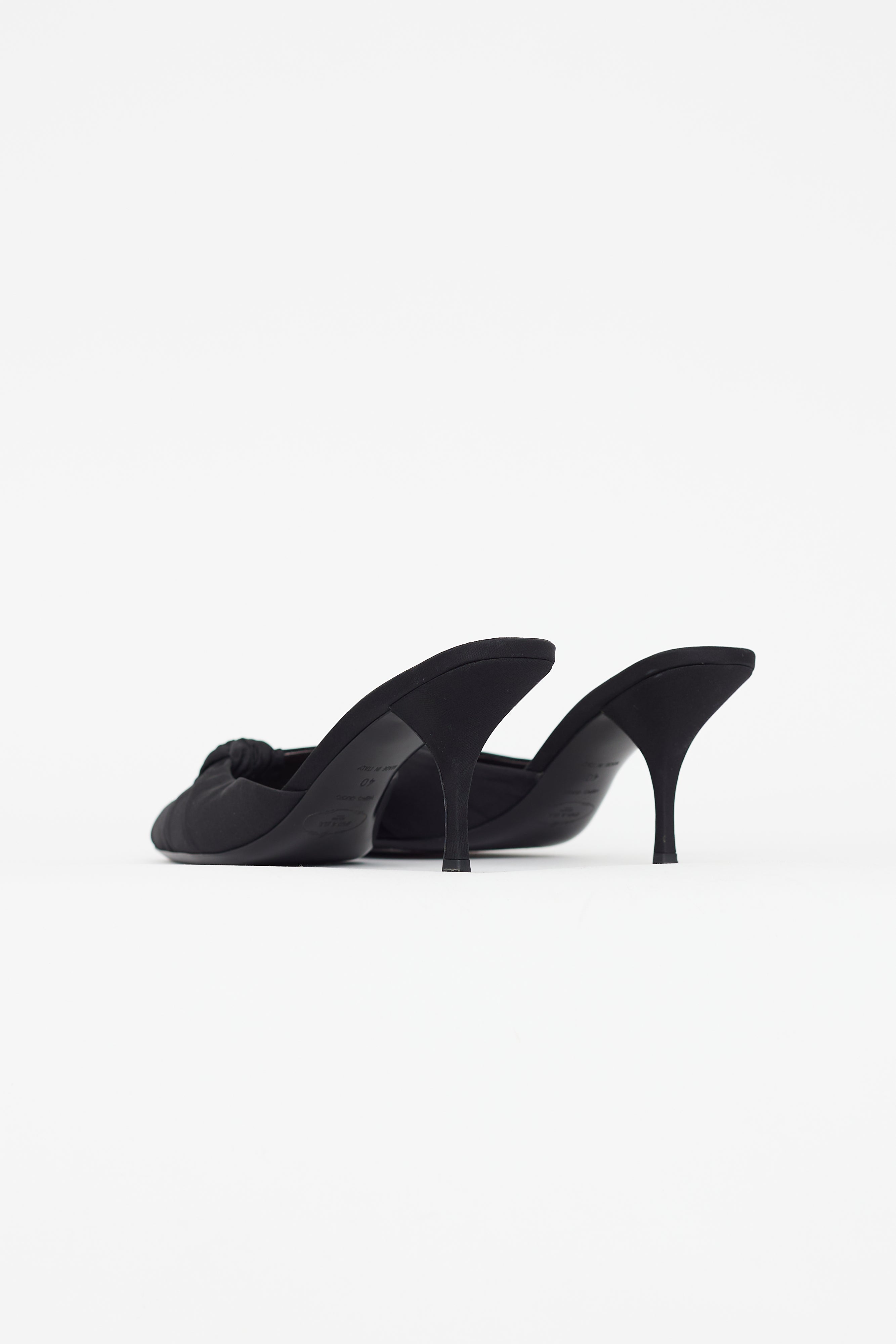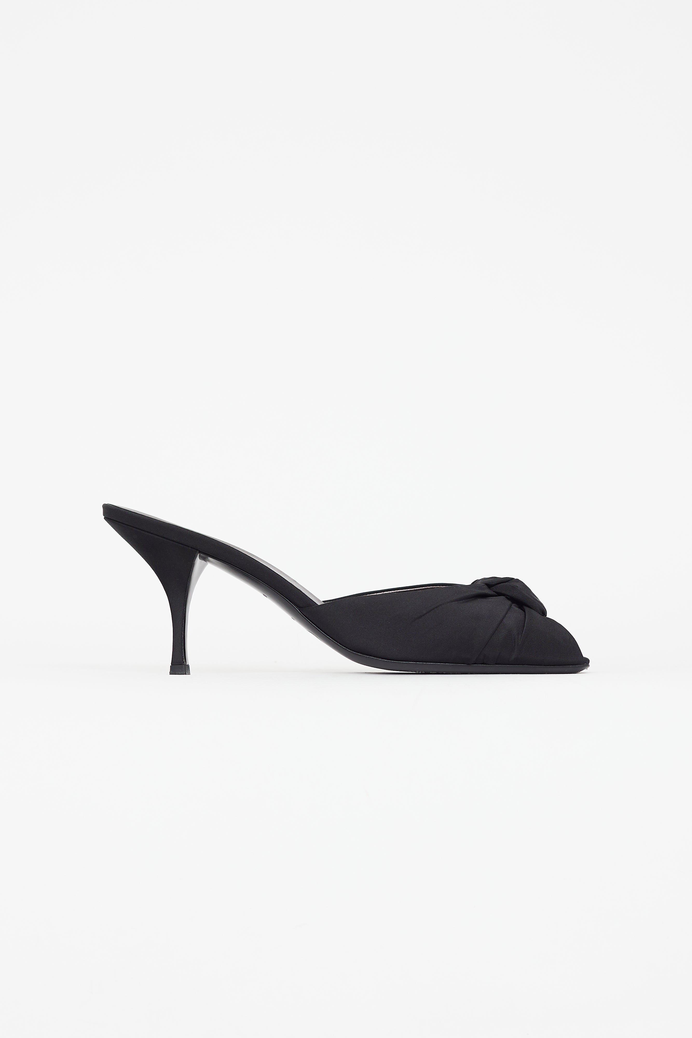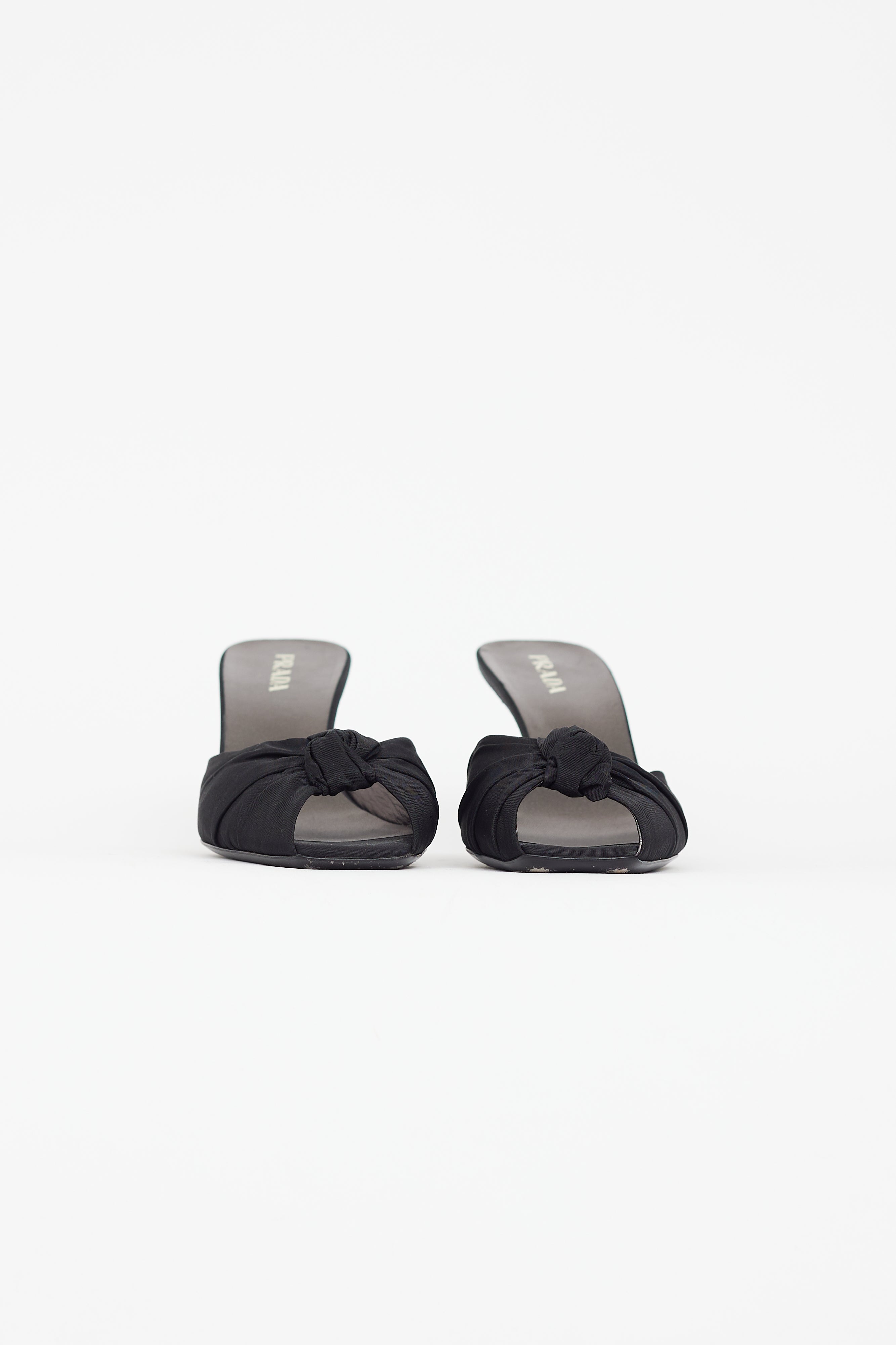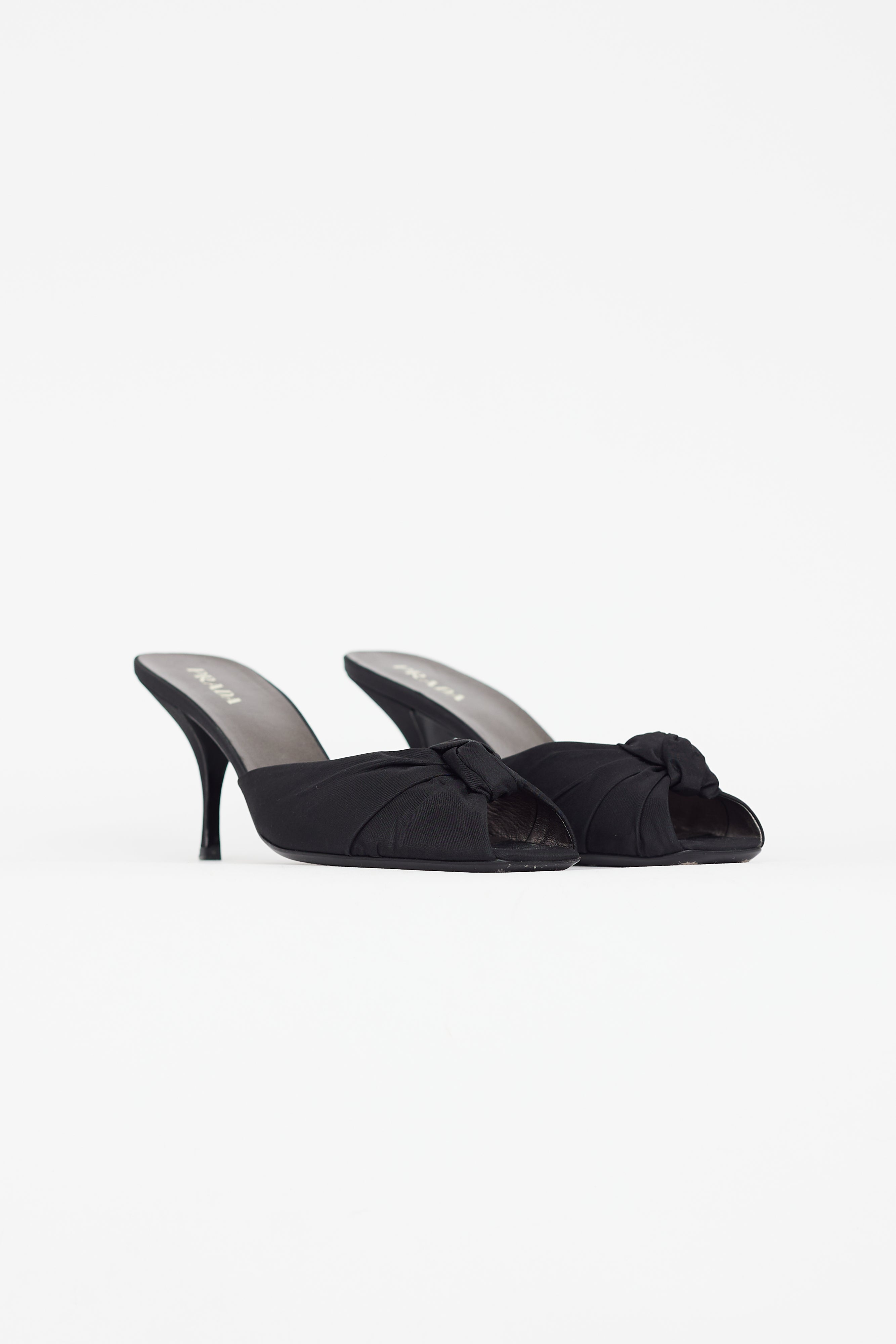 Pre-owned vintage Prada black textile heeled sandal featuring open square toe, covered heel, gathered bow accent at toe box, and leather insole. Comes with original dust bag.