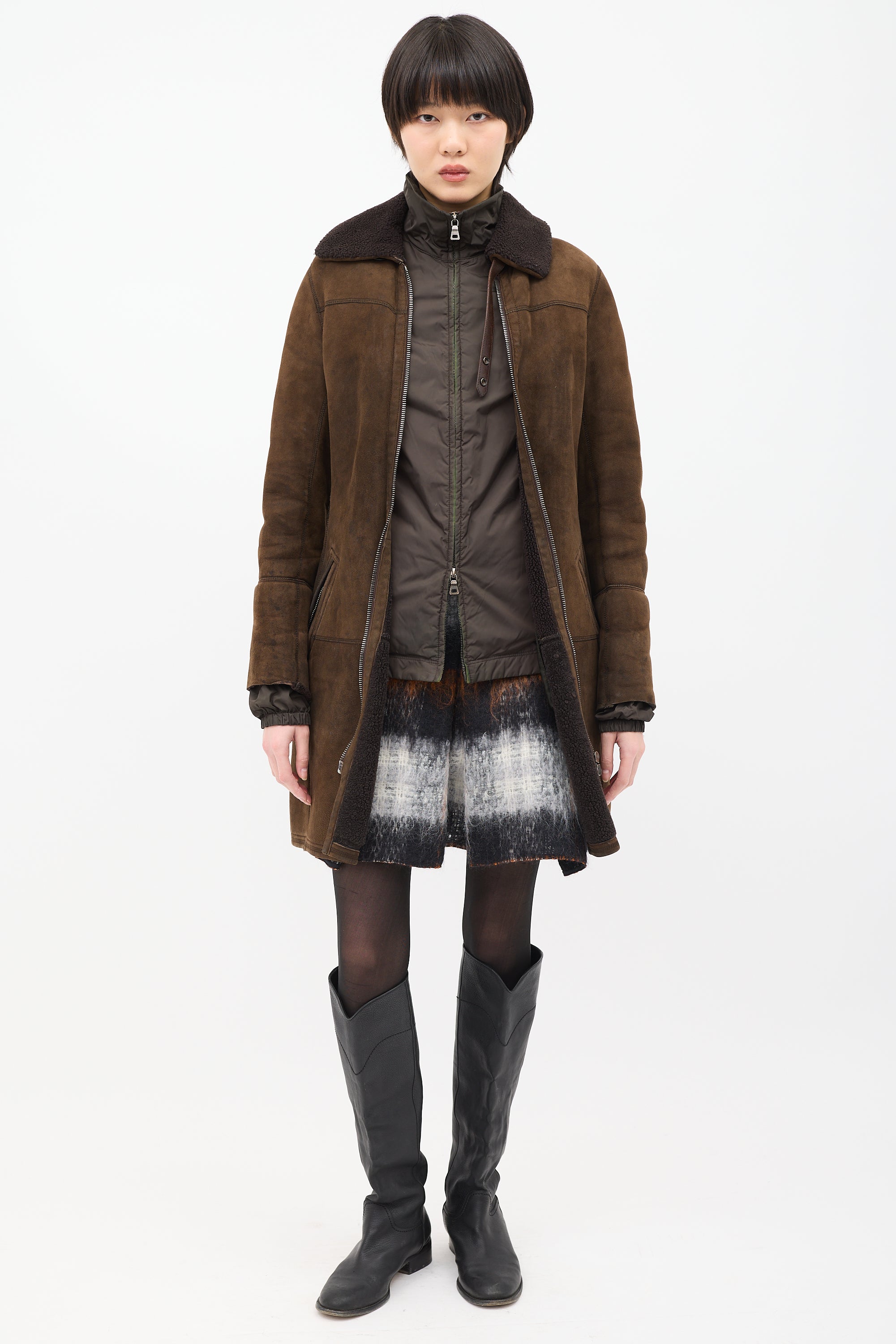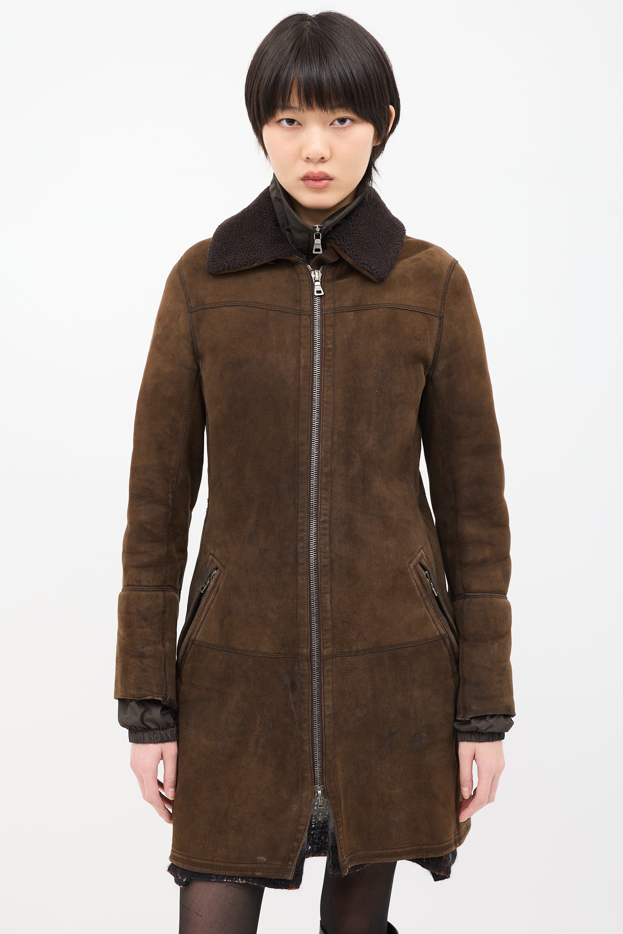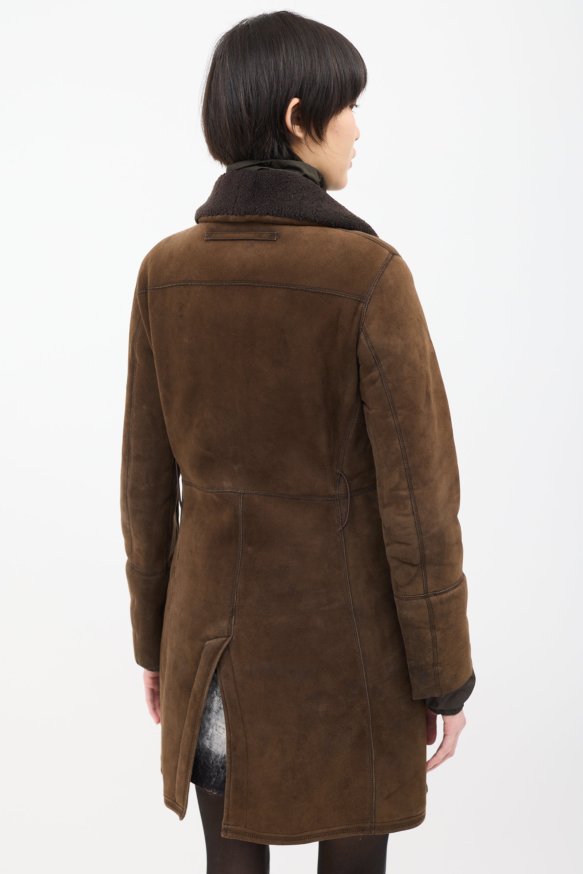 Pre-owned Prada Linea Rossa vintage brown 2-in-1 shearling coat featuring collar with strap detail, double zipped front, two front zip pockets, back vent, and inset elasticized cuffs. Detached nylon padded vest features funnel collar, double zipped front, Velcro in seam pockets, and signature red logo tab. Coat and vest are lined.