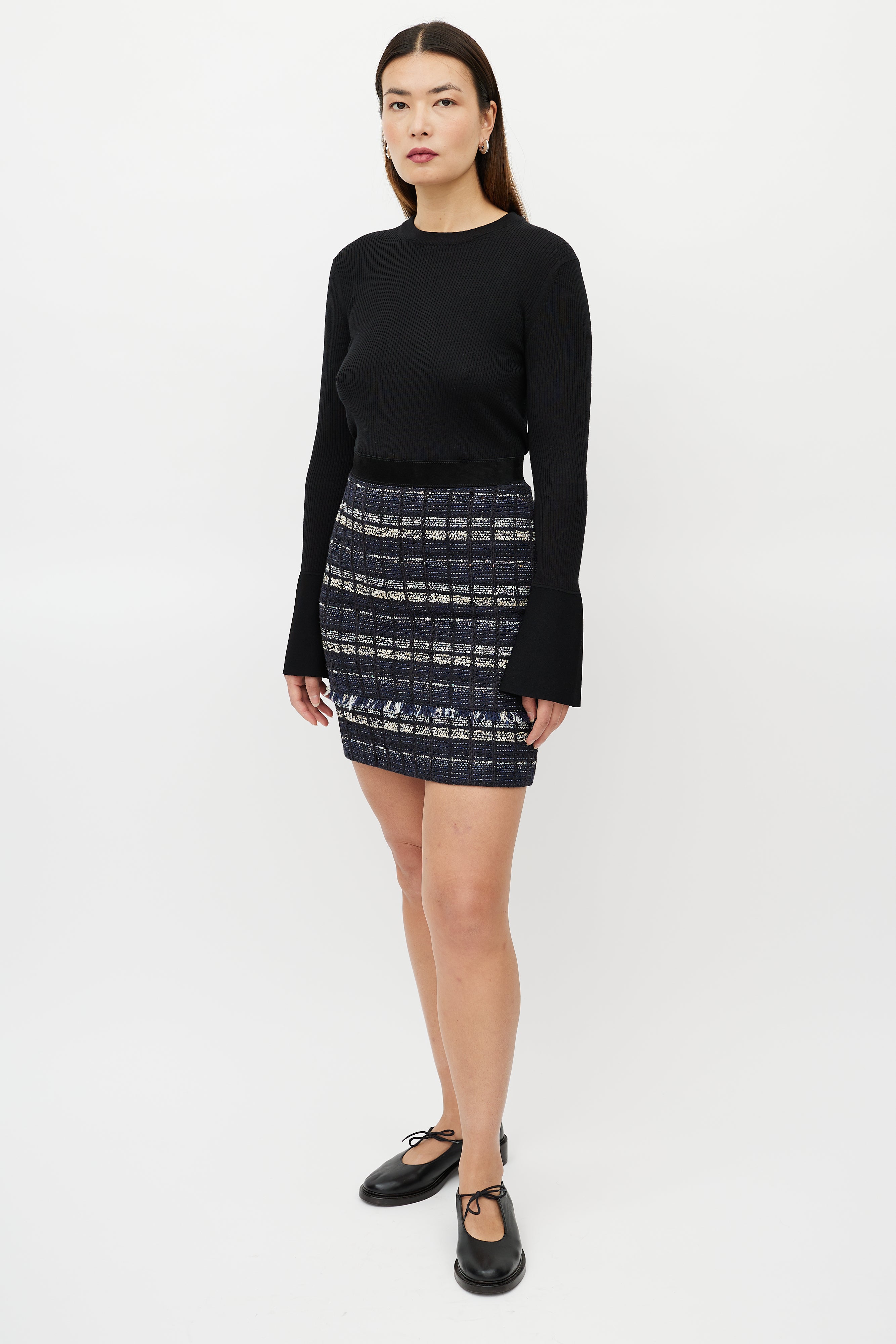 Pre-owned Proenza Schouler blue skirt featuring plaid tweed with fringe near hem, black suede waistband and concealed zip at back. Lined.