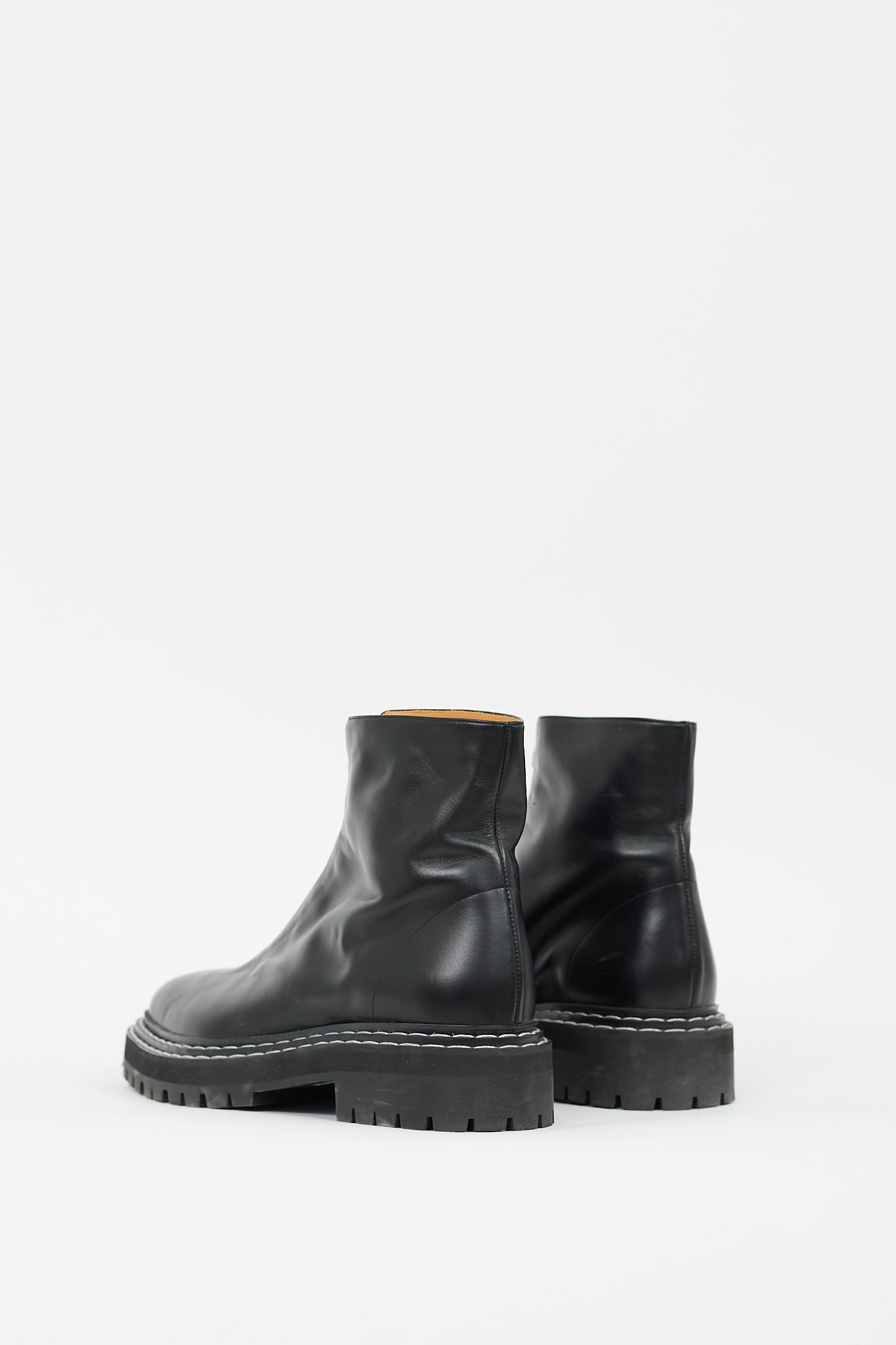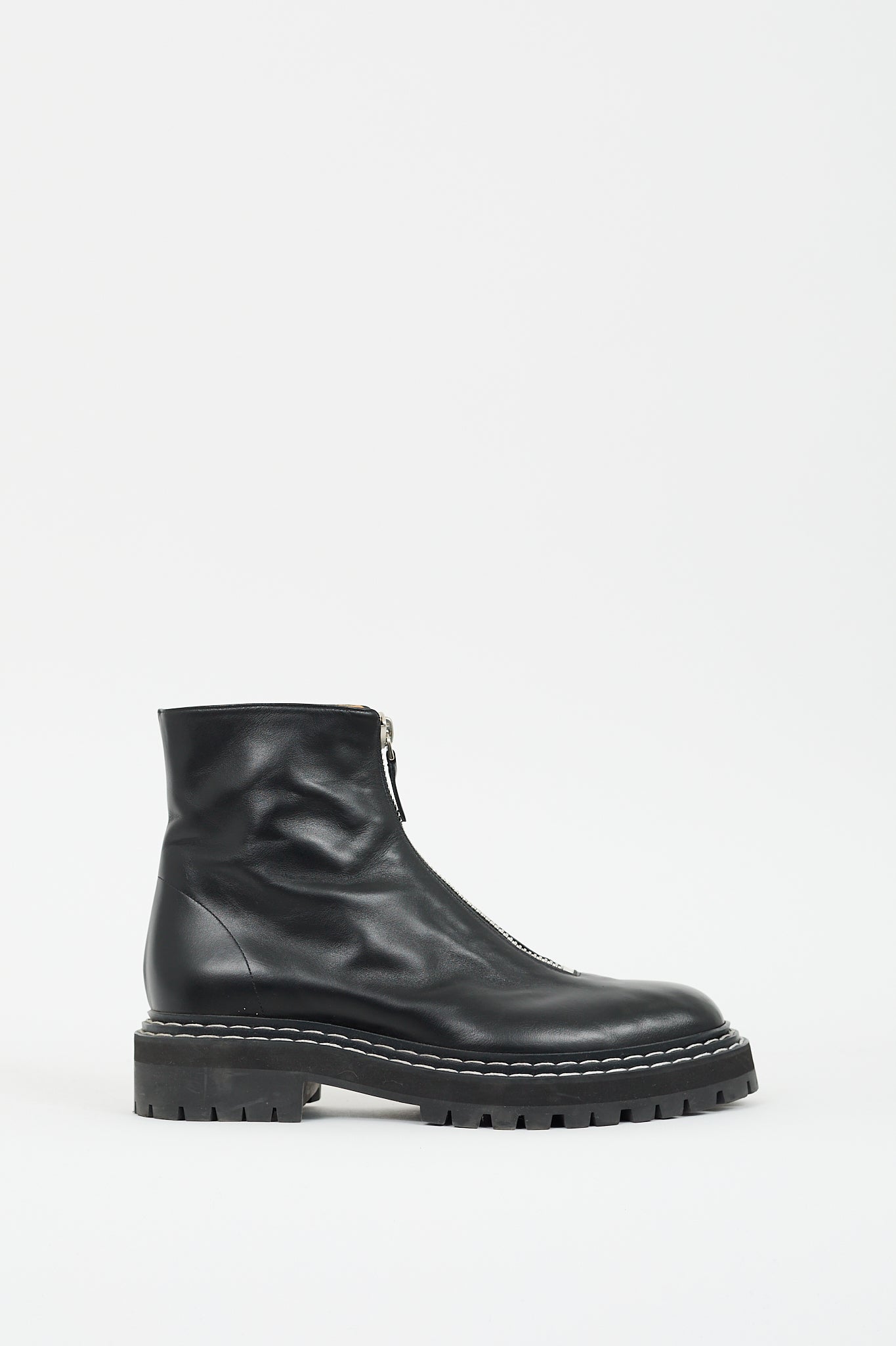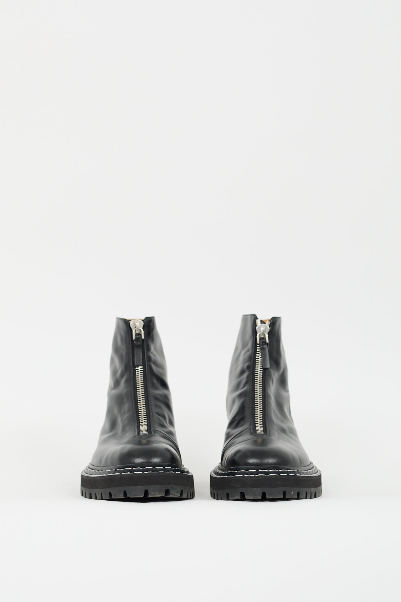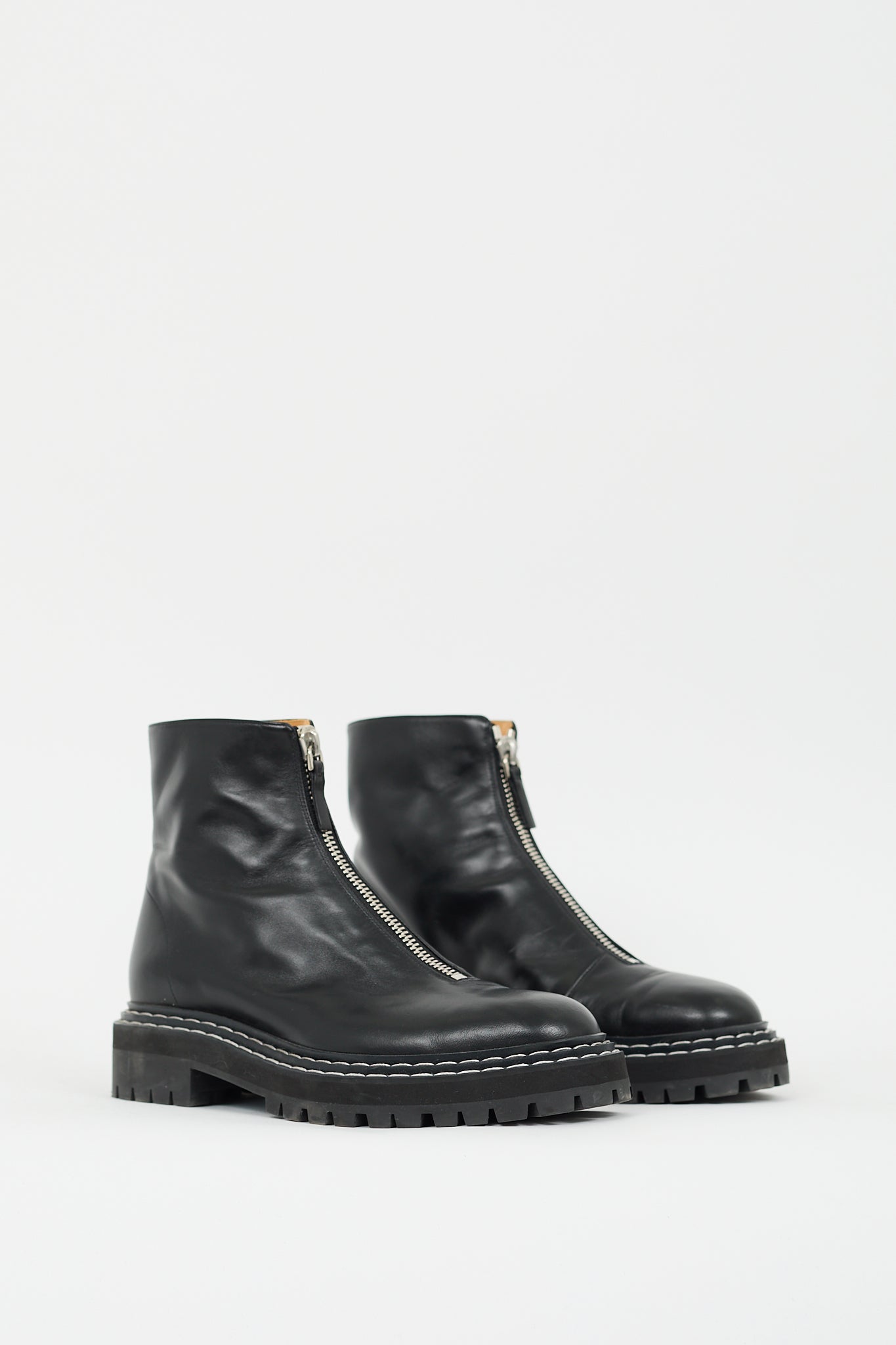 Pre-owned Proenza Schouler black leather boots featuring rounded toe, front zip closure, lug sole, contrast stitch, and lug sole.