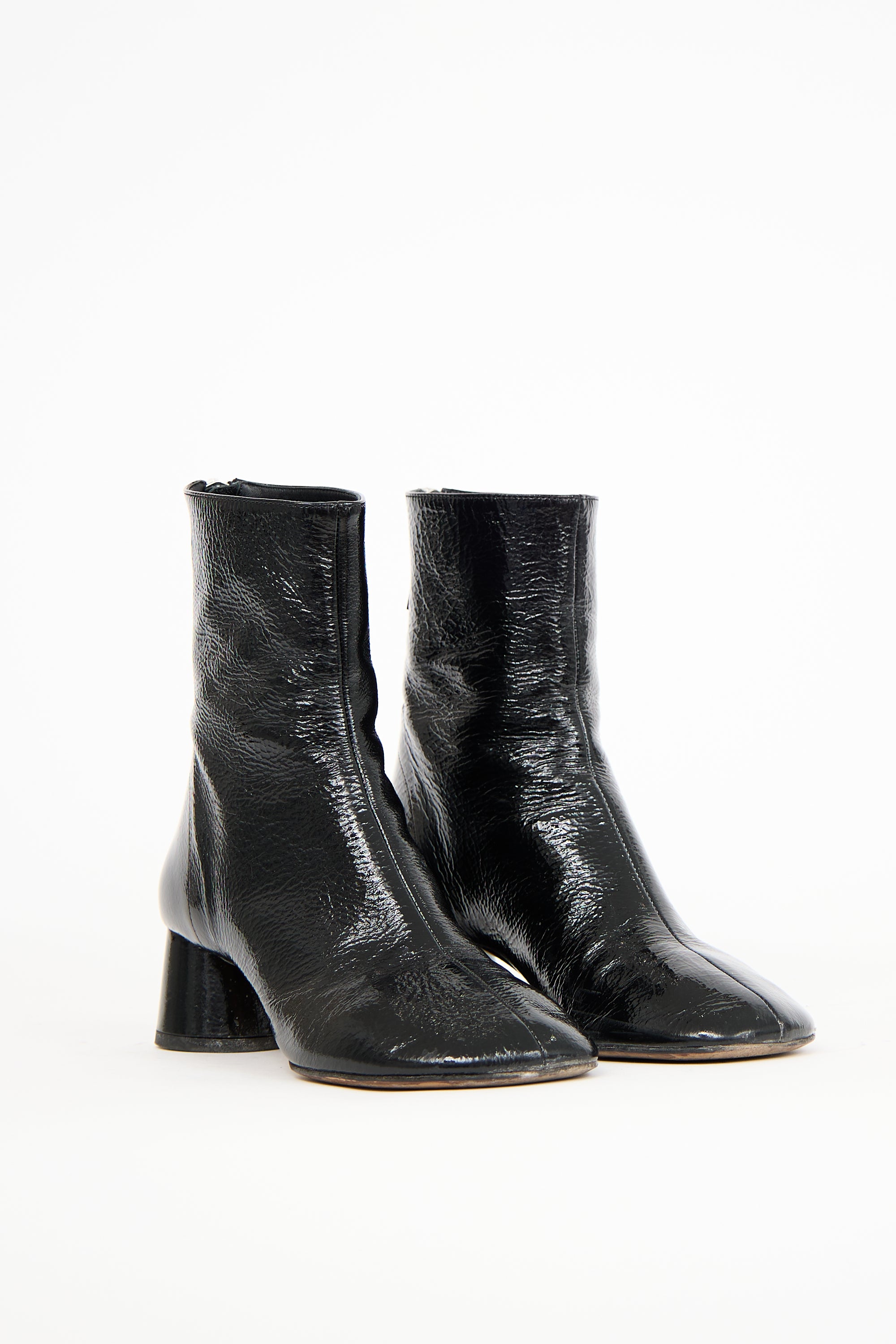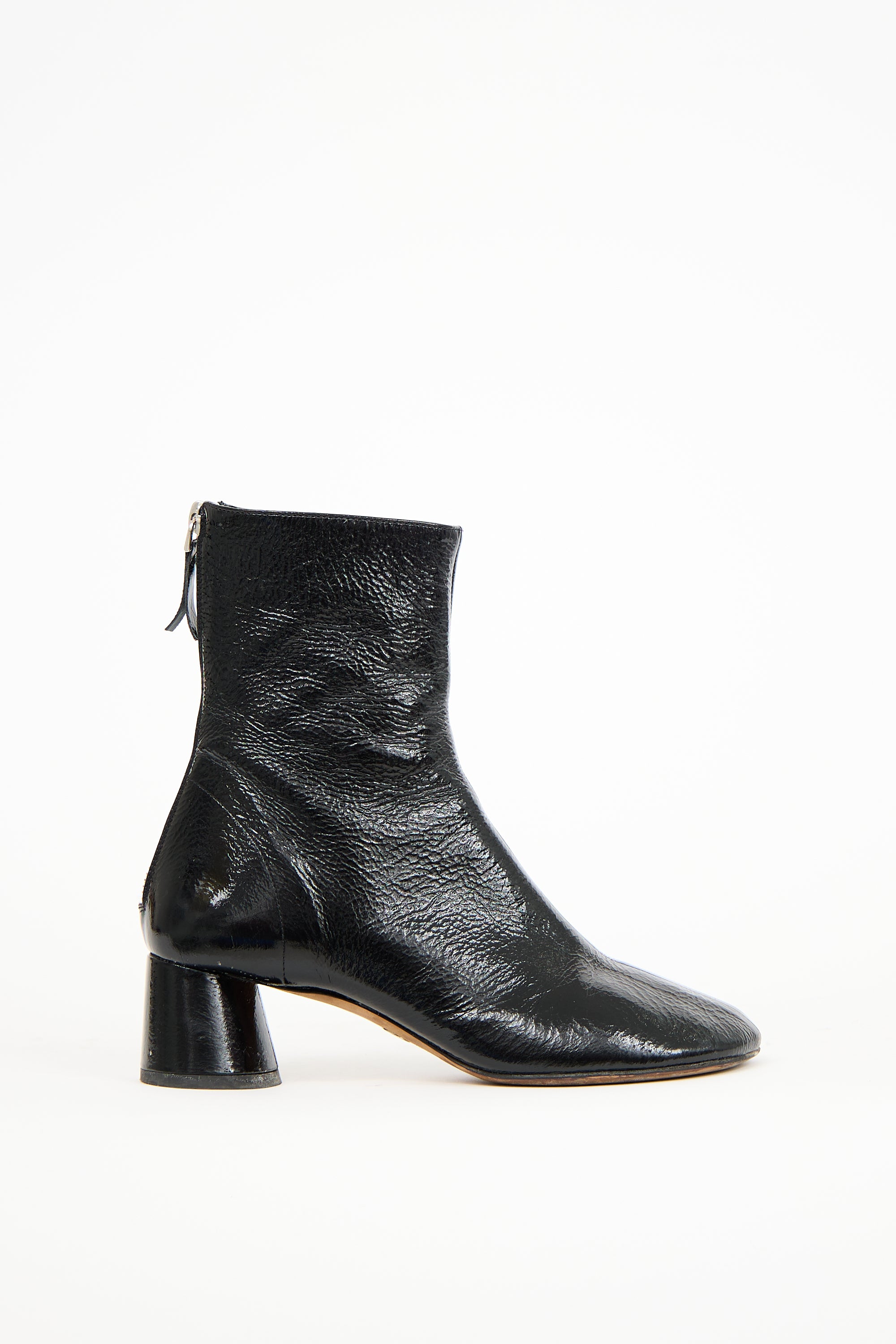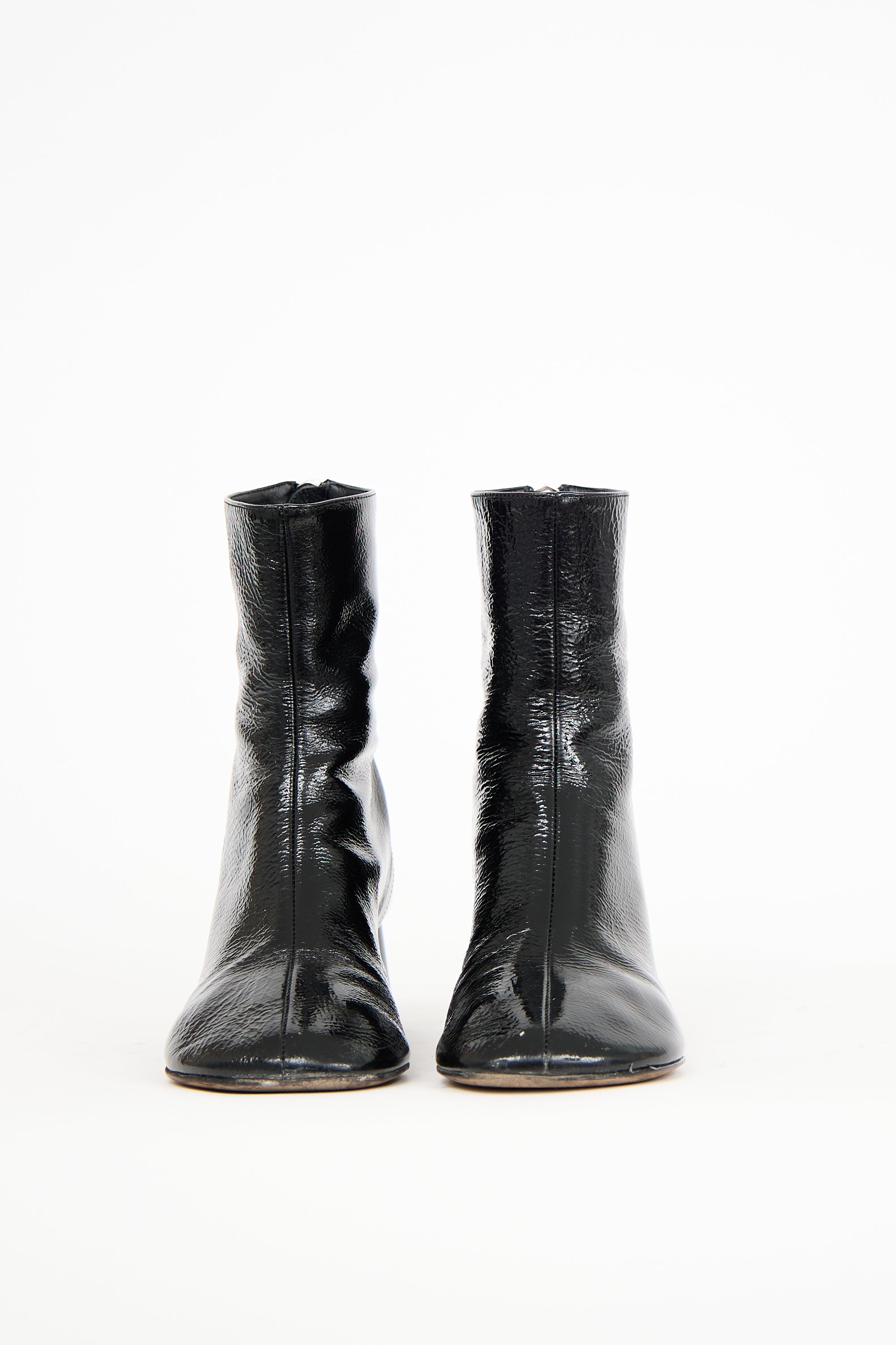 Pre-owned Proenza Schouler black ankle boot featuring a patent grained leather upper, an exaggerated rounded toe, back zip closure, and a low block heel.