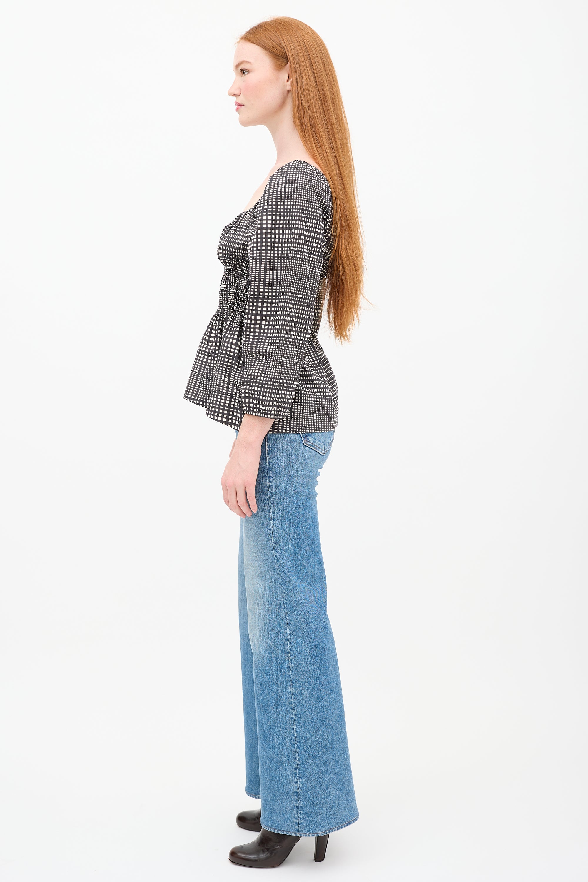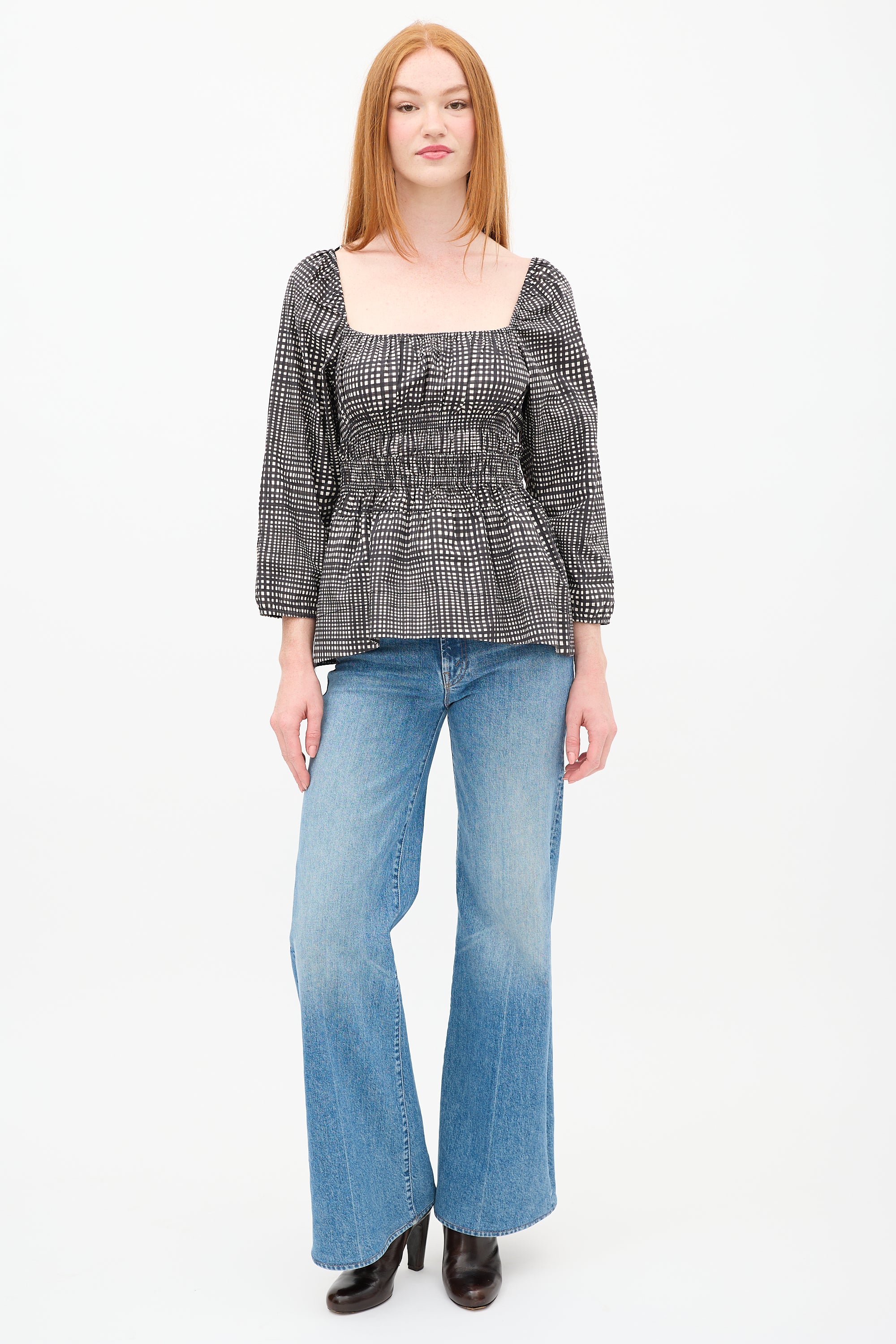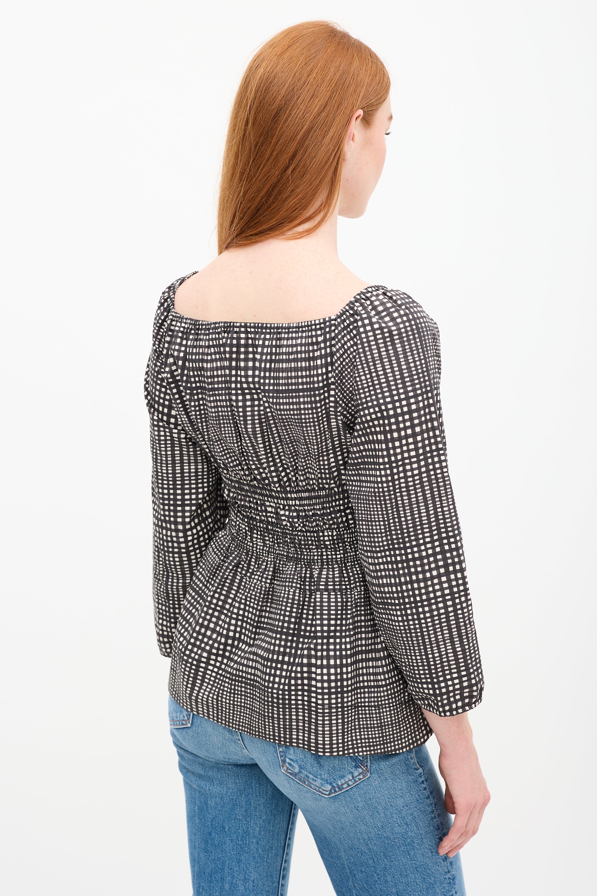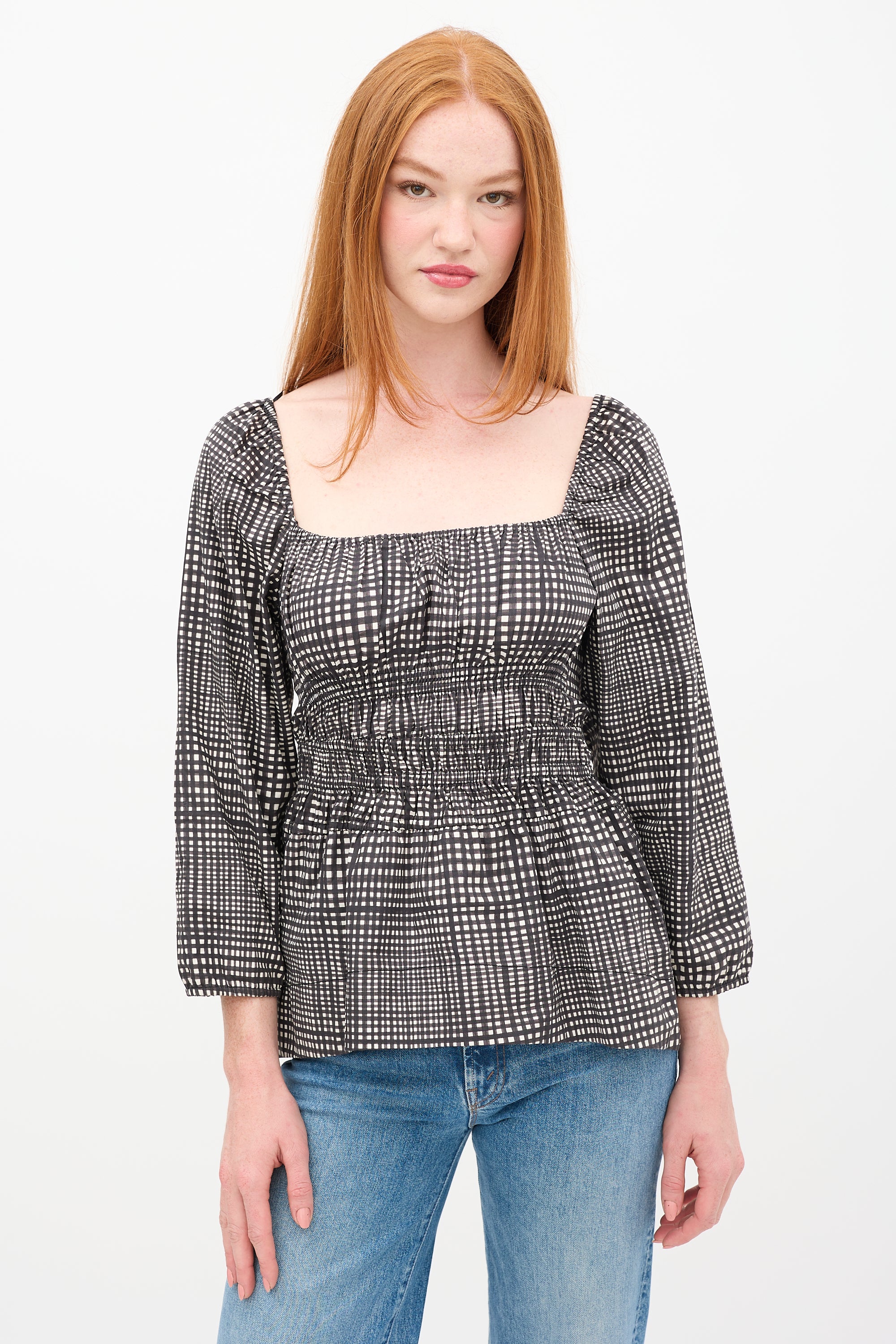 Pre-owned Proenza Schouler black and white checkered top featuring elasticized square neckline, shirring at waist, long sleeves with elasticized cuffs, and side zipped closure.