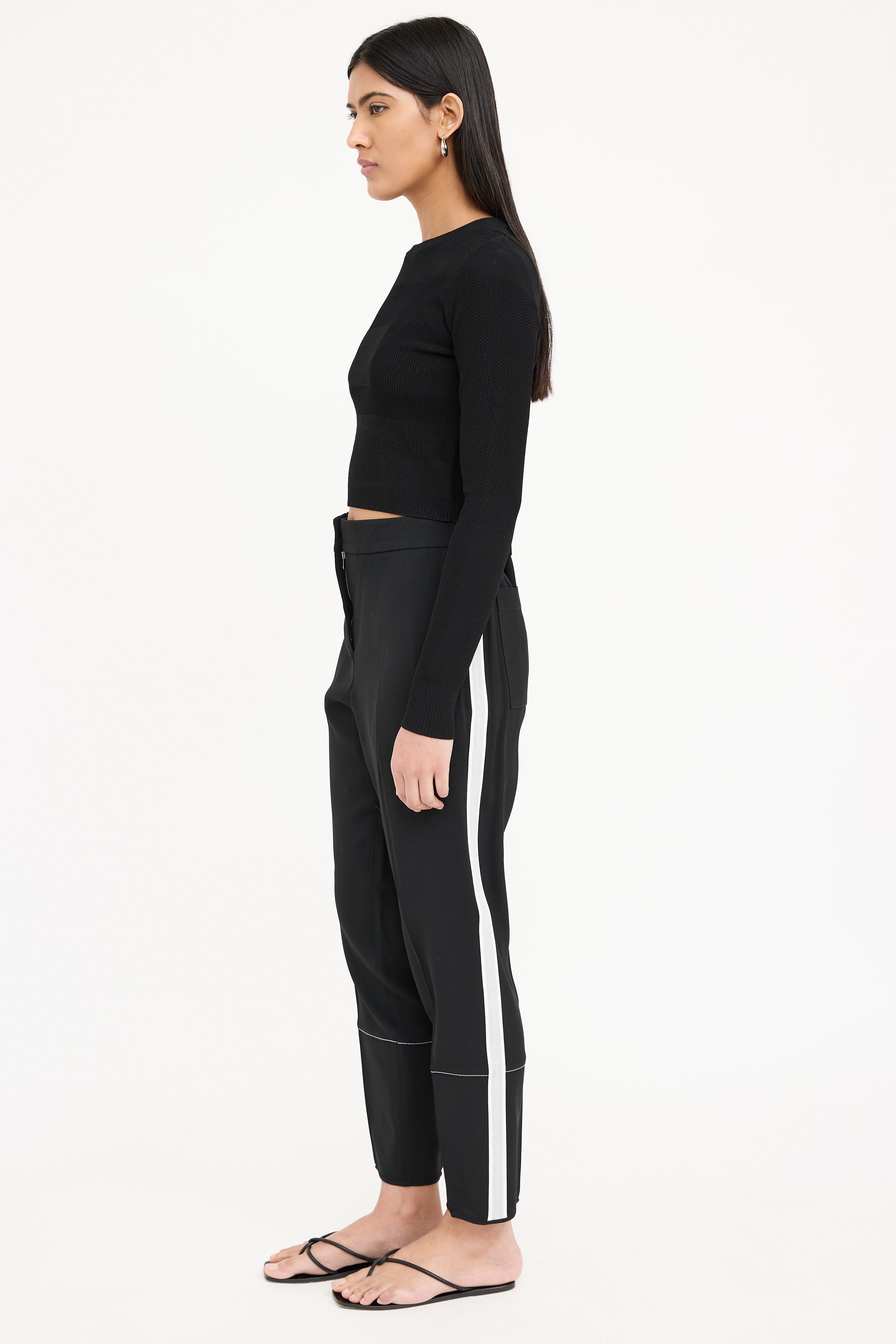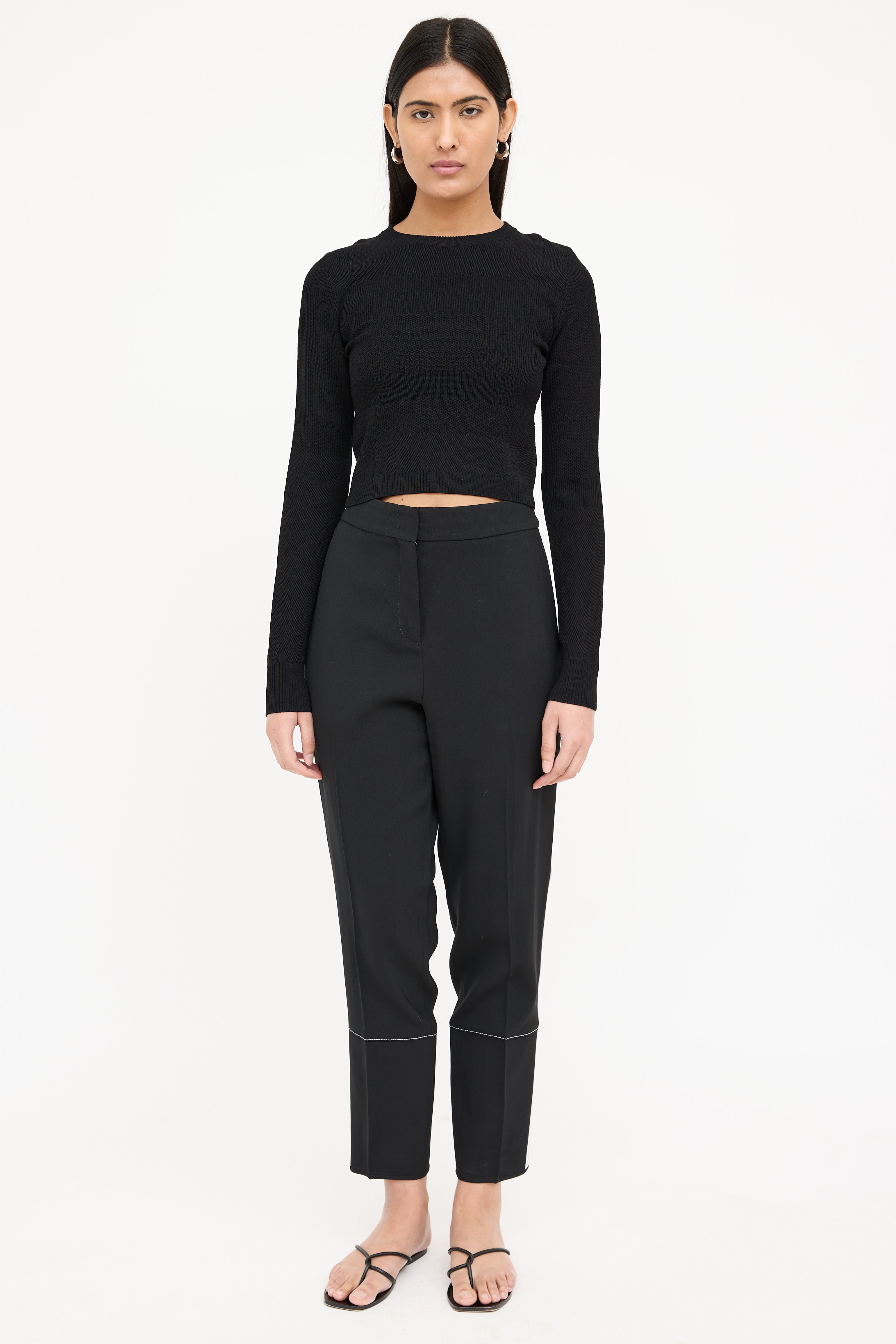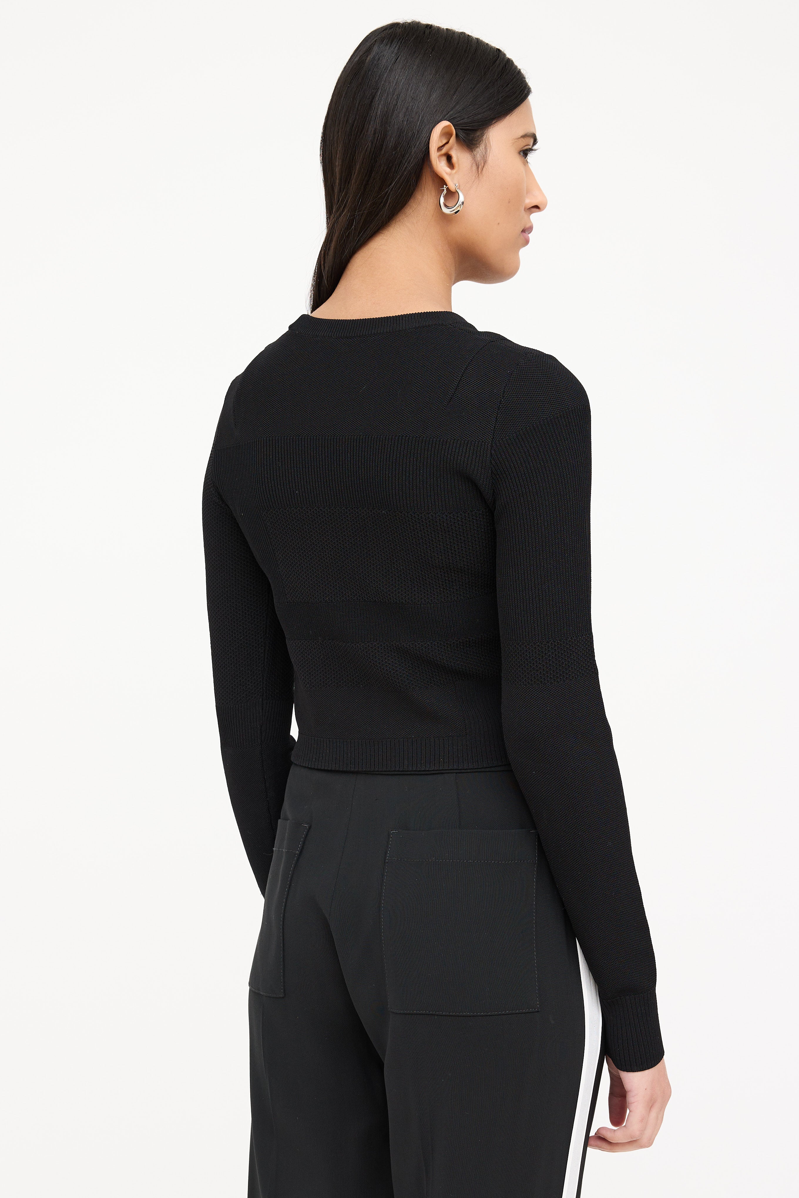 Pre-owned Proenza Schouler black long sleeve crop top featuring round neck, textured and horiztonal stripes.