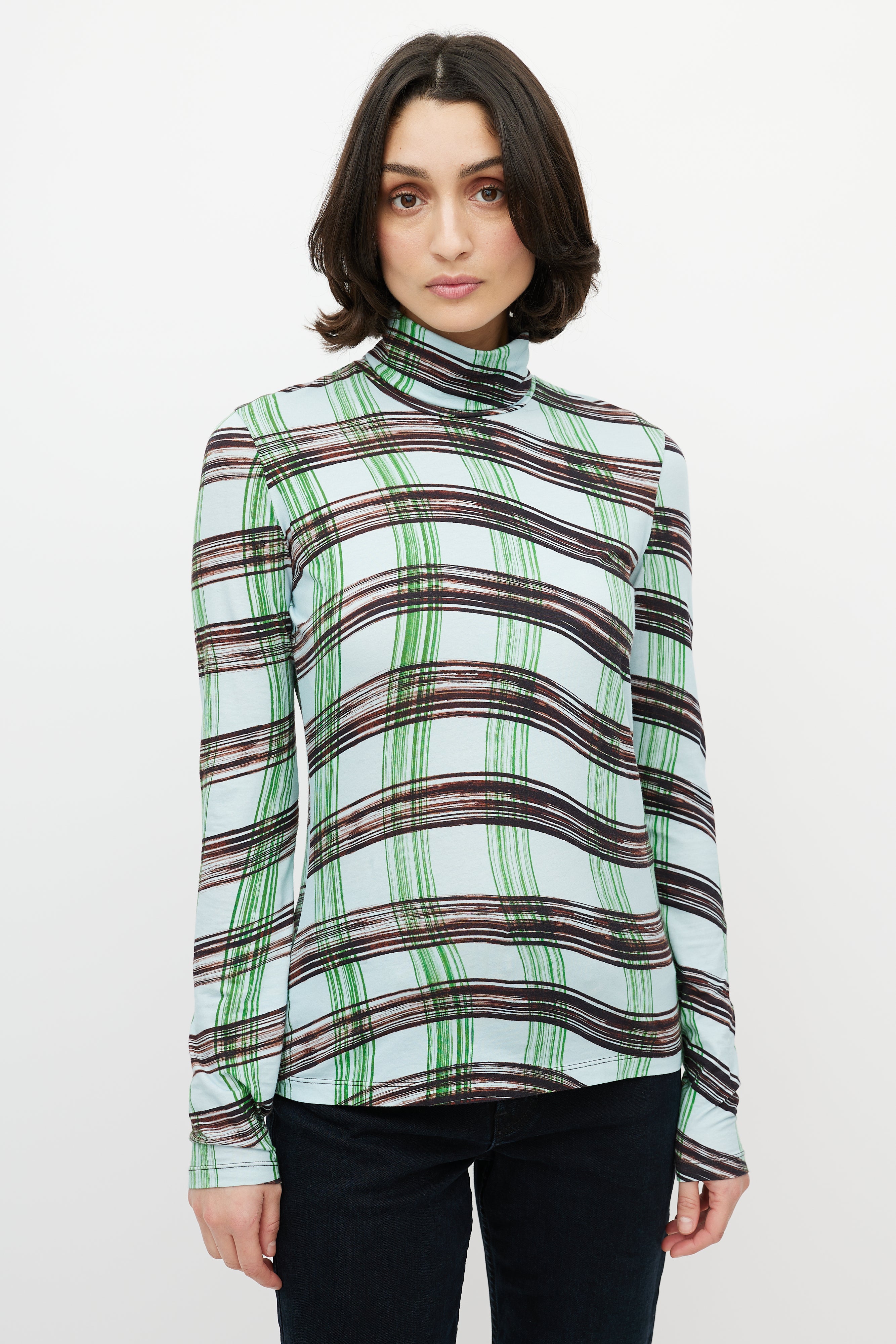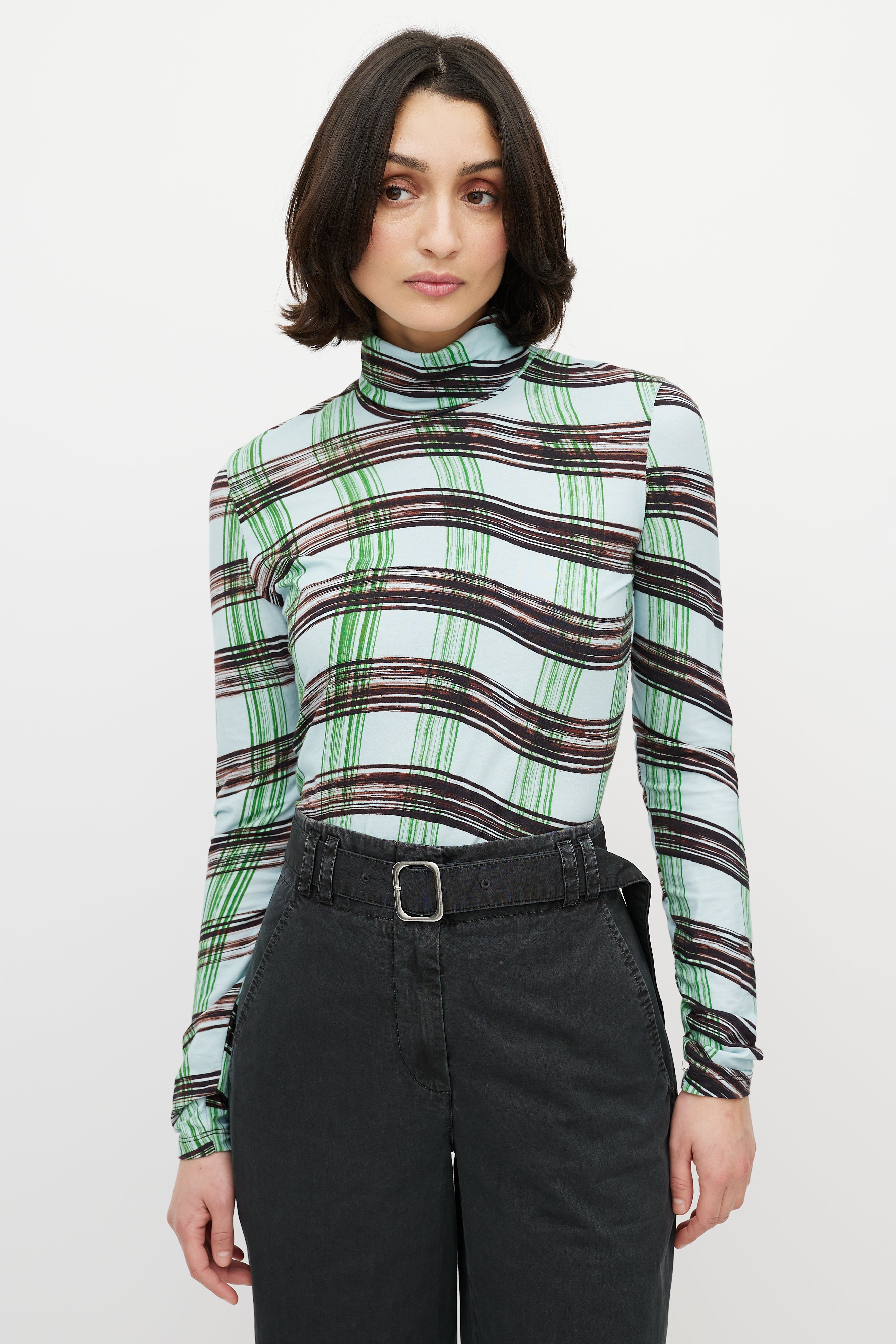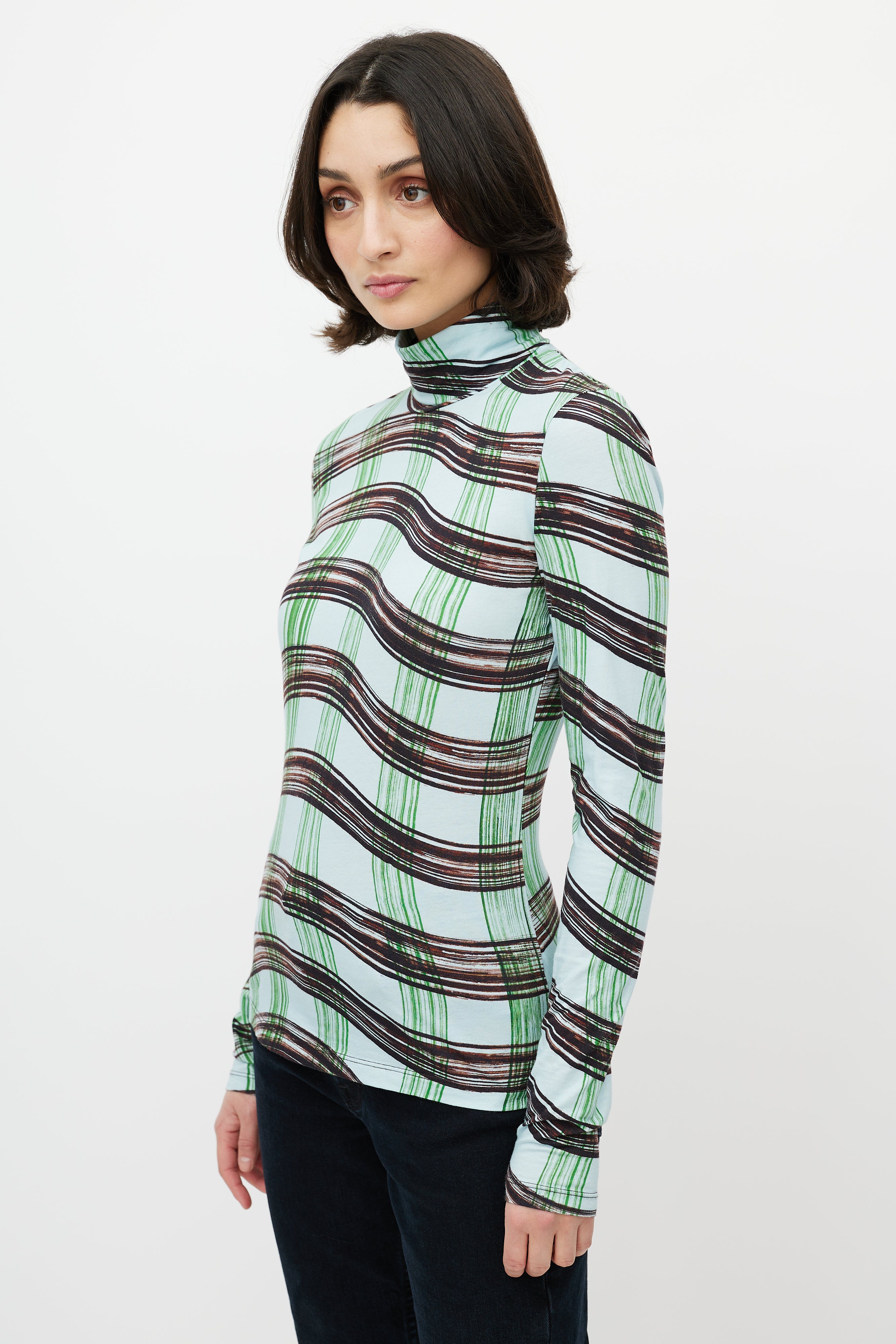 Pre-owned Proenza Schouler White Label blue top featuring green and brown wavy checked print, turtleneck, and long sleeves.
