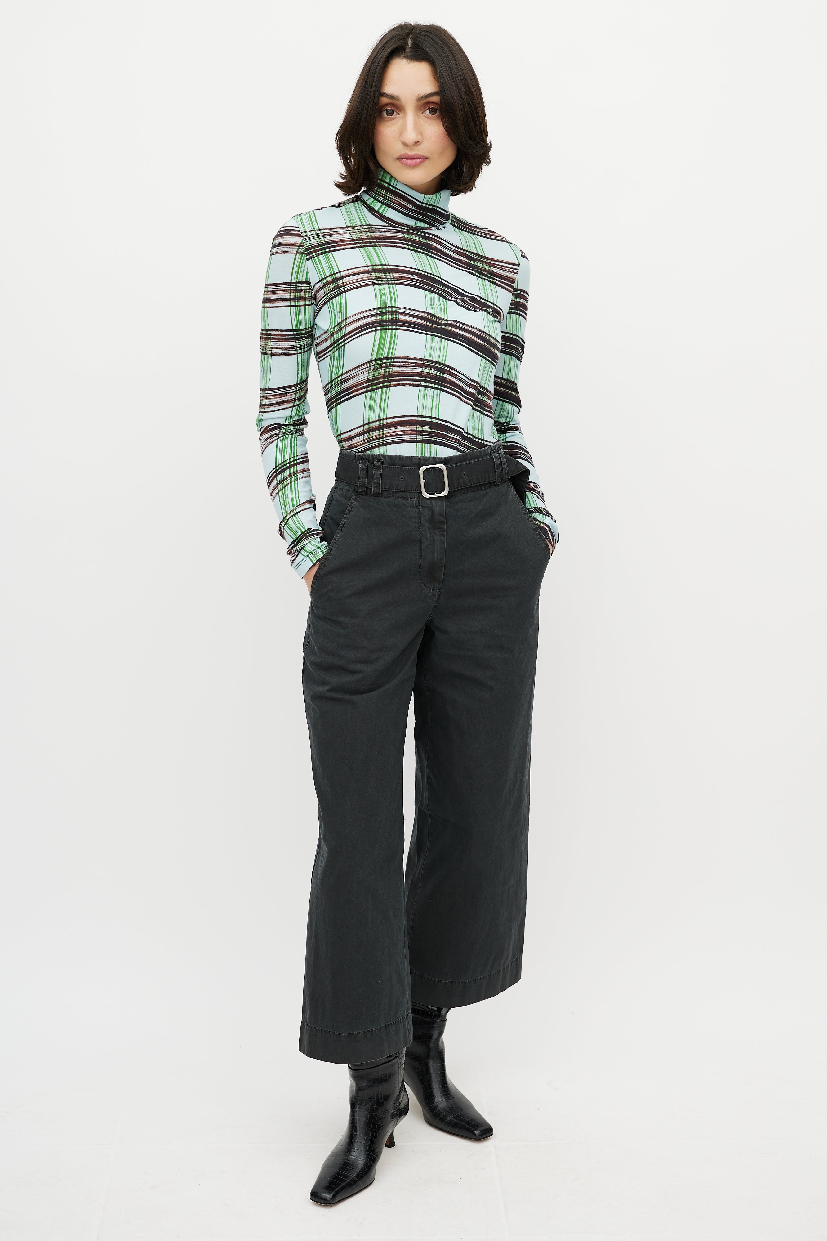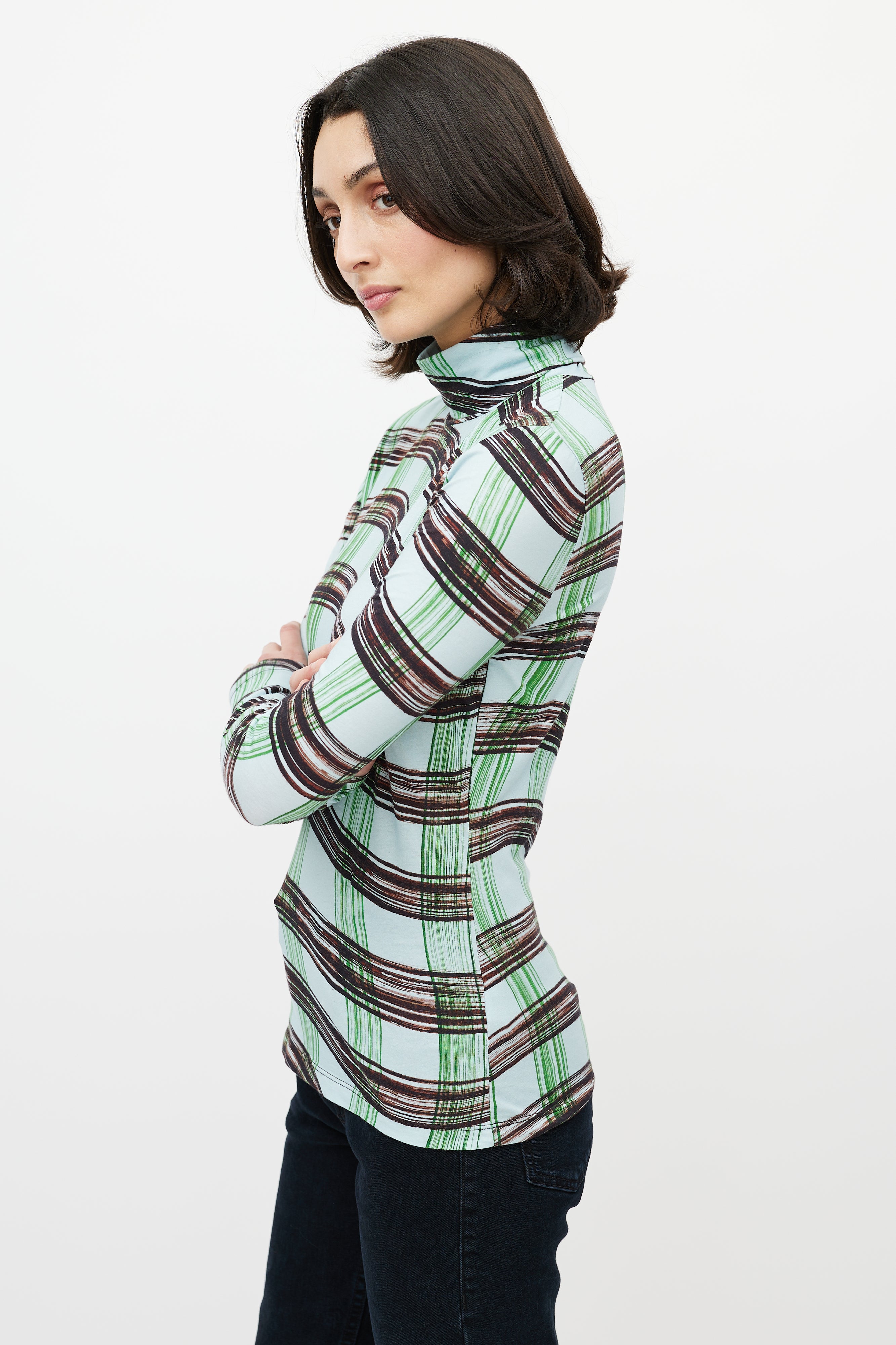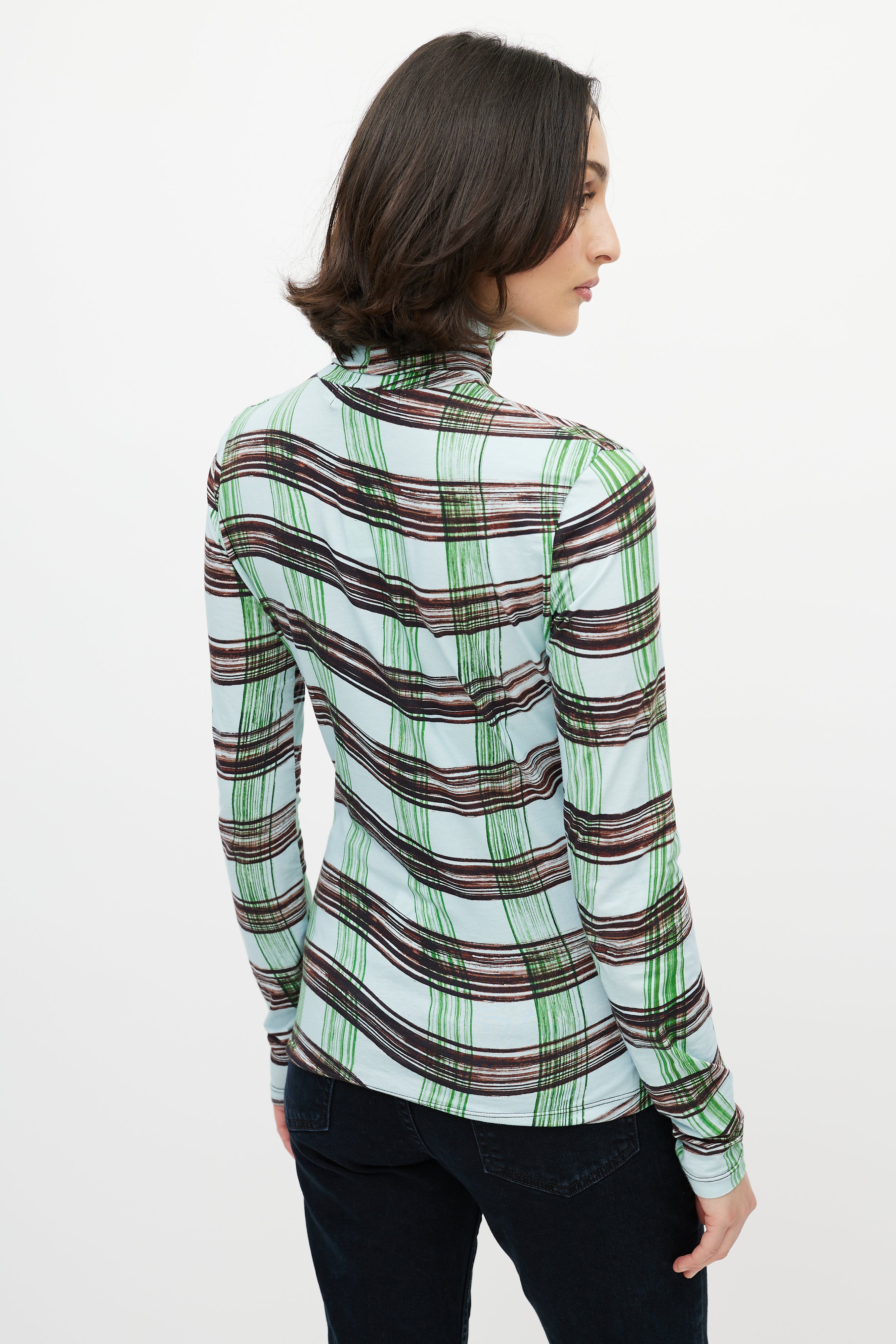 Pre-owned Proenza Schouler White Label blue top featuring green and brown wavy checked print, turtleneck, and long sleeves.
