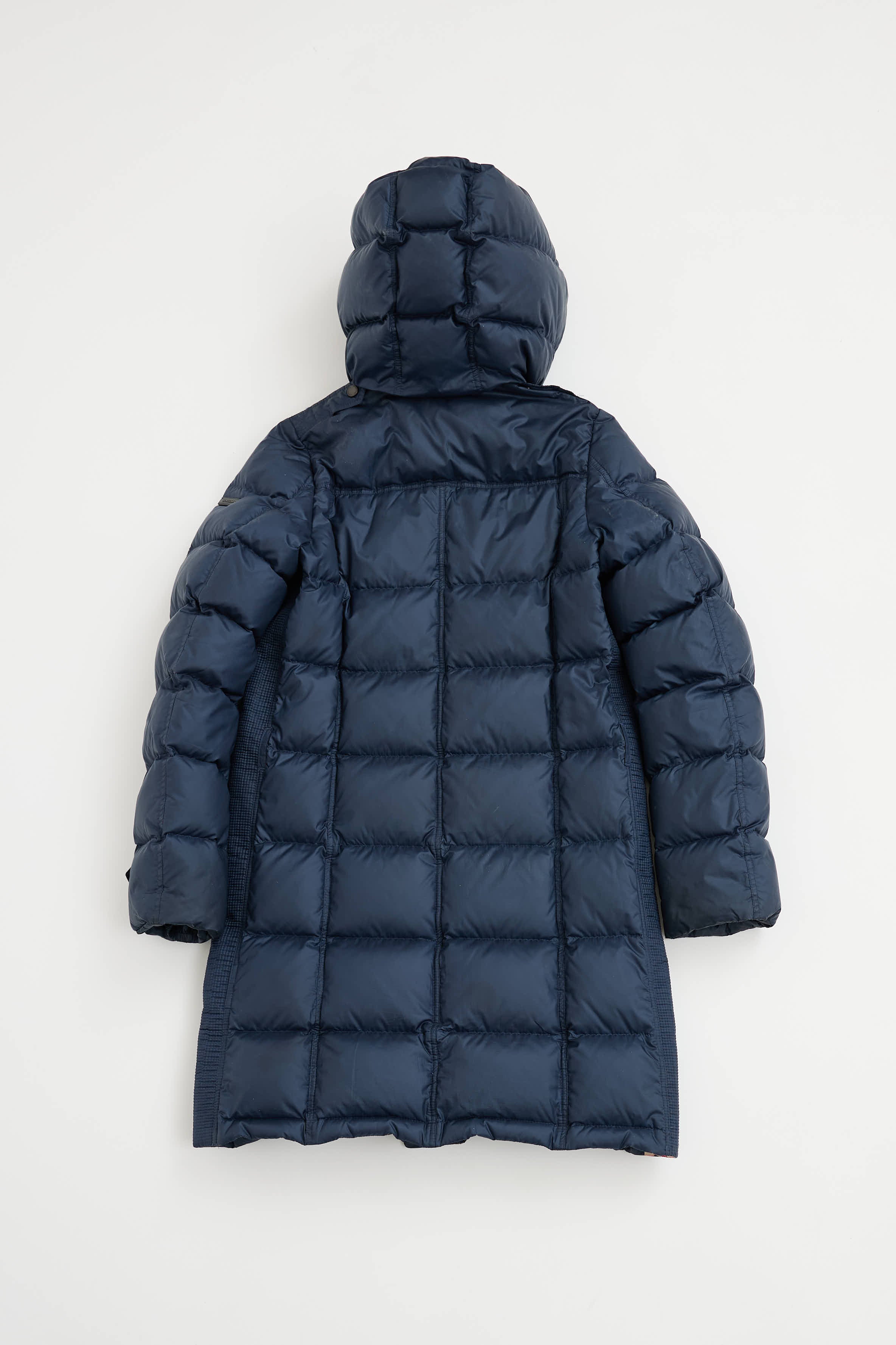 Pre-owned Burberry navy down coat featuring snap button and zip closure, two zippered pockets at front, smocked panels at sides, rubber logo patch at arm, signature nova check lining, and zip closure. Lined.