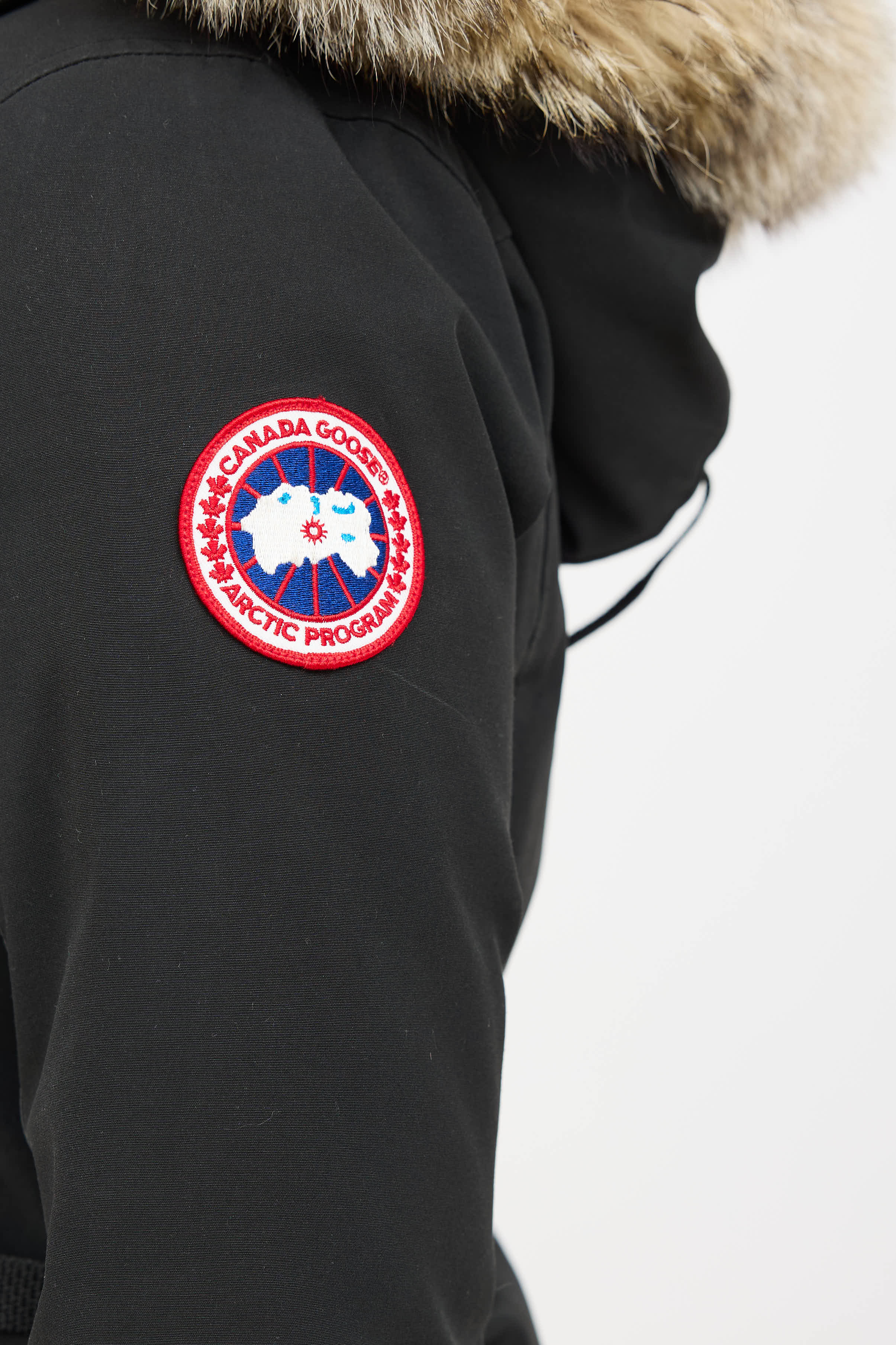 Pre-owned Canada Goose black Kensington down parka featuring a removable hood with coyote fur trim, long sleeves with ribbed cuffs, embroidered logo patch at shoulder, two slip pockets at chest, two flap pockets at hip with logo embroidery, straps at waist, interior backpack straps, and zip front with toggle button closure. Lined.