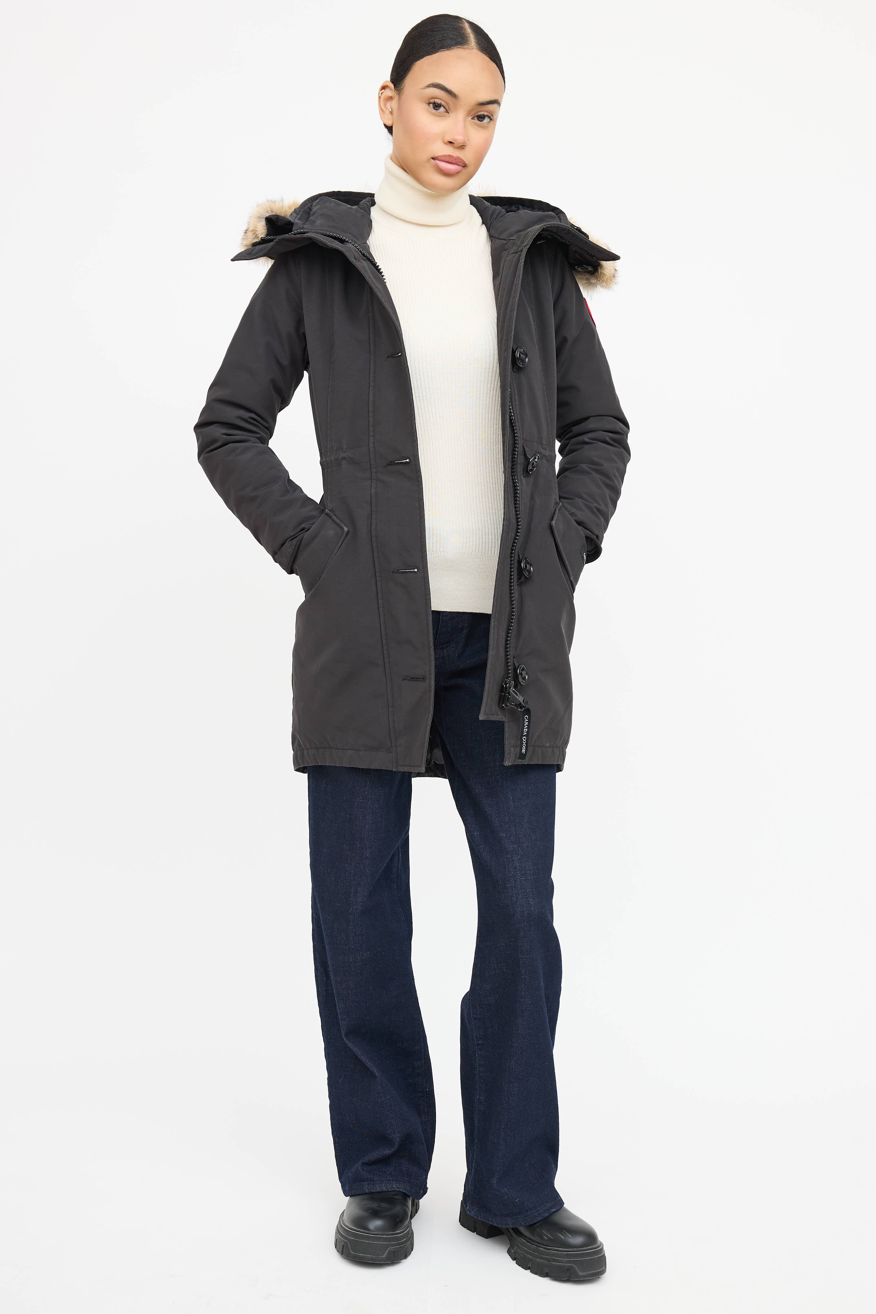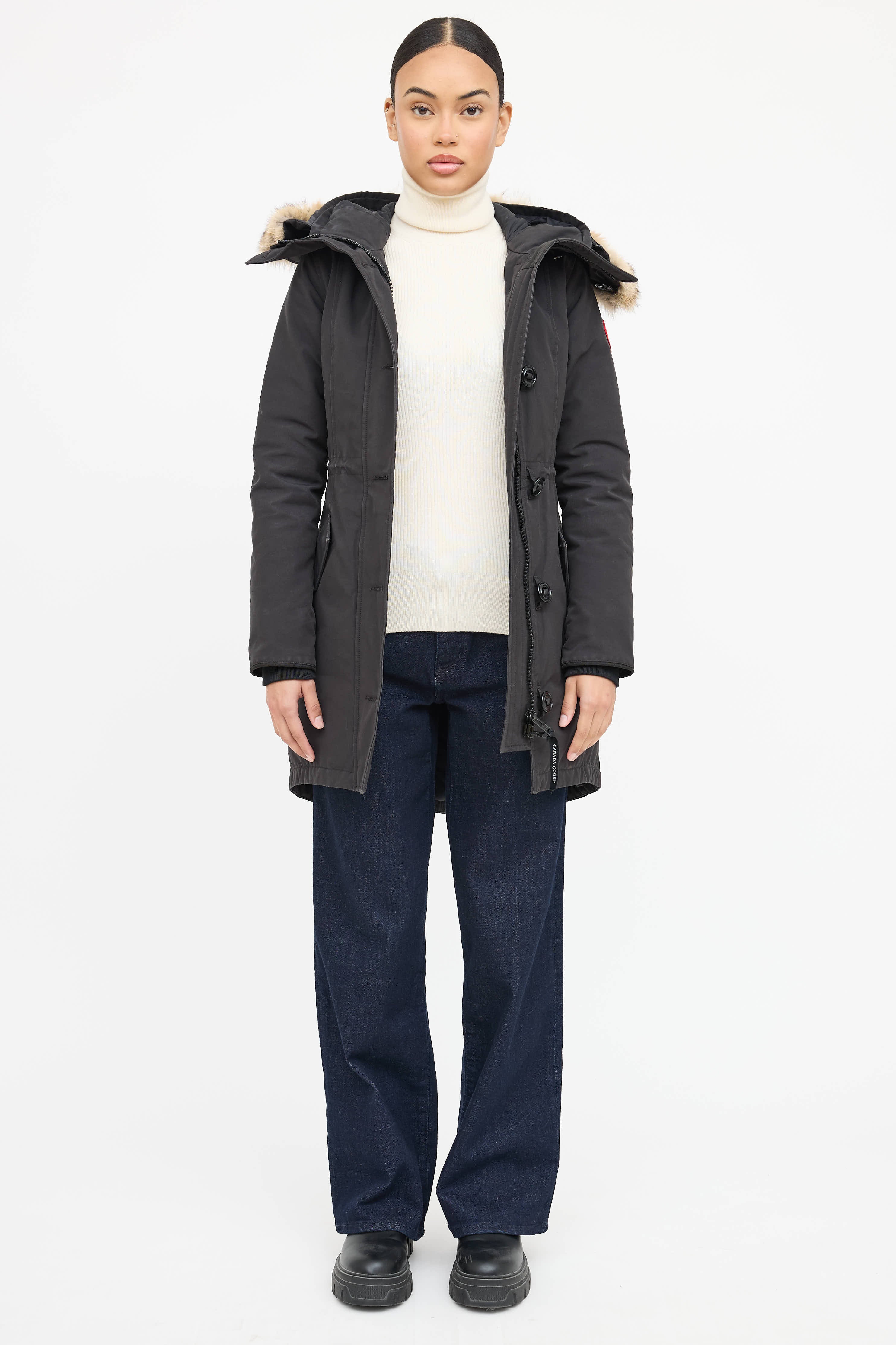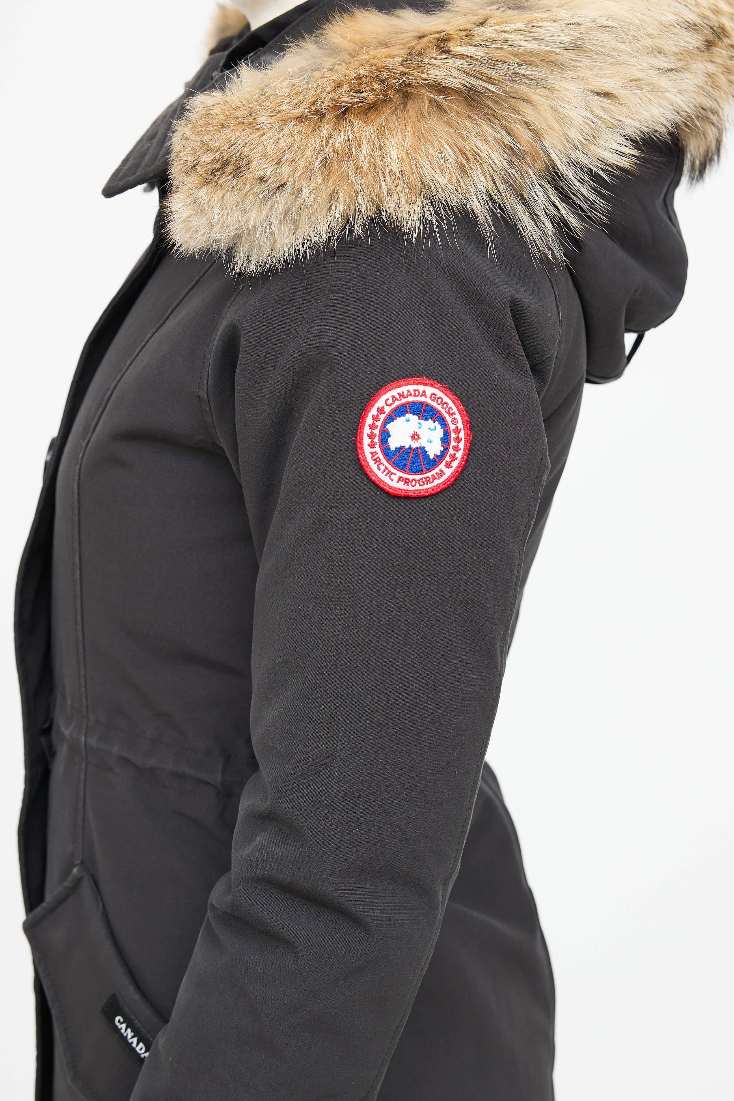 Pre-owned Canada Goose black Rossclair down long sleeve parka featuring removeable hood with coyote fur trim, drawstring on hood, zip and button up, flap and slip pockets at waist with logo embroidery, logo patch on left sleeve, knit cuffs, zip vent on back, interior backpack straps, and cinched drawstring waist.