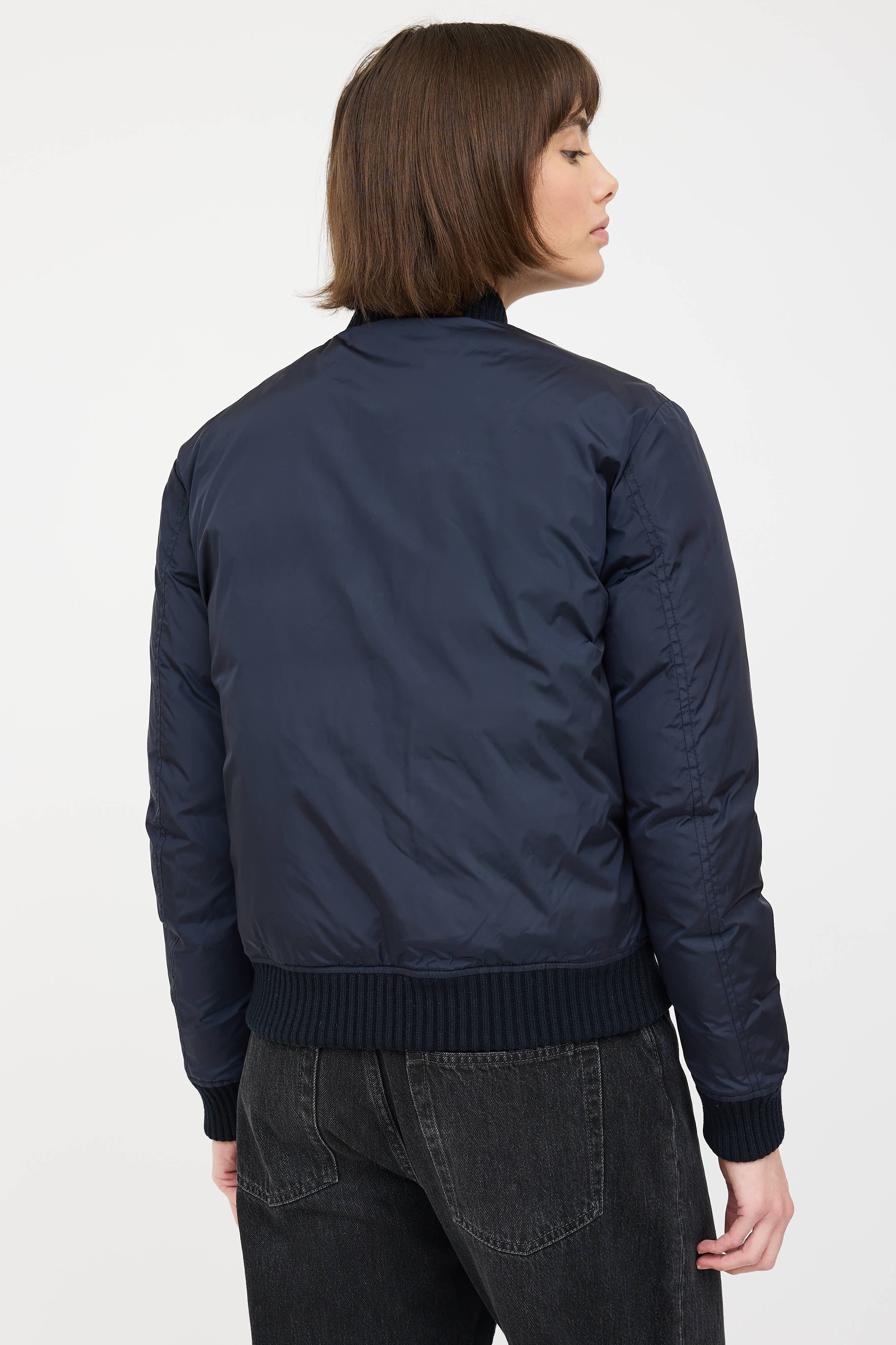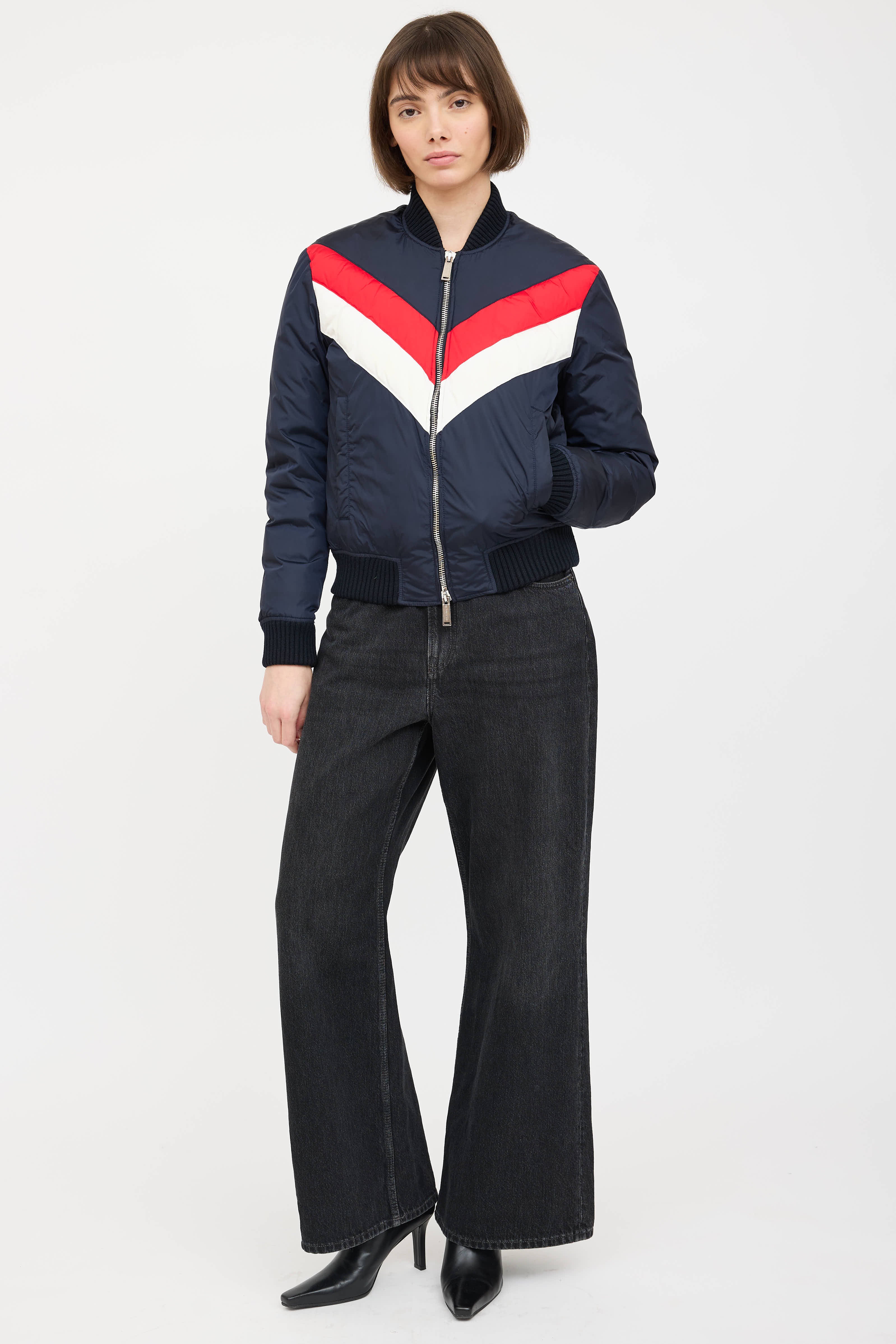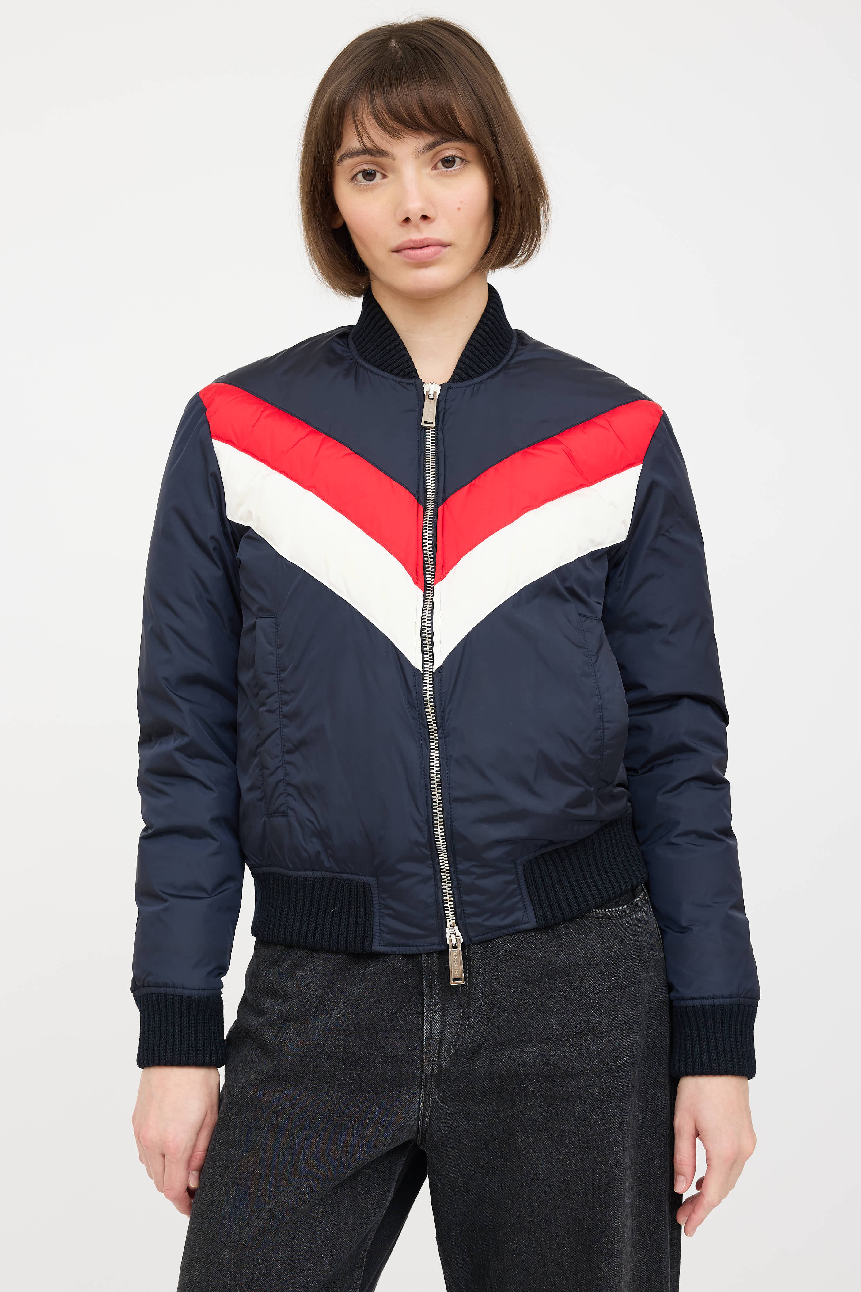 Pre-owned DSquared2 navy down bomber jacket featuring multicolour striping at chest, stand collar, long sleeves, two slip pockets at hip, quilted stitching, and zip closure. Lined.