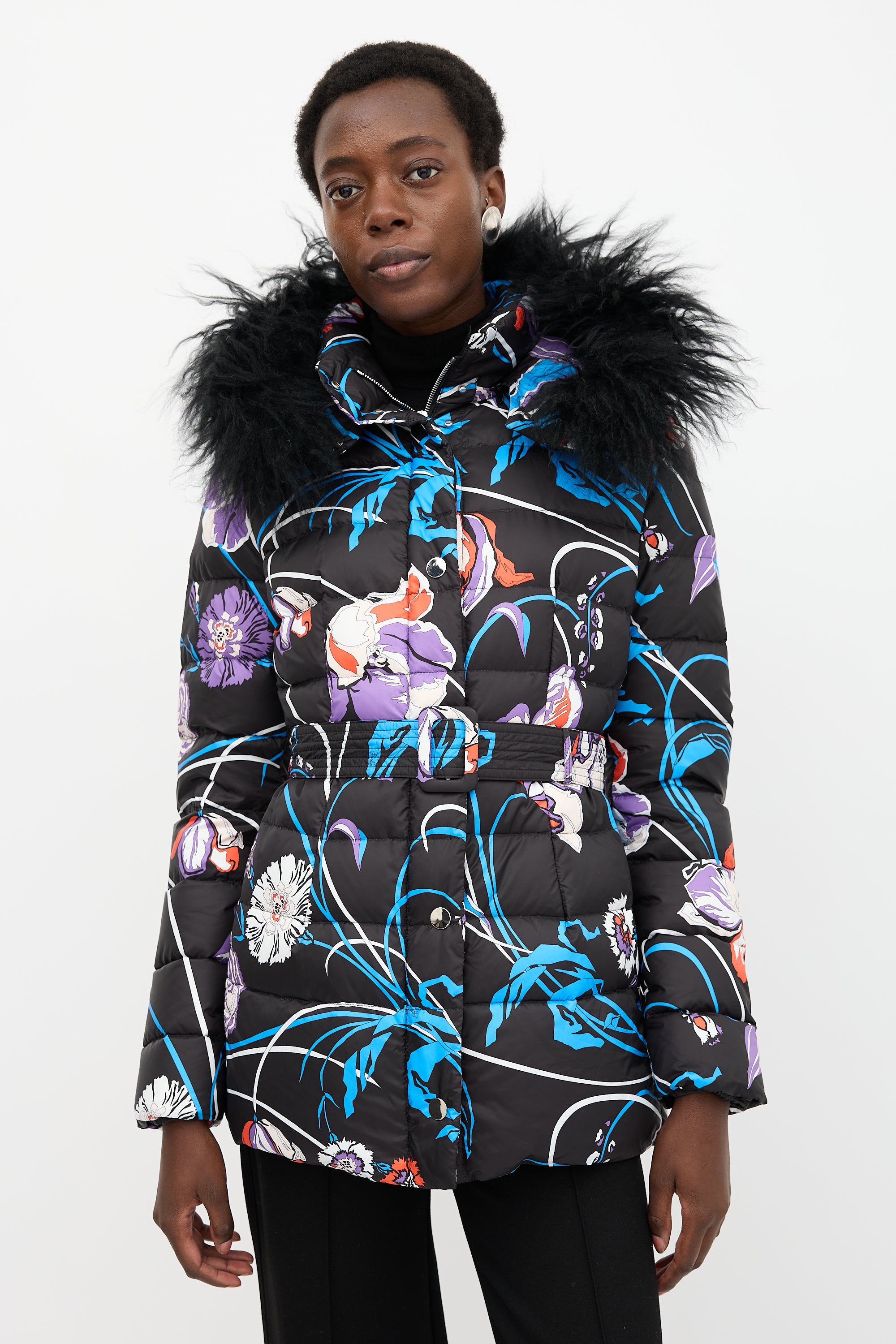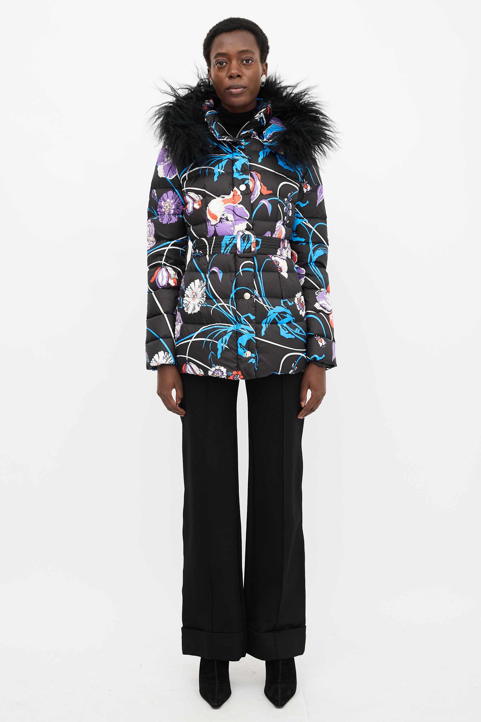 Pre-owned Emilio Pucci black down filled coat featuring a blue and multicolour floral print throughout, a funnel neck, detachable zip hood and detachable black lamb shearling trim, zip front with snap button placket, silver tone hardware, matching belt at waist, and elastic interior cuffs.