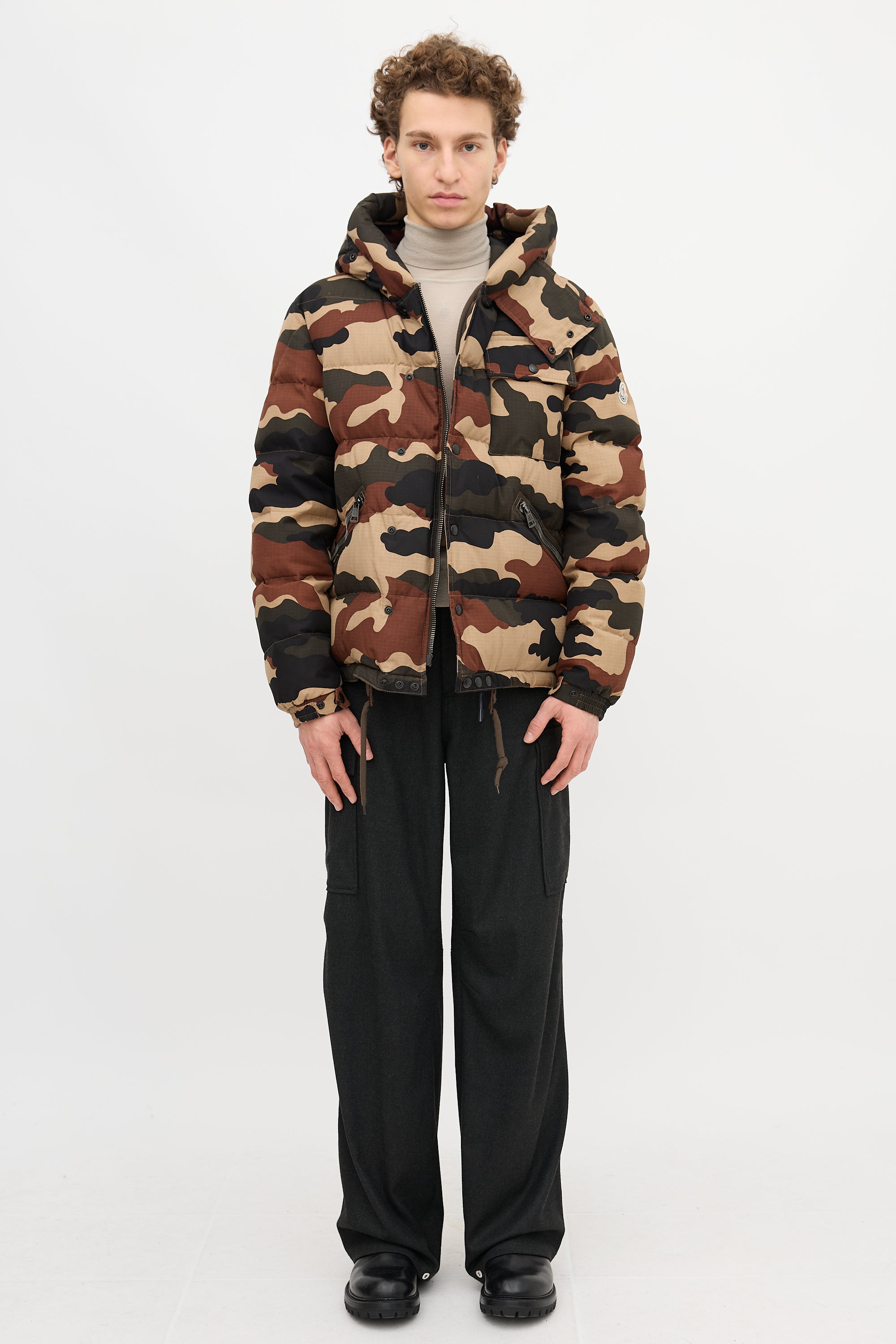 Pre-owned Moncler green and brown down Lioran puffer jacket featuring camouflage print, attached hood with front flap, two way zip up front, snap button placket, three front pockets, one interior pocket, drawstring hem, logo patch at left arm, and elasticized cuffs. Padded and lined.