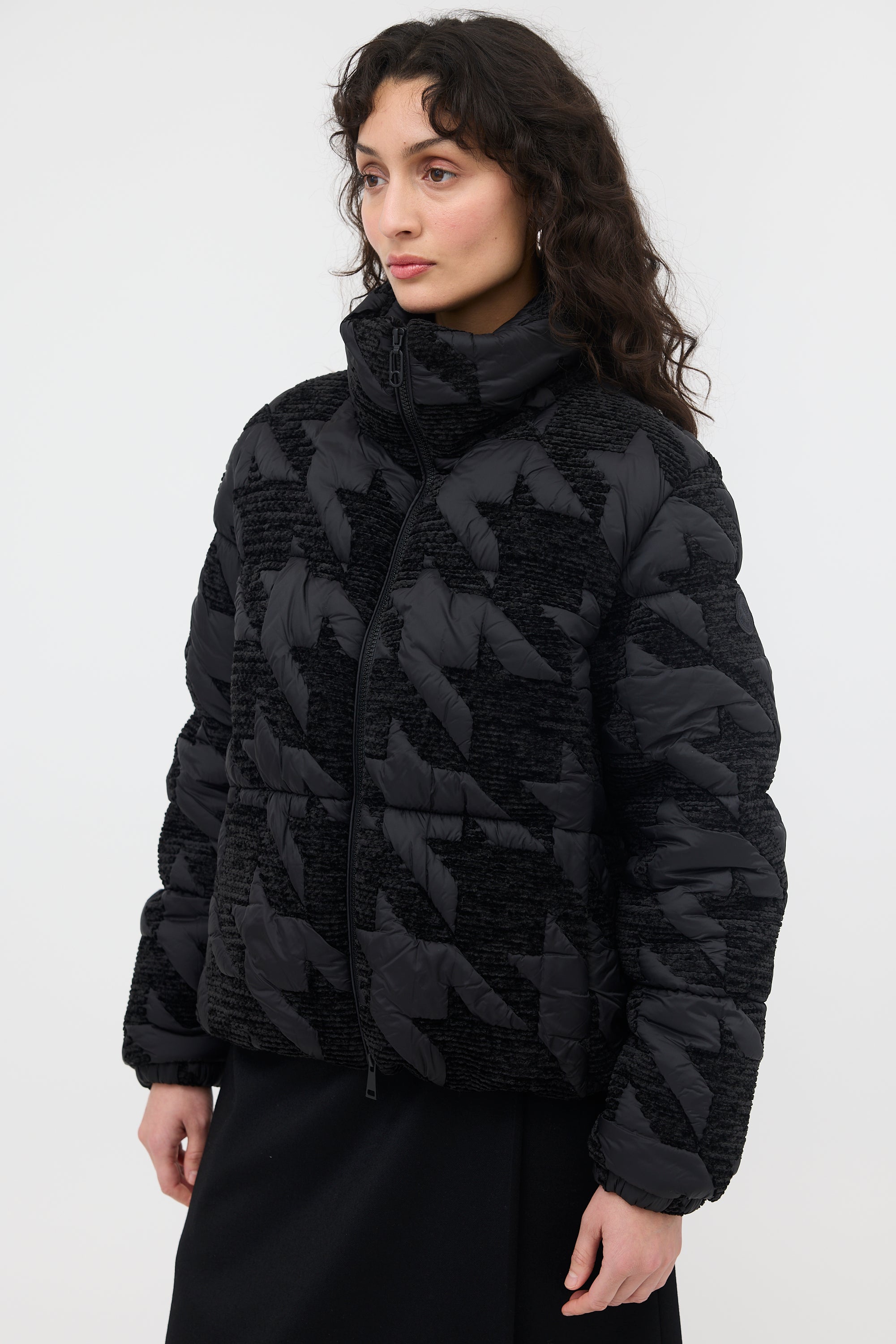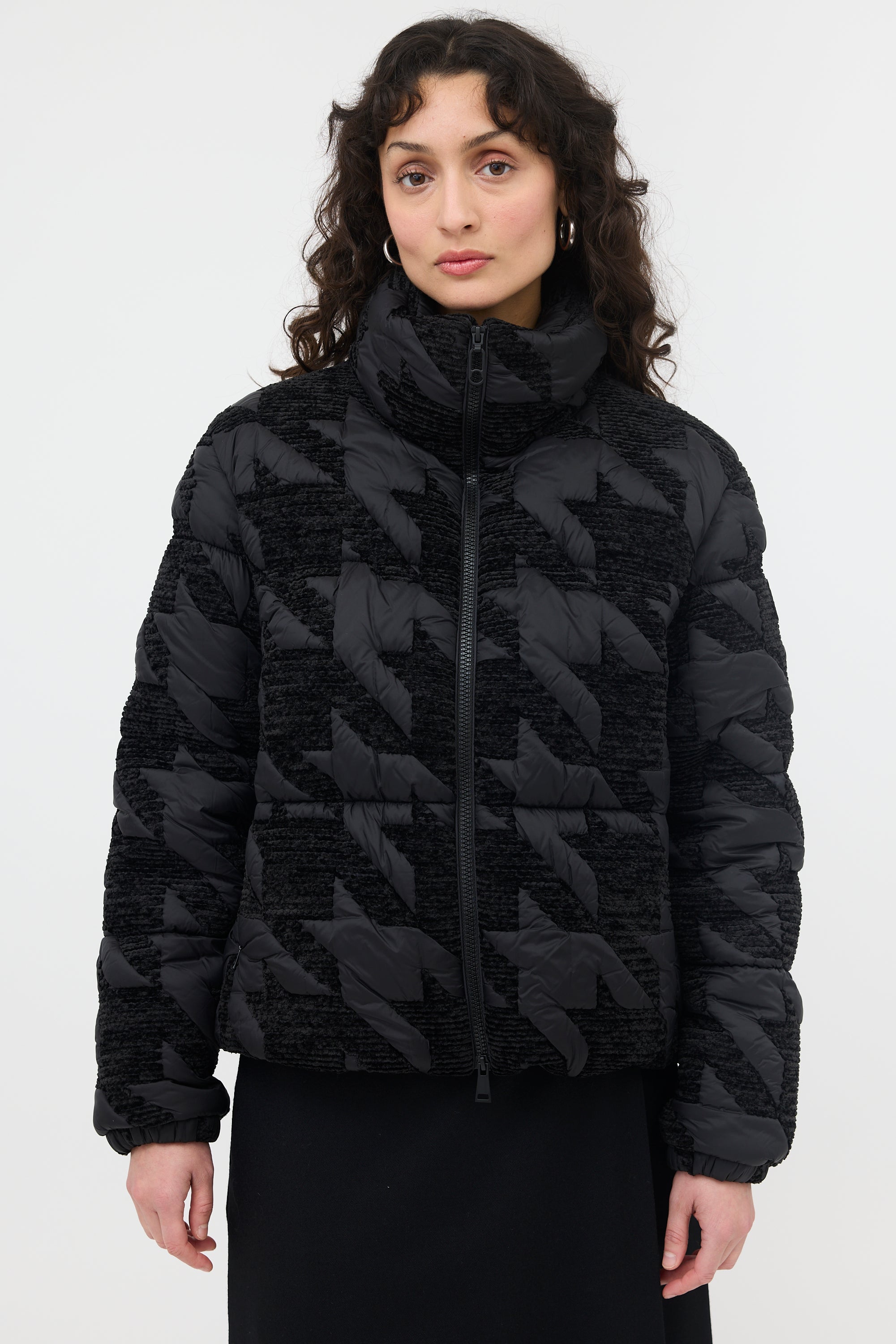 Pre-owned Moncler black down Evandra puffer jacket featuring a tonal velvet Houndstooth pattern, stand collar, front zip, zip pockets, and drawstring hem.