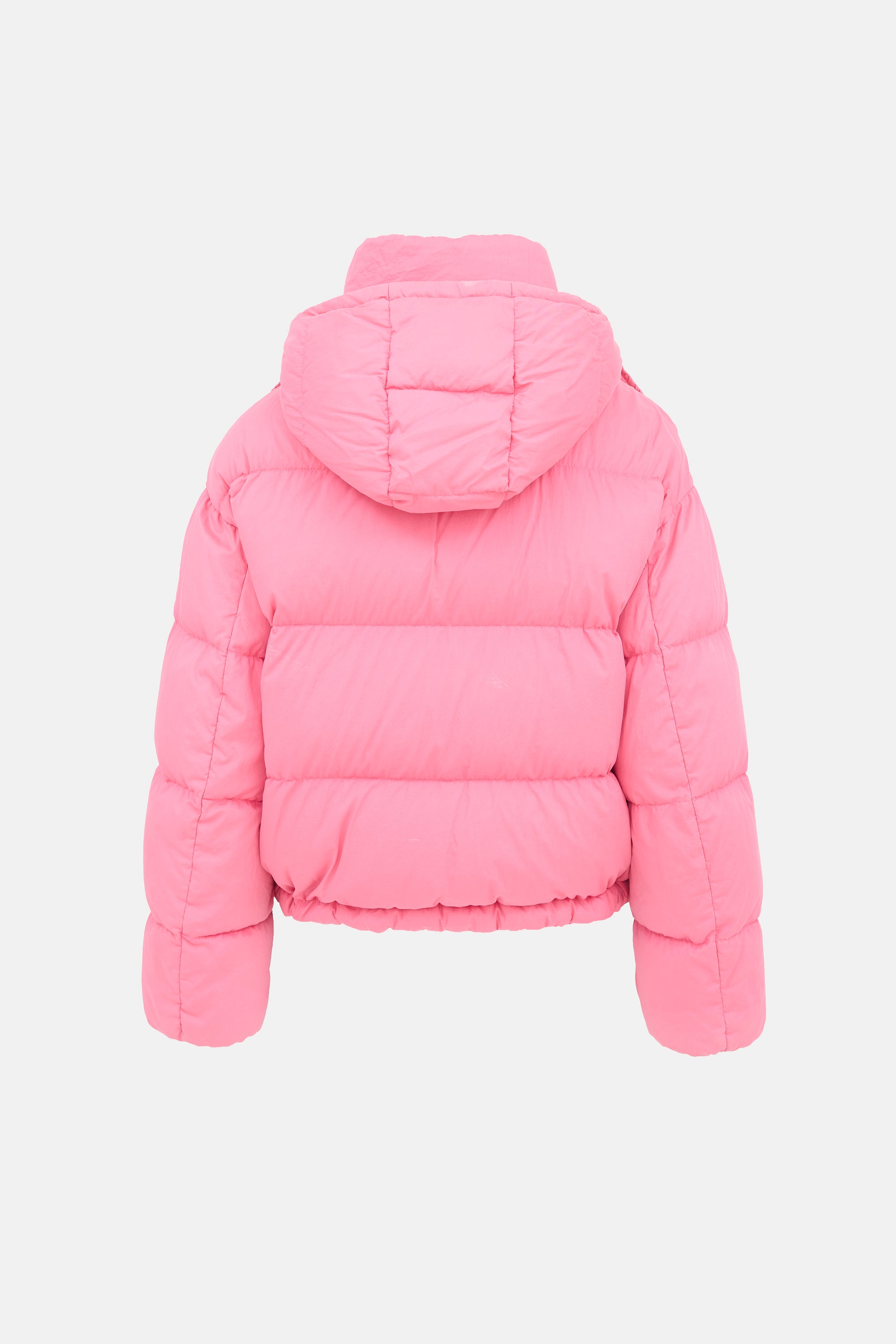 Pre-owned Moncler pink down-filled Onia jacket featuring a detachable zip hood, funnel neck, button front, two buttoned slip pockets at hip, logo patch at left sleeve, drawstring hem, and elasticized cuffs. Lined.