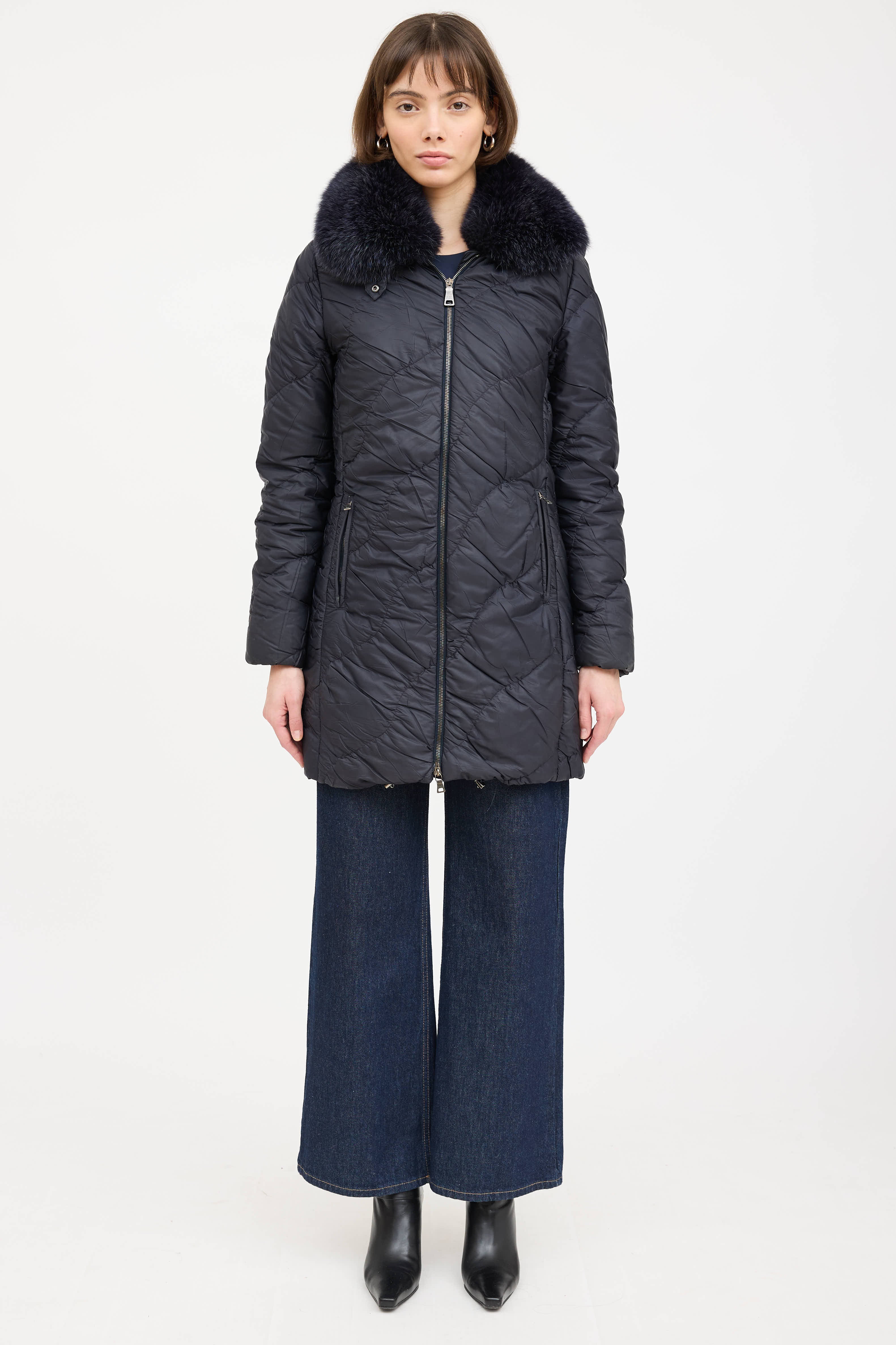 Pre-owned Prada navy nylon parka featuring a removable hood, funnel neck collar with dyed white fox fur trim, long sleeves with buttoned cuffs, two zip pockets at hip, drawstring hem, and zip closure.