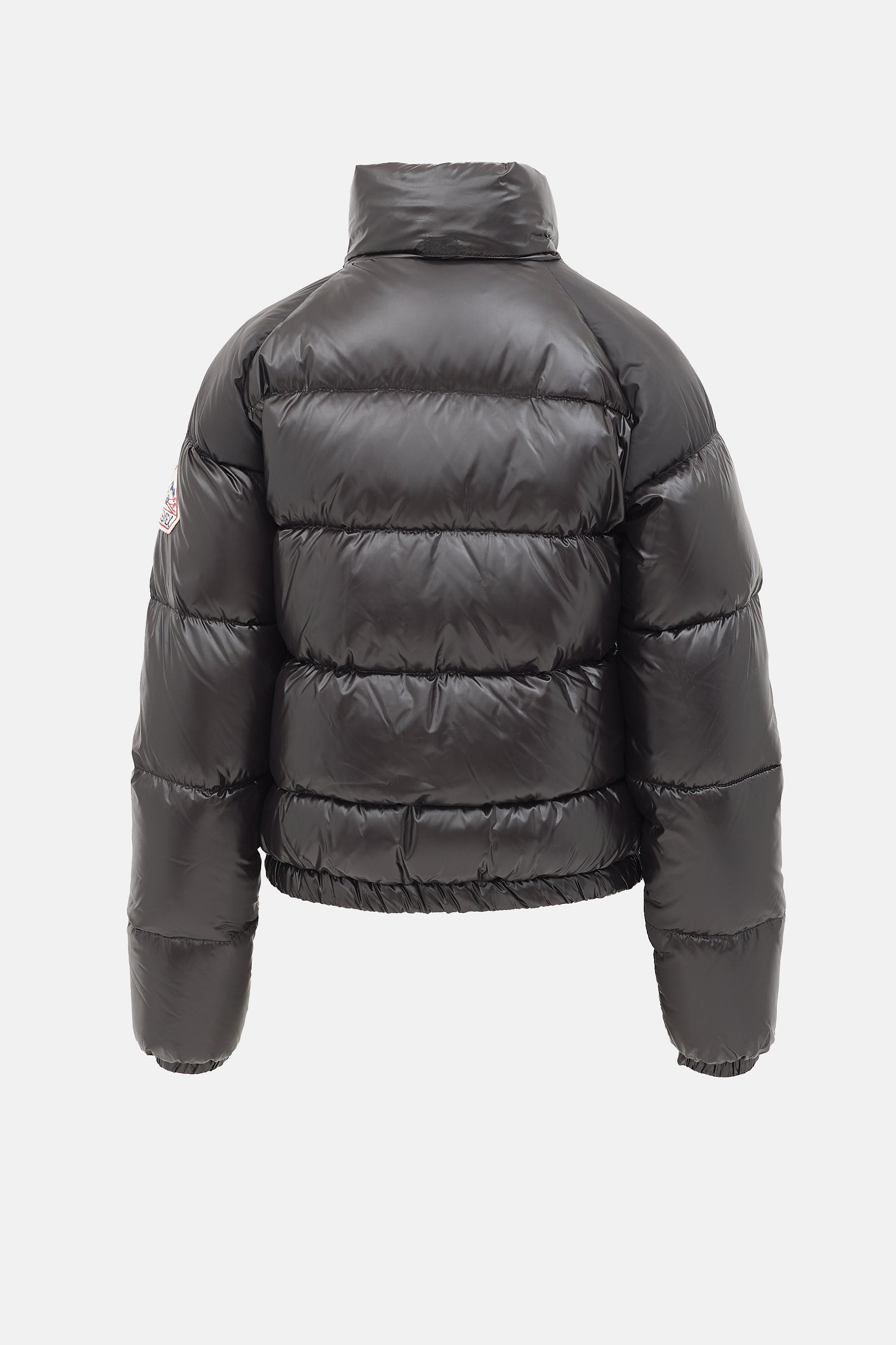 Pre-owned Pyrenex black shiny down-filled Vintage Mythic jacket featuring a funnel collar, packable hood, zip front, two zip pockets, felted logo patch at left arm, and an elasticized hem and cuffs. Lined.