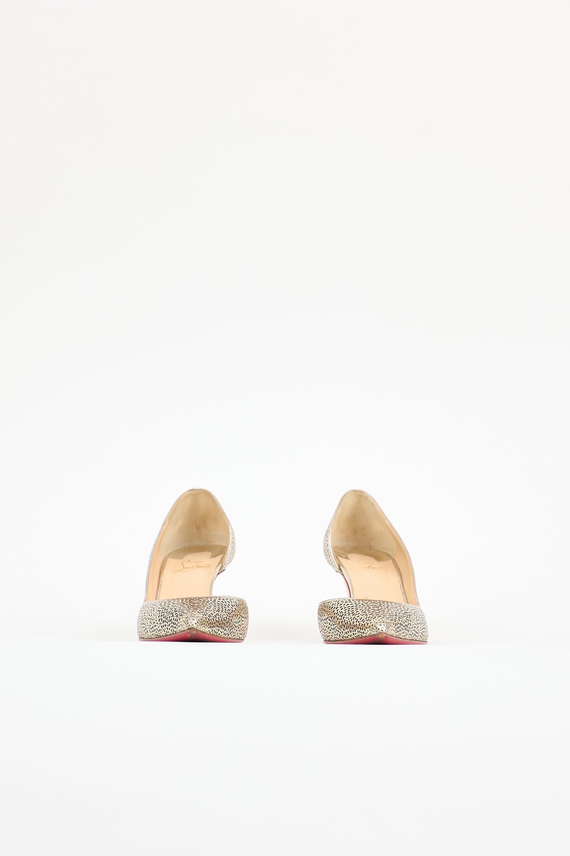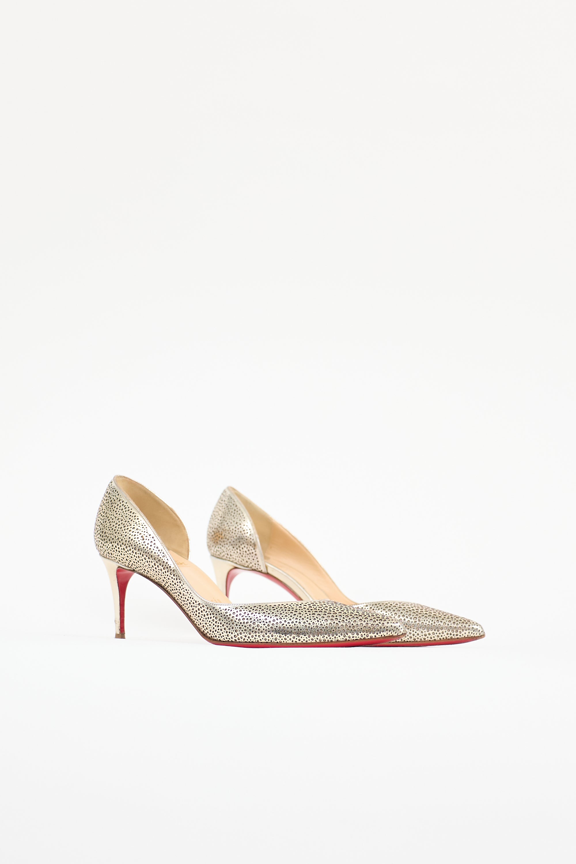 Pre-owned Christian Louboutin gold patent leather Galupump featuring laser cut design with glitter underlayer, pointed toe, D-orsay design, covered kitten heel, and signature red lacquered outsole.