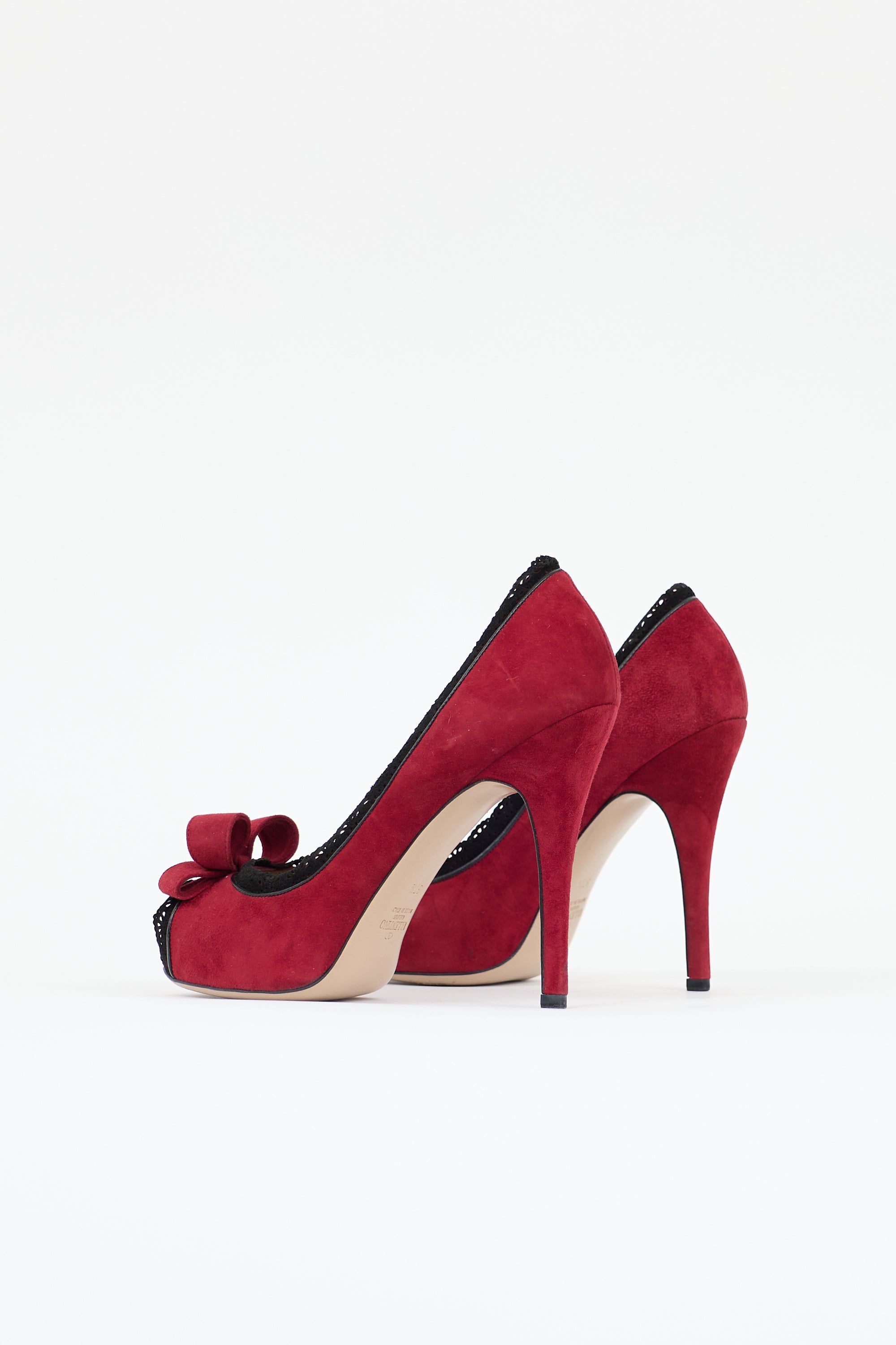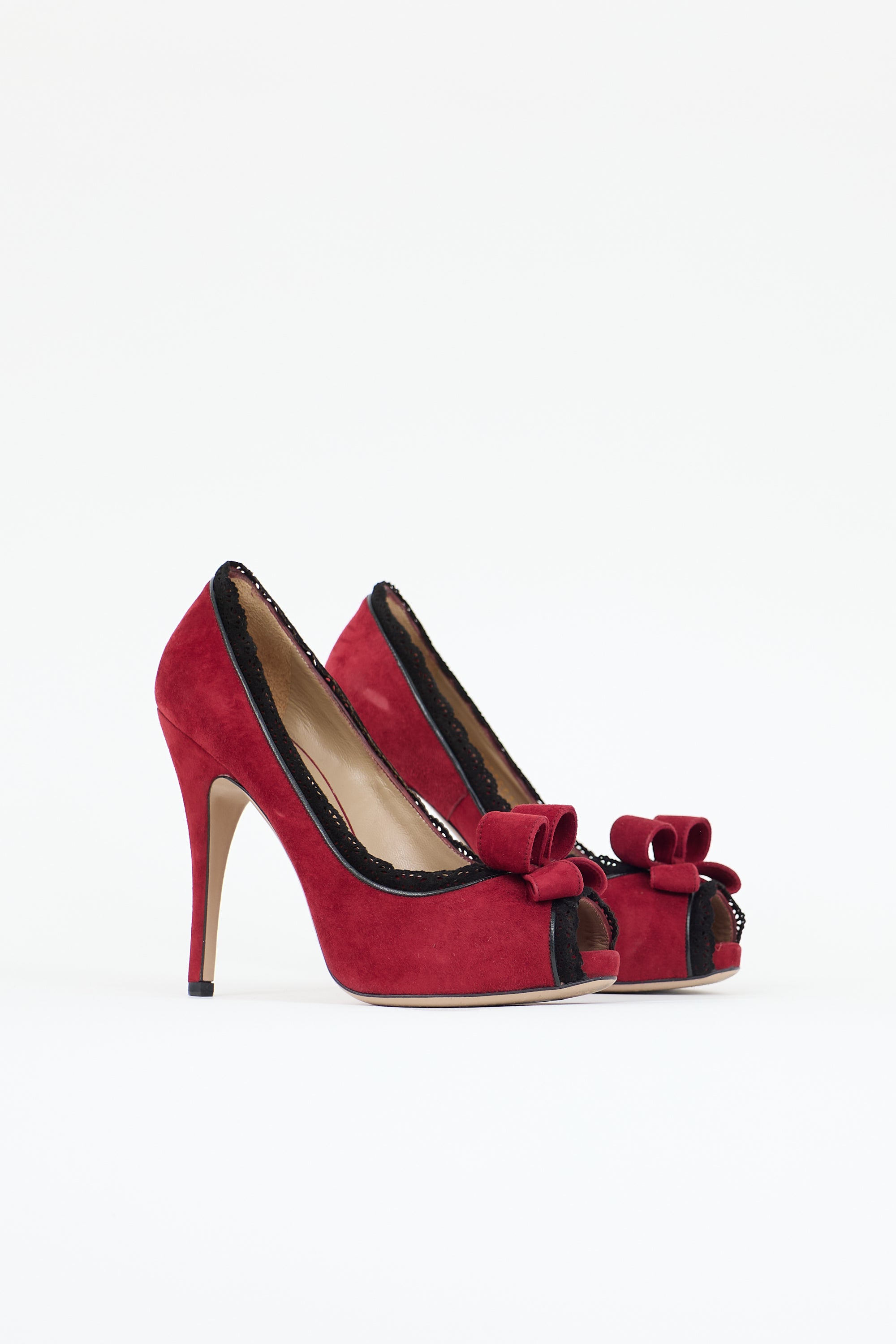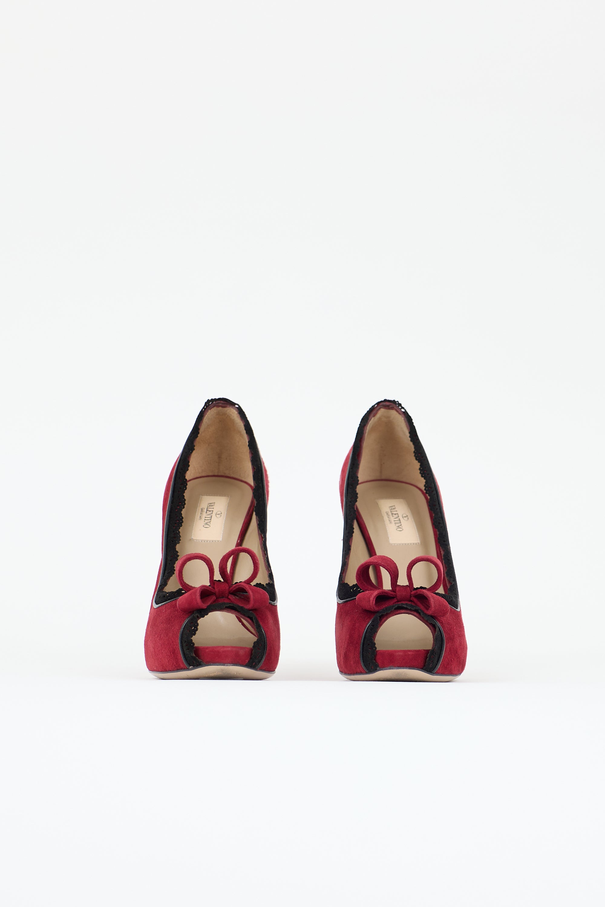 Pre-owned Valentino red suede pumps featuring an almond peep toe, bow at vamp, scalloped lace trim at collar, and a covered stiletto heel and platform.