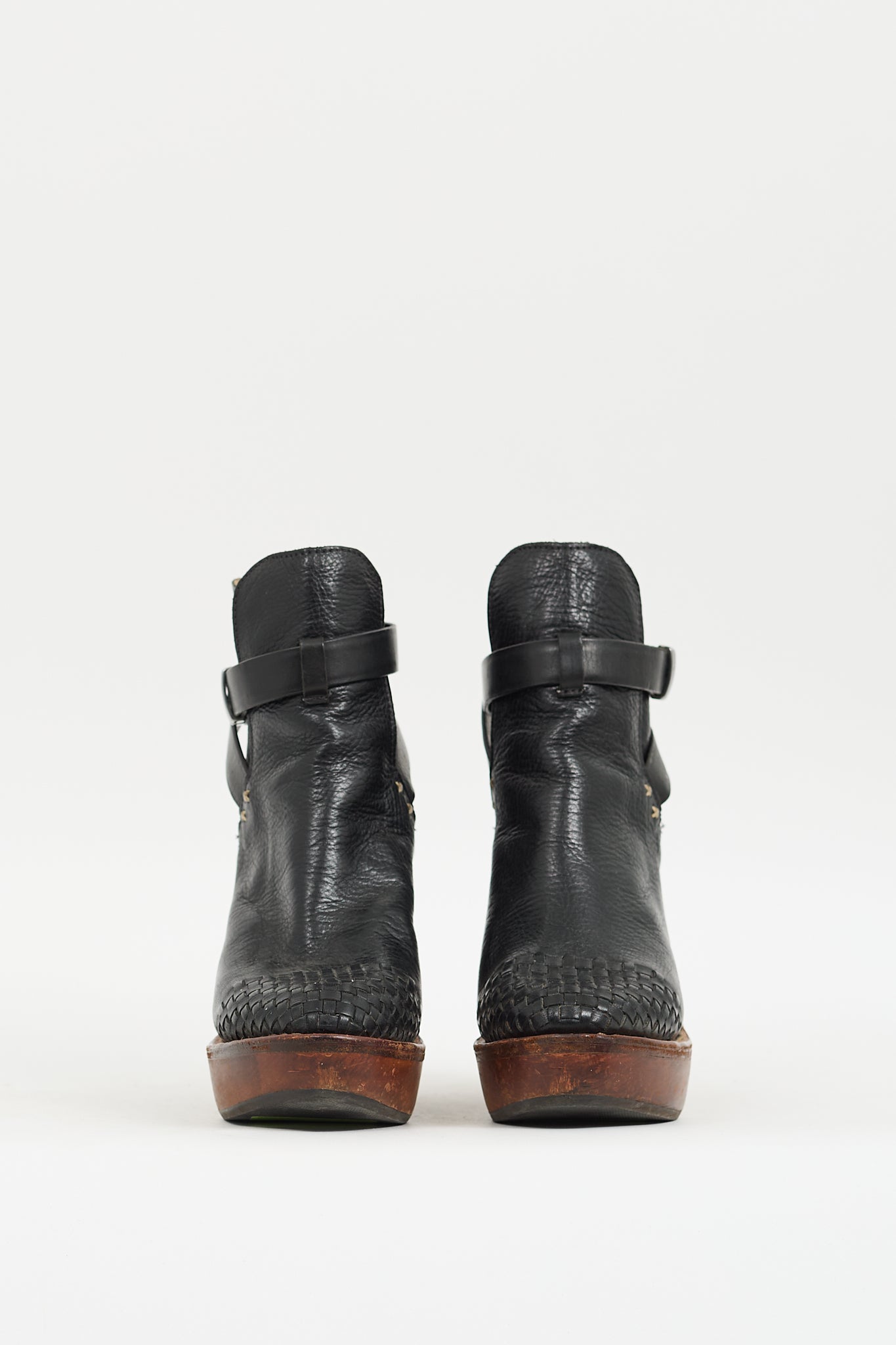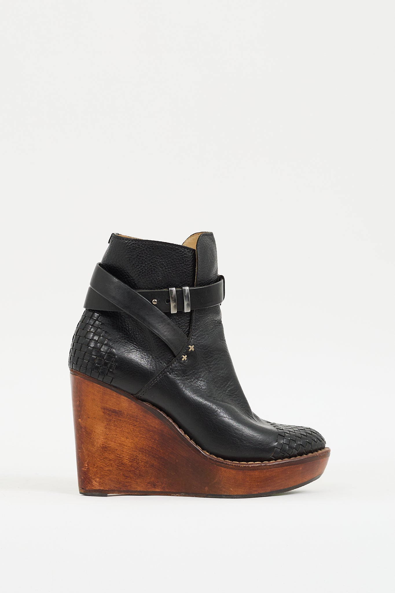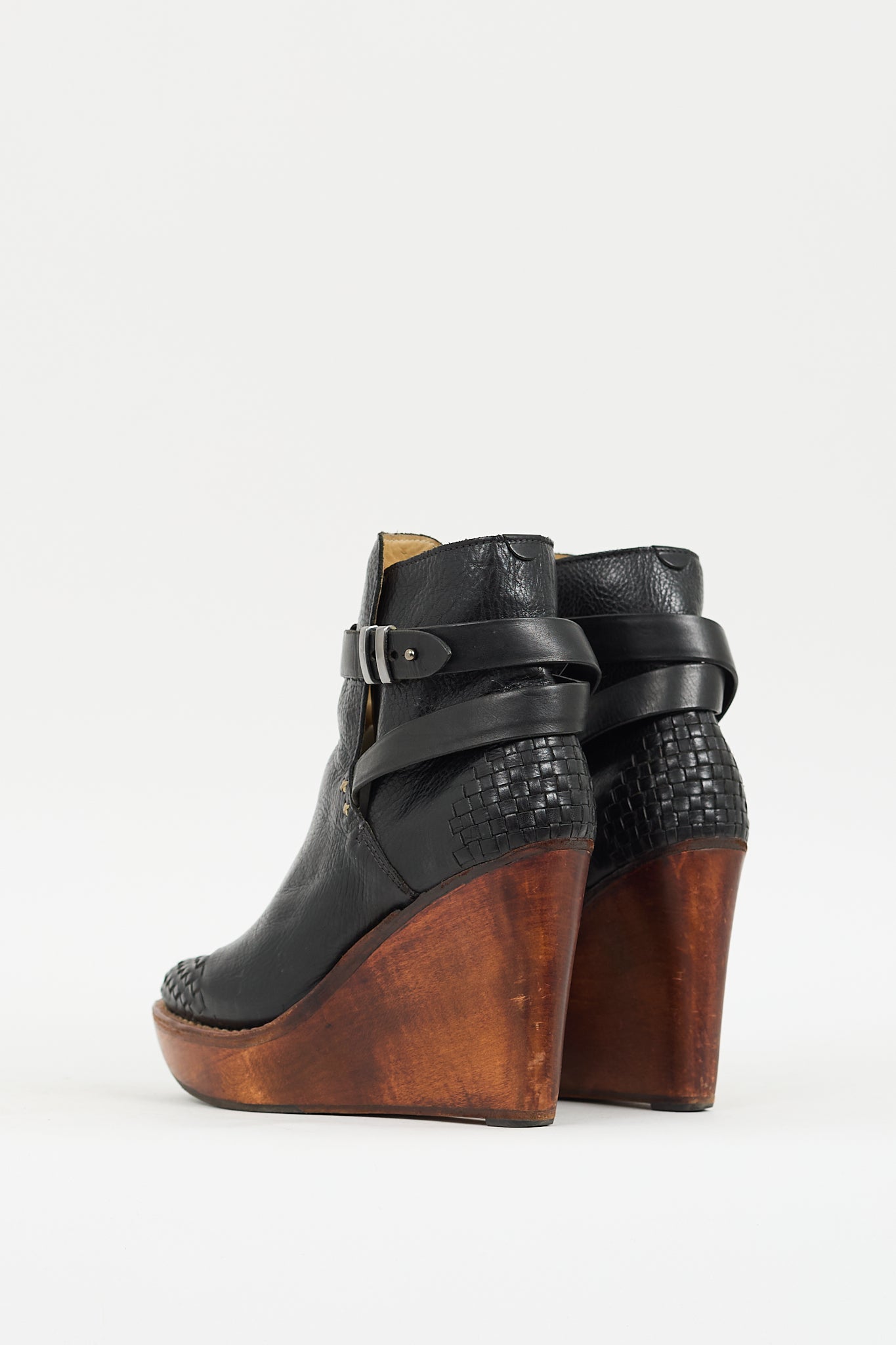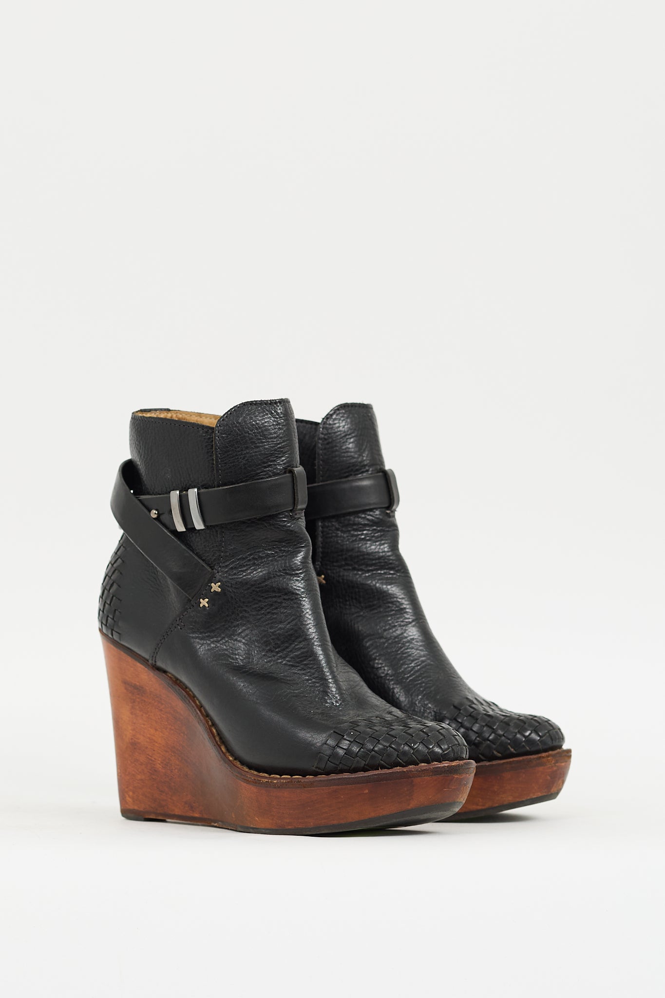 Pre-owned Rag & Bone black boots featuring a rounded toe, leather upper with woven detail at toe and heel, notched topline, wraparound strap, and brown wooden platform wedge.