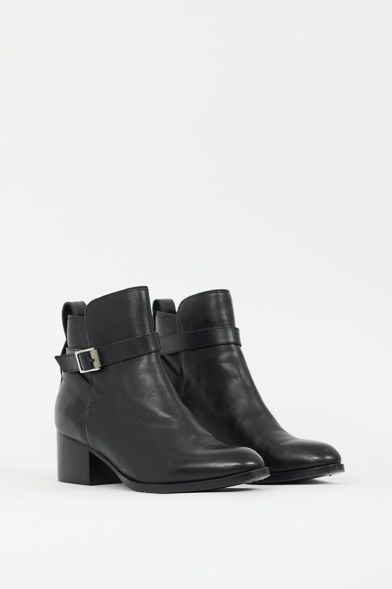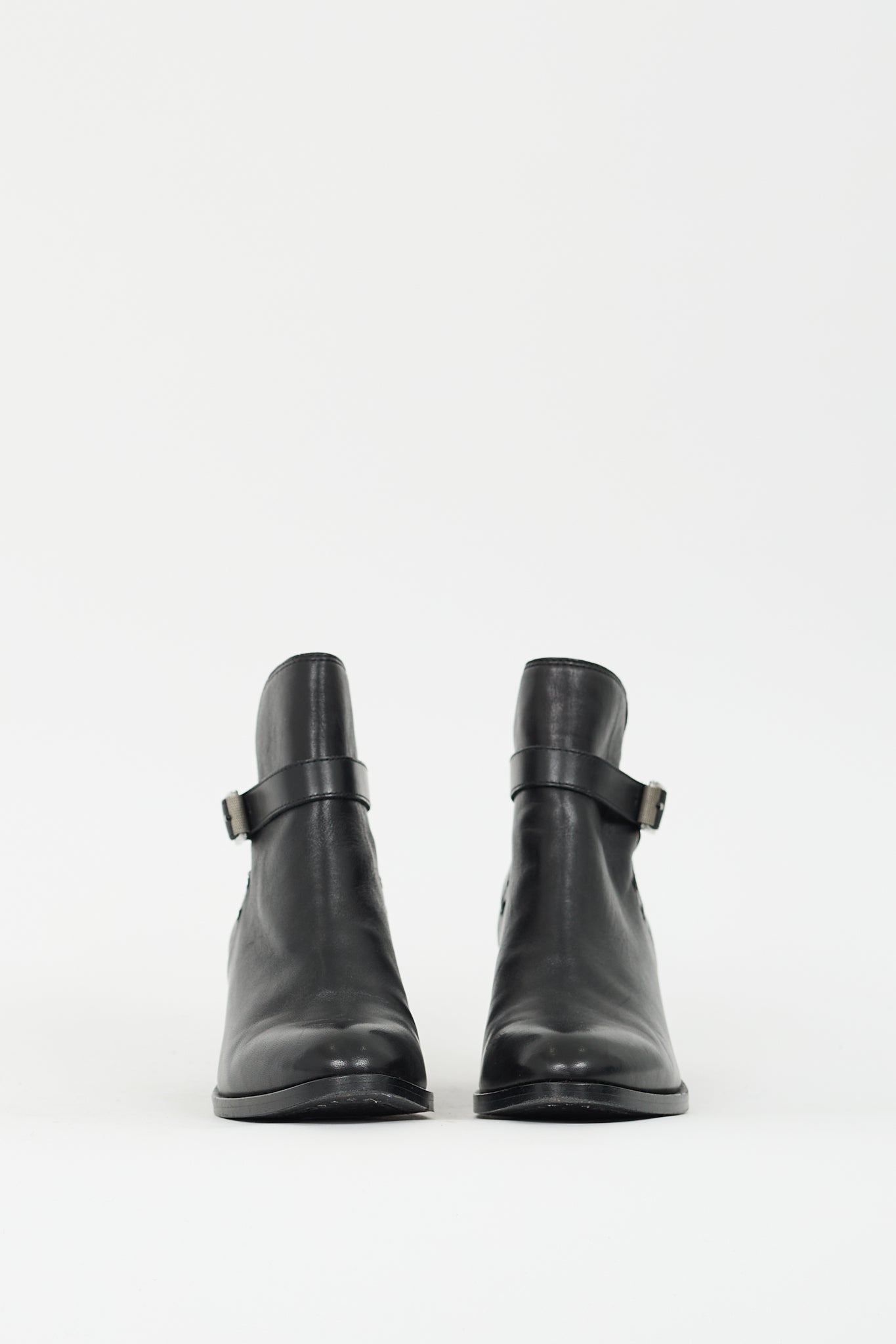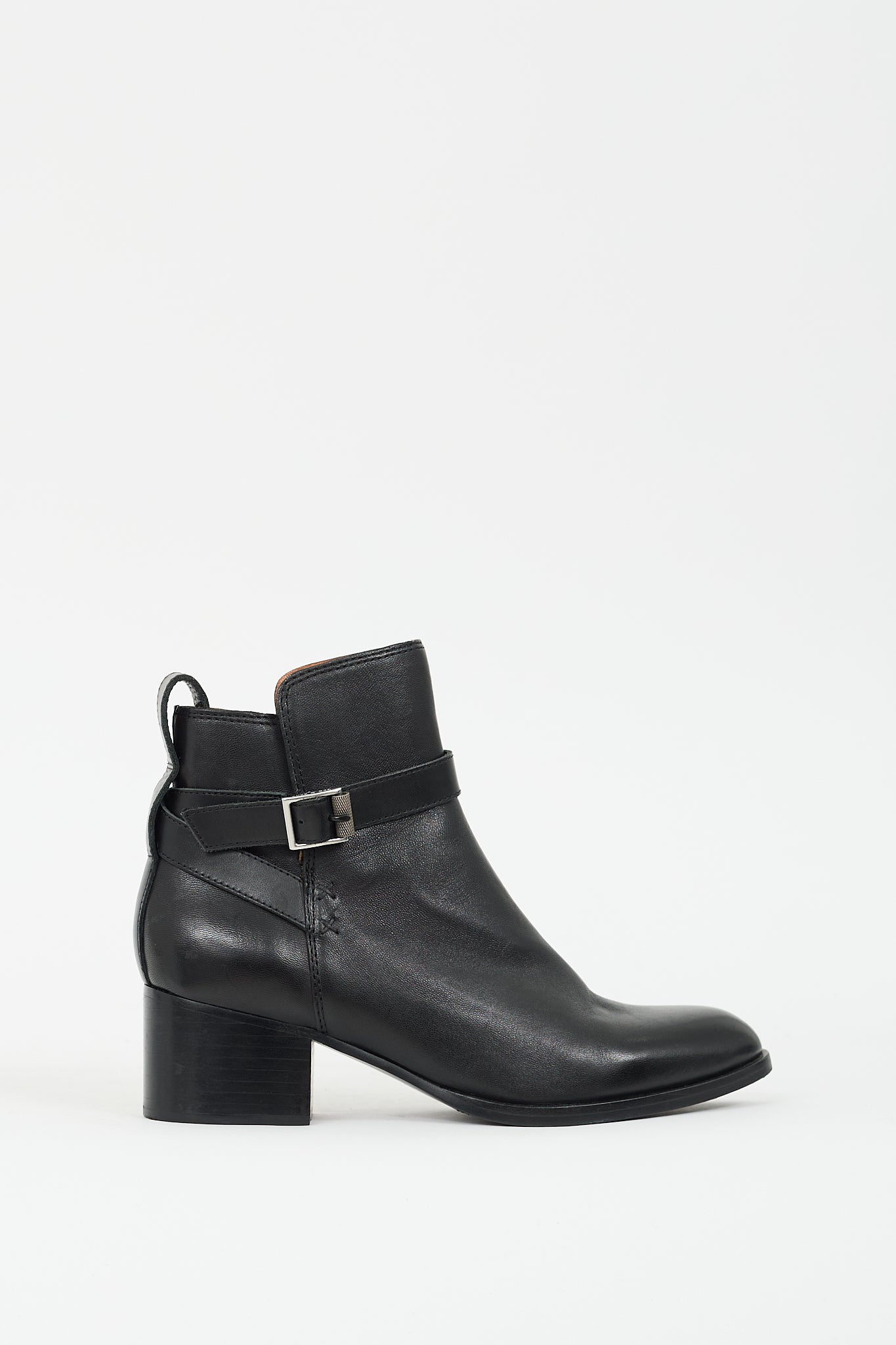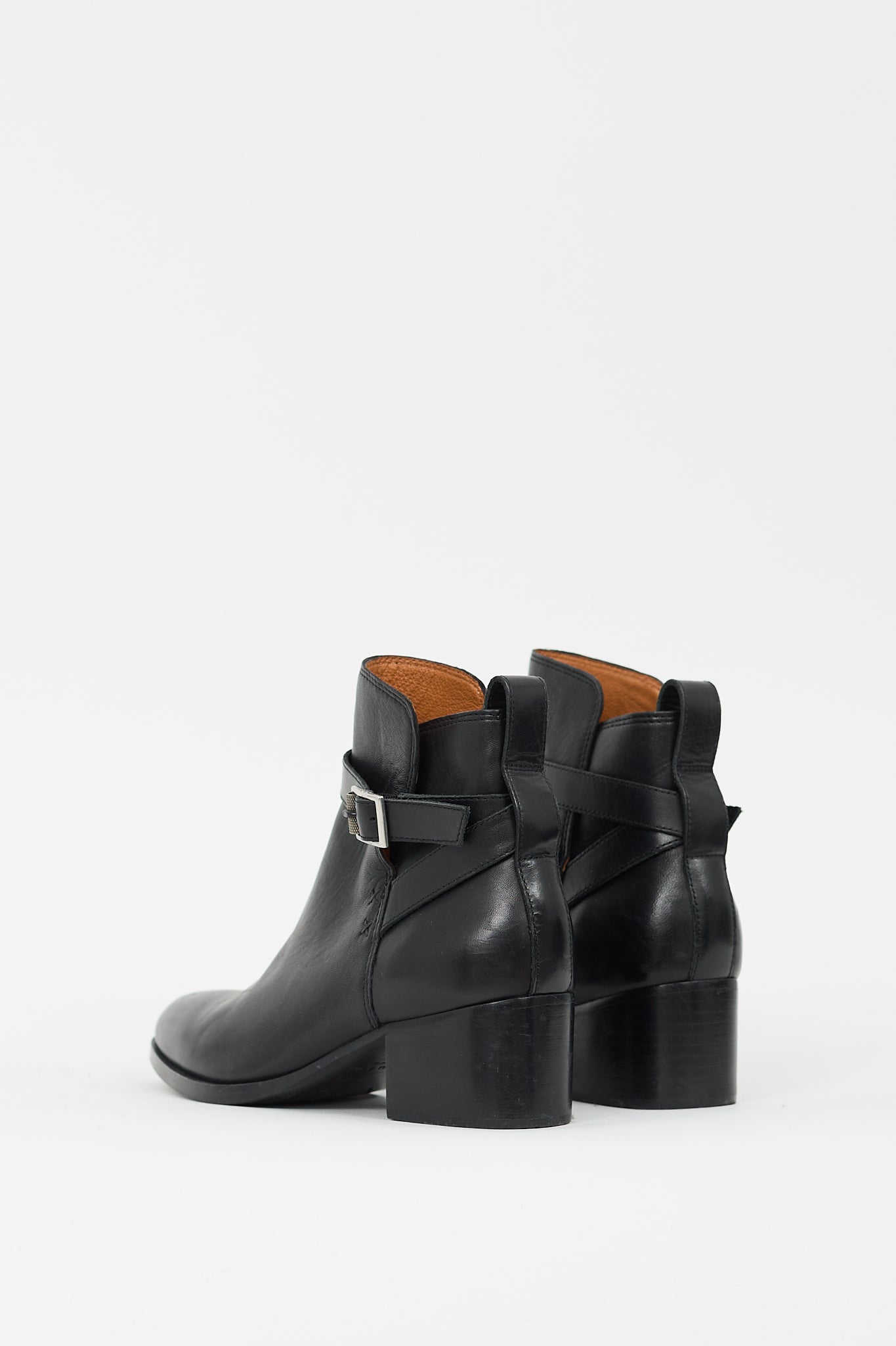 Pre-owned Rag & Bone black leather boots featuring pointed toe, notched sides, wraparound ankle strap with buckle fastening, pull tab at back, and stacked block heel.